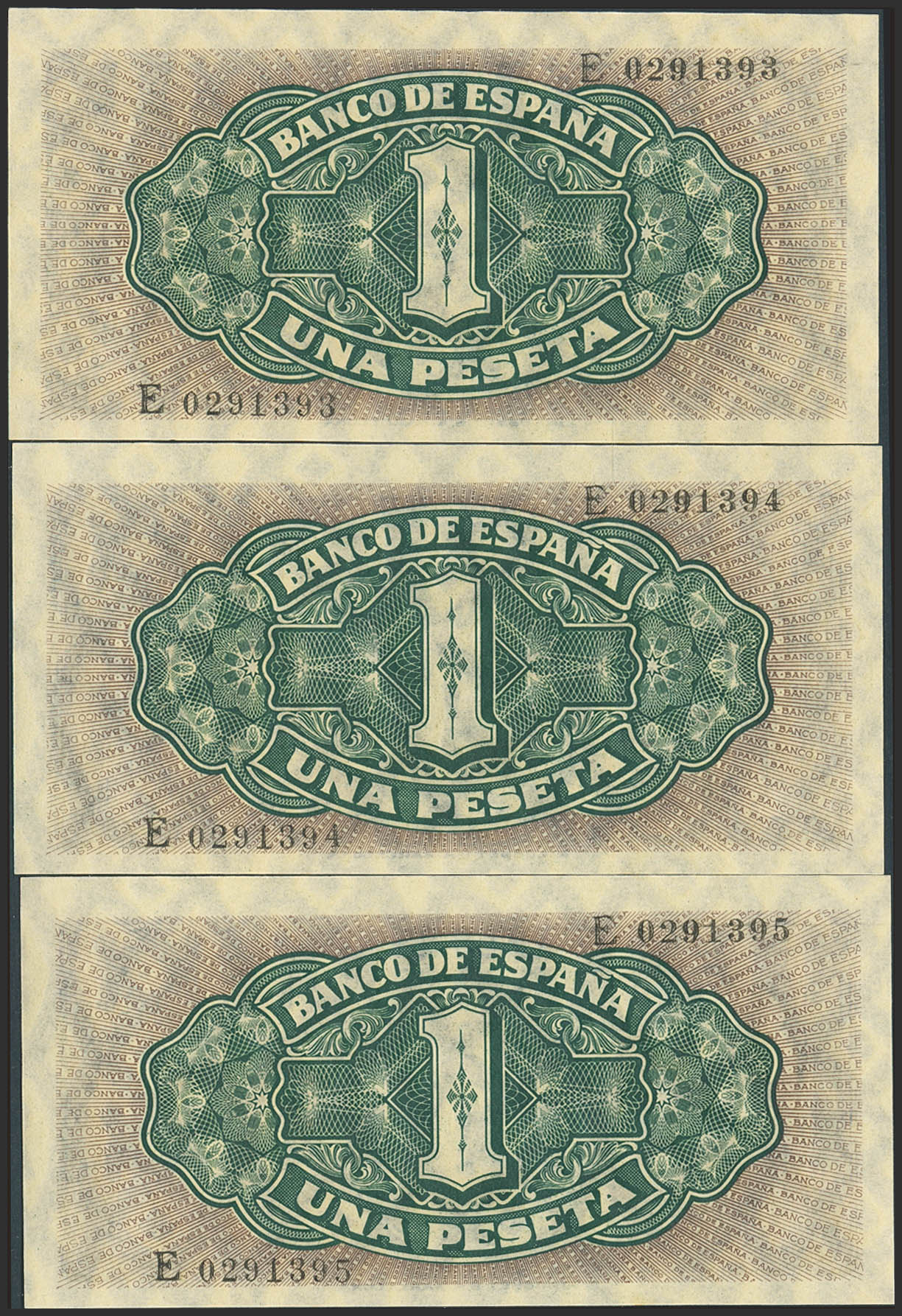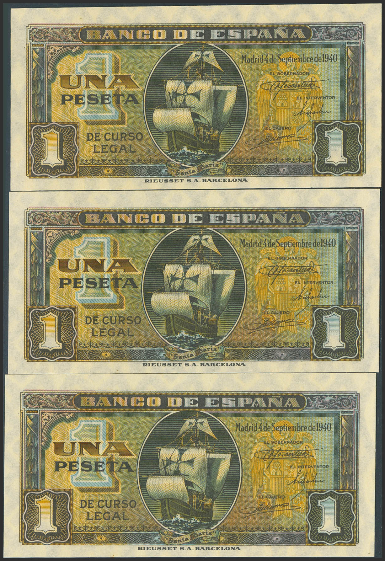 1 Peseta. 4 de Septiembre de 1940. Trío correlativo. Serie E. (Edifil 2023: 442a). Apresto original. SC-.