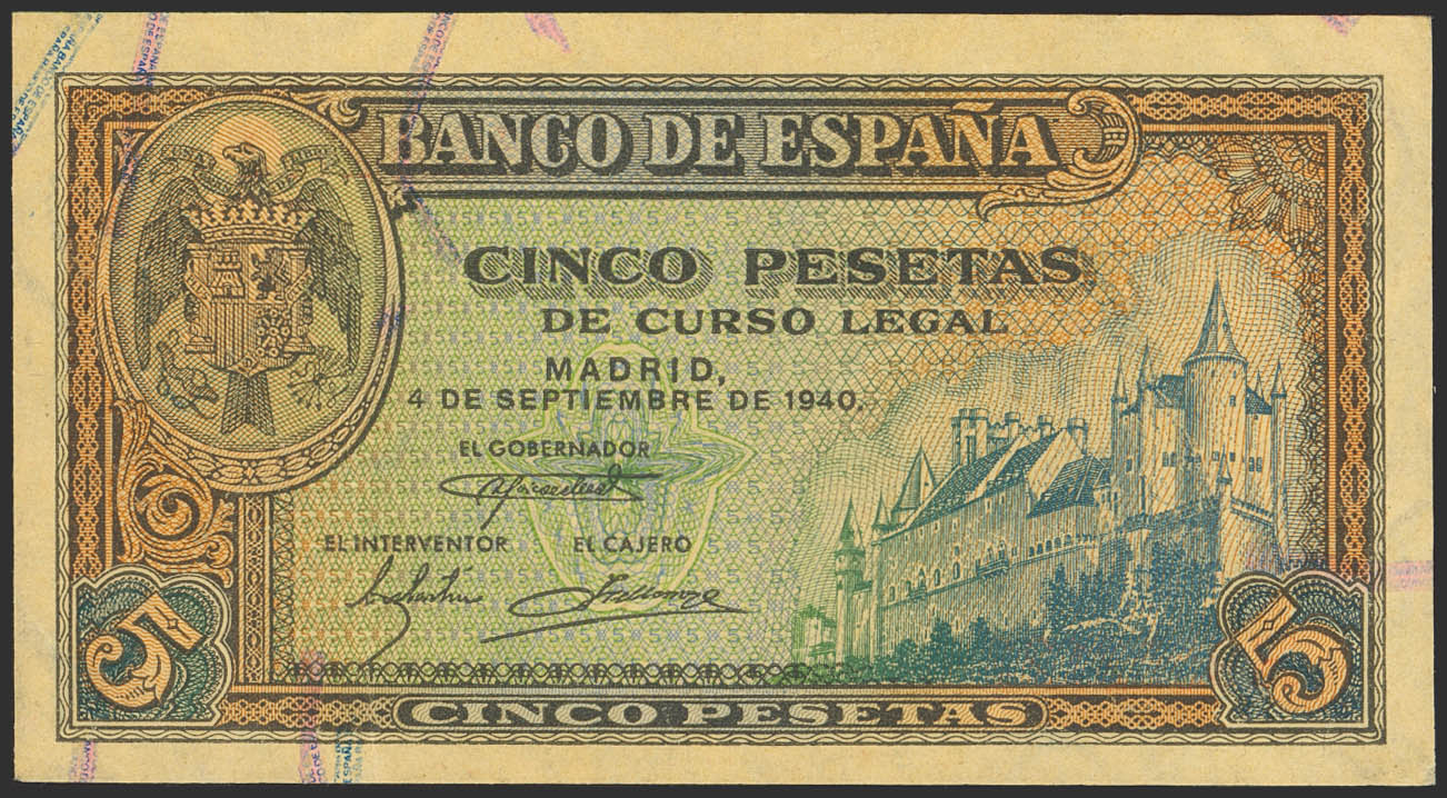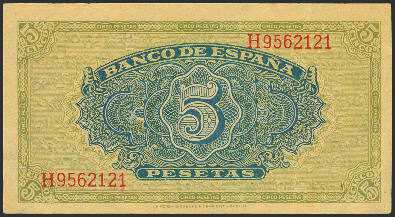 5 Pesetas. 4 de Septiembre de 1940. Serie H. (Edifil 2023: 443a). Conserva parte de su apresto original. EBC+.