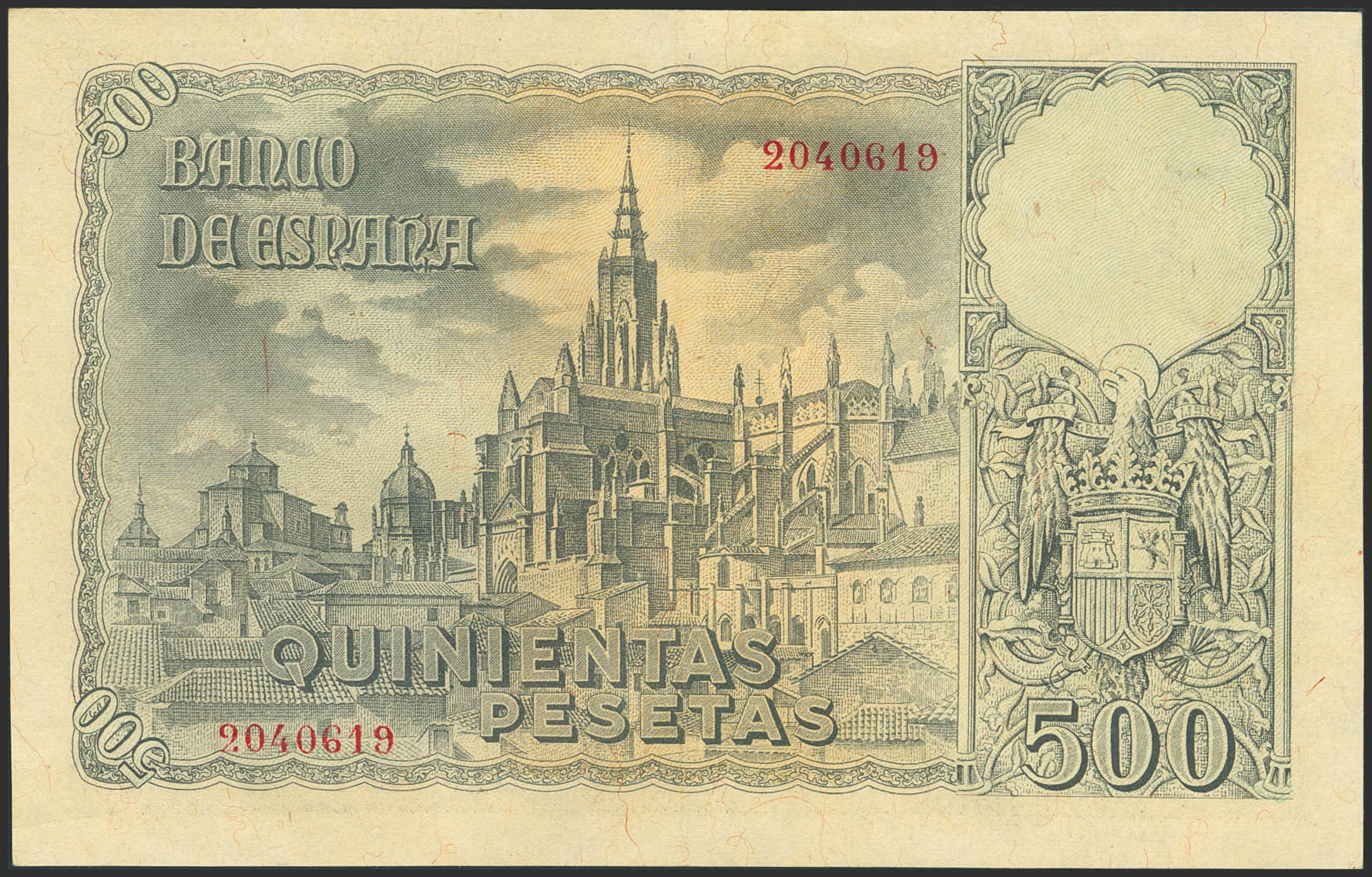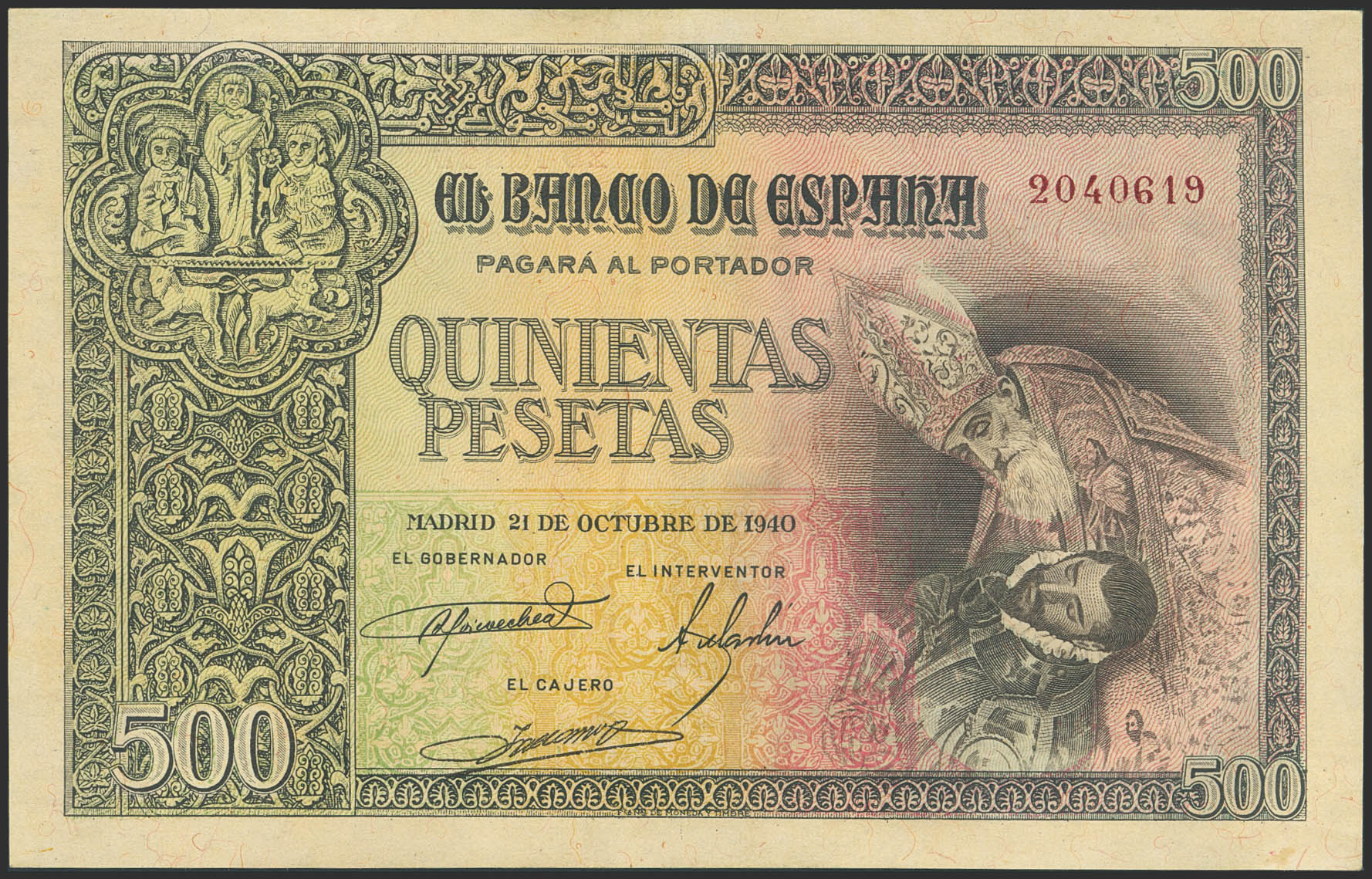 500 Pesetas. 21 de Octubre de 1940. Sin serie. (Edifil 2023: 444). Inusual en esta calidad, apresto original, billete de gran presencia con la viñeta conservando gran parte de su frescor. EBC.