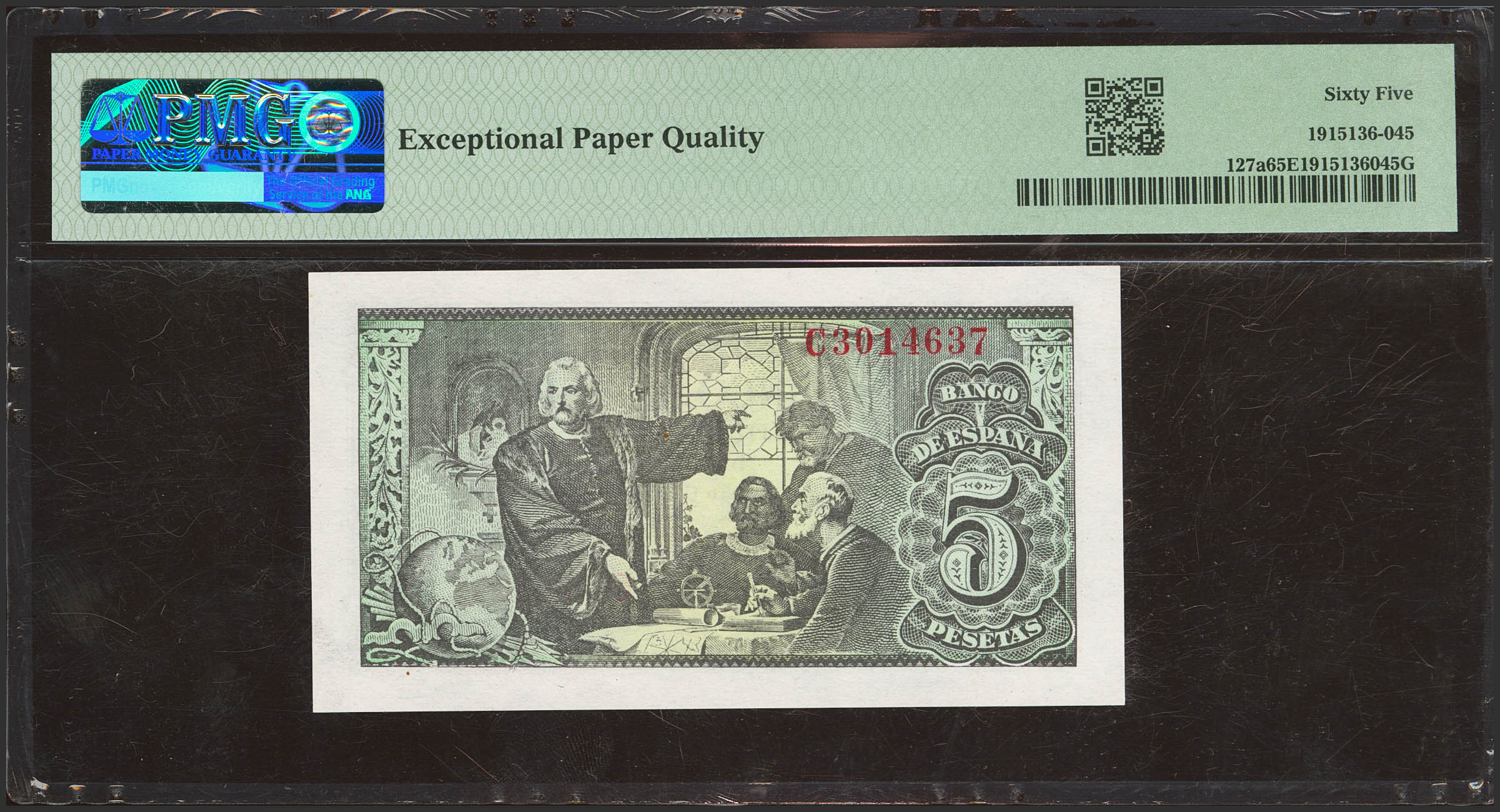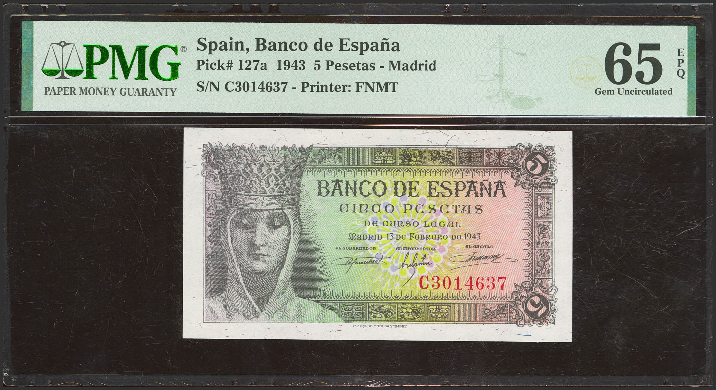 5 Pesetas. 13 de Febrero de 1943. Serie C. (Edifil 2023: 446a, Pick: 127a). Apresto original. SC. Encapsulado PMG65EPQ.