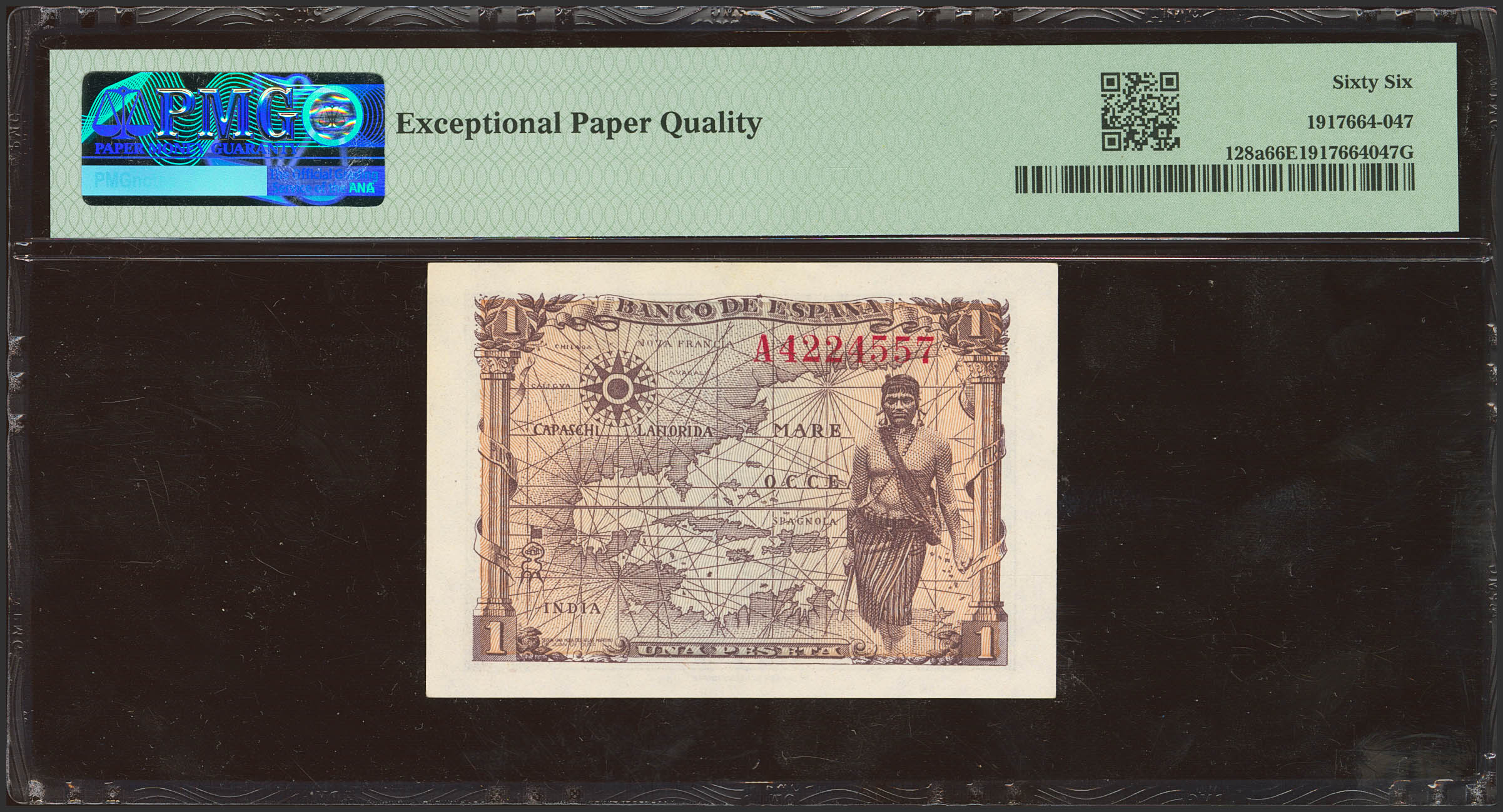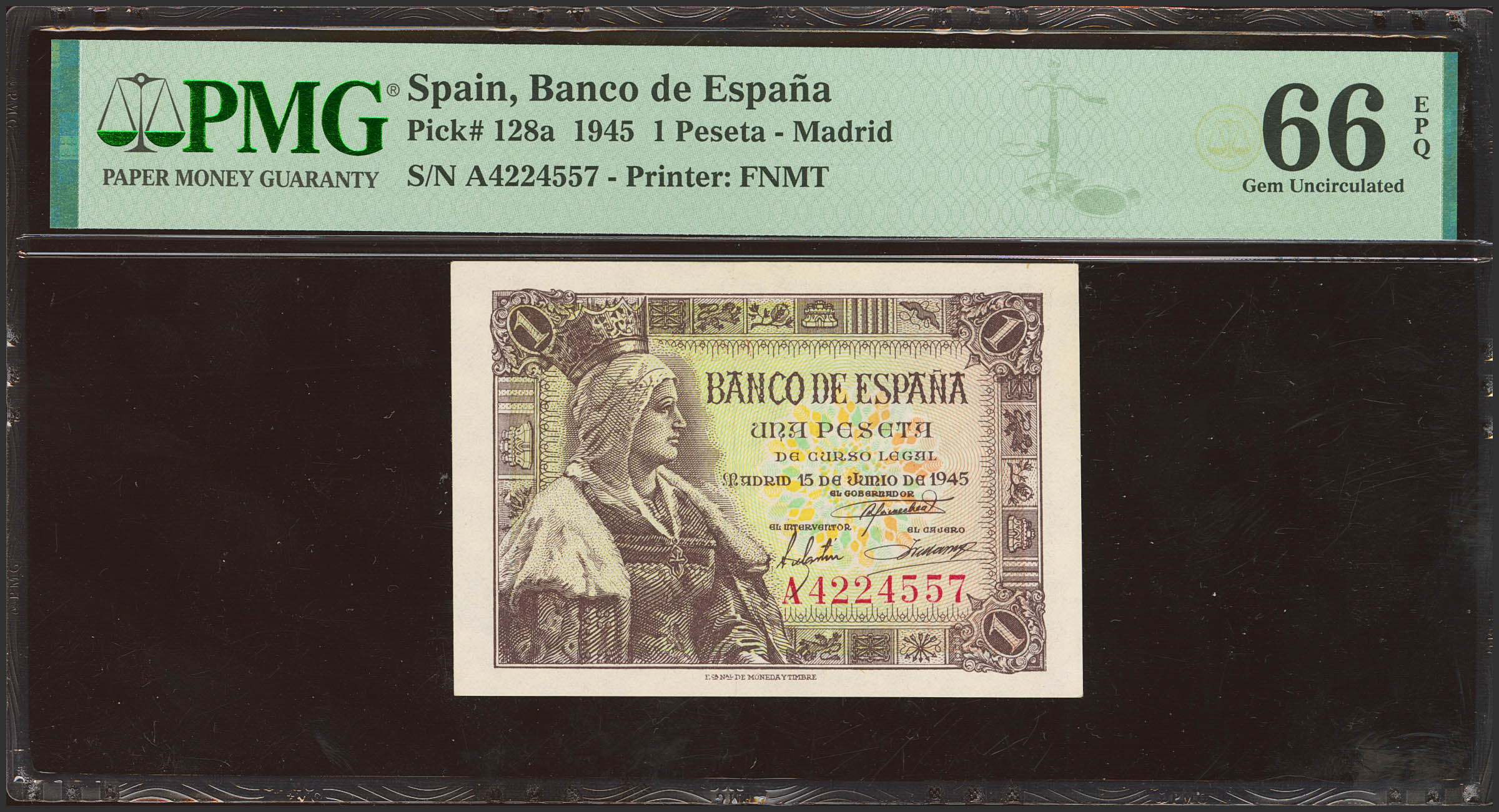 1 Peseta. 15 de Junio de 1945. Serie A. (Edifil 2023: 448a, Pick: 128a). Apresto original. SC. Encapsulado PMG66EPQ.