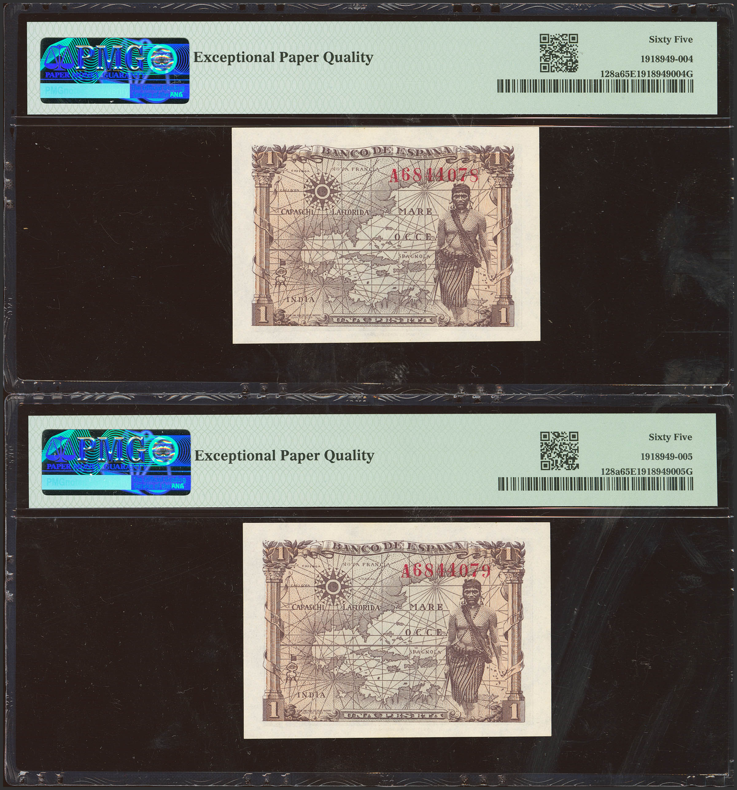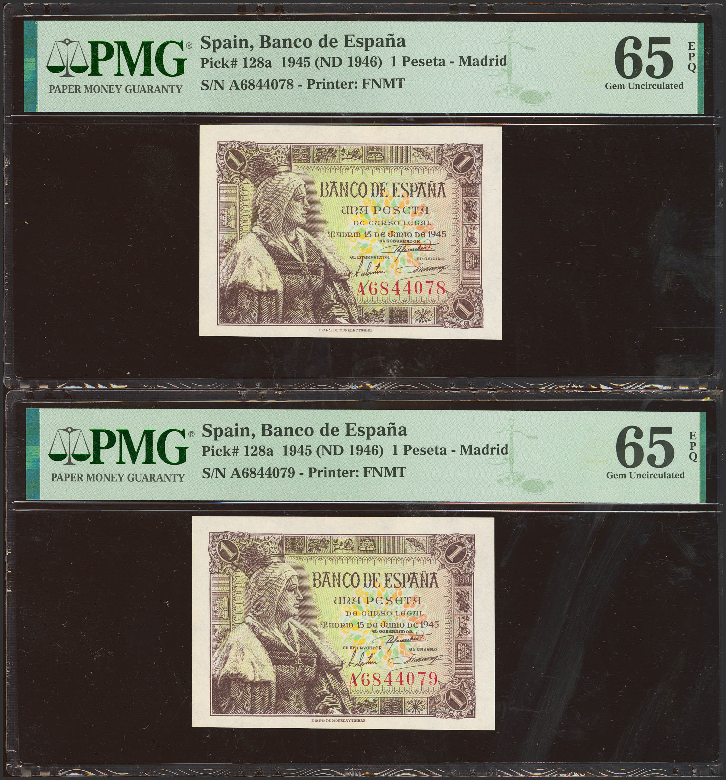 1 Peseta. 15 de Junio de 1945. Pareja correlativa. Serie A. (Edifil 2023: 448a). Apresto original. SC. Encapsulados PMG65EPQ, ambos.