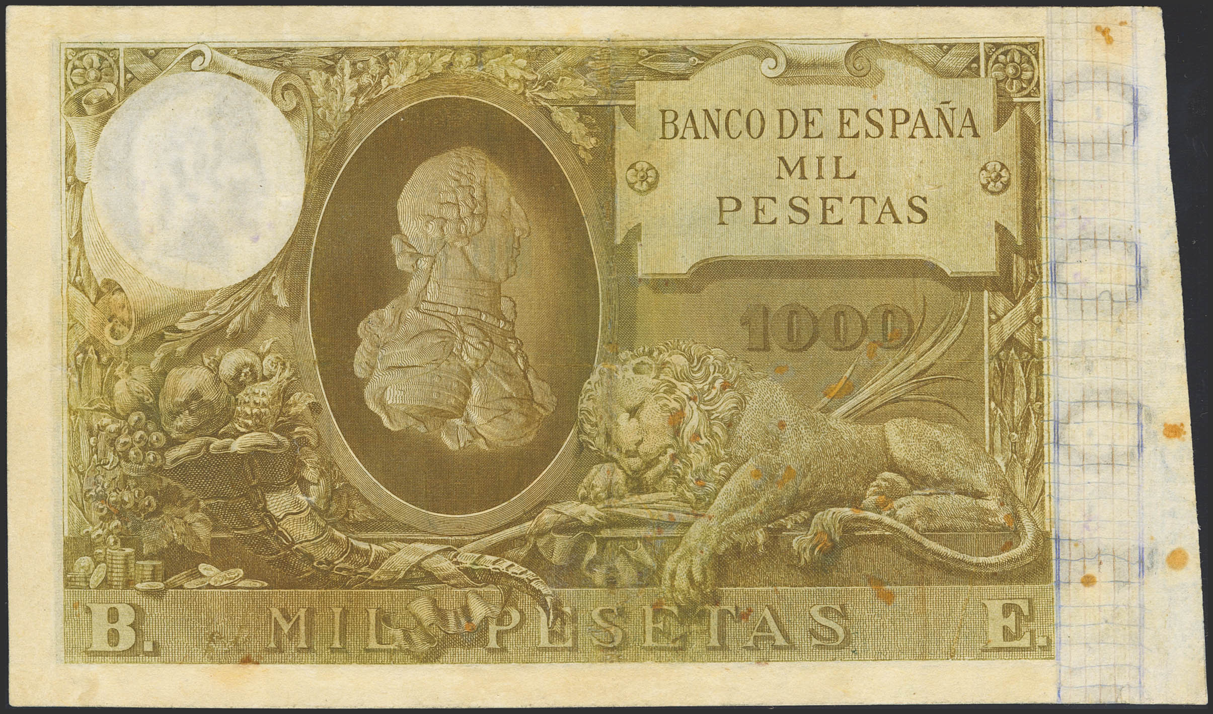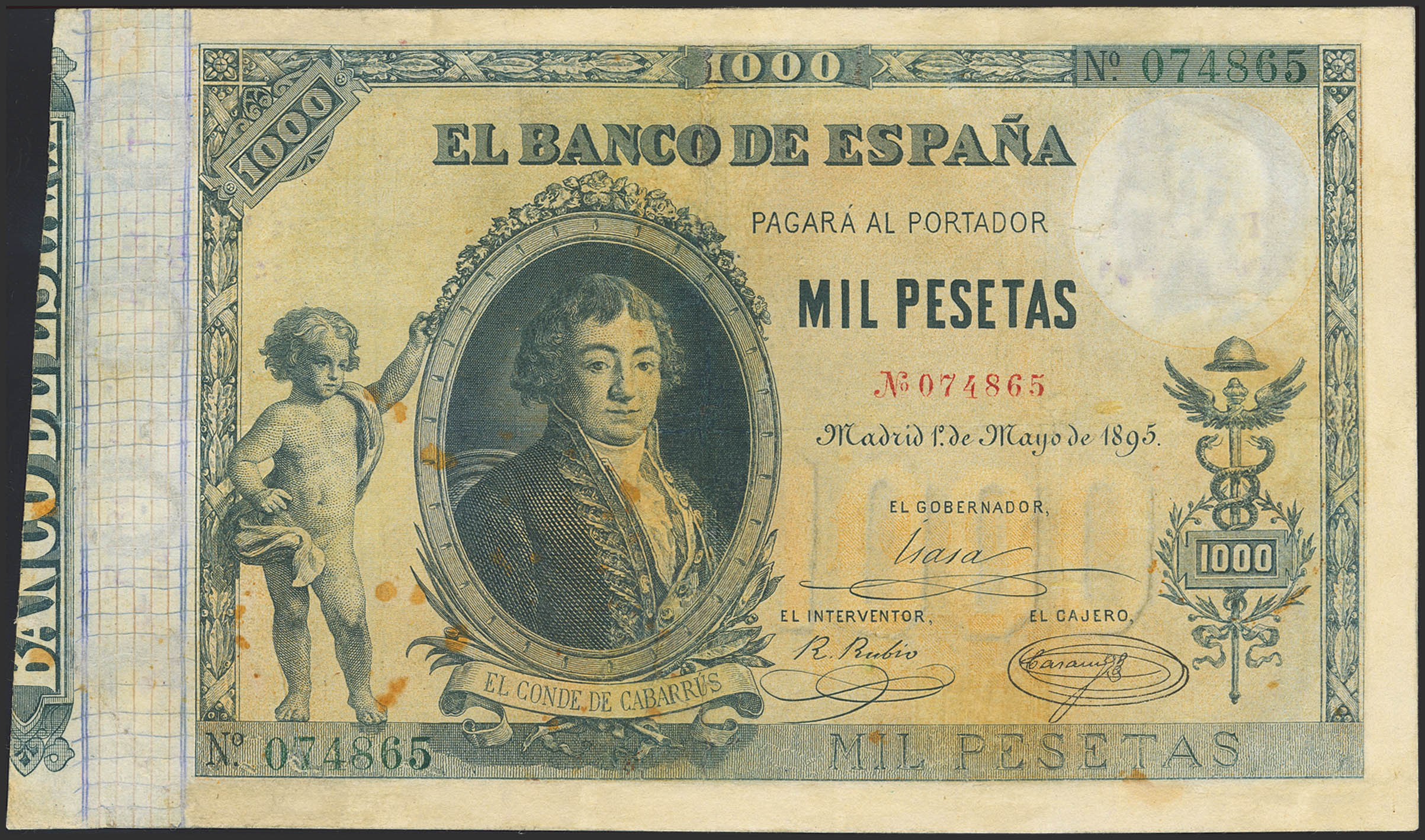 1000 Pesetas. 1 de Mayo de 1895. Sin serie. (Edifil 2023: 303, Pick: 45). Muy raro y espectacular billete, mínimamente reparado. MBC.
