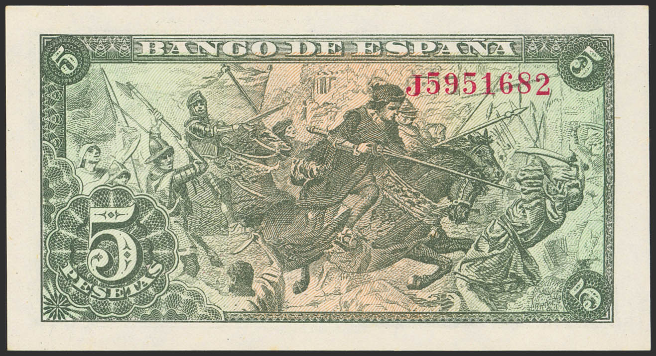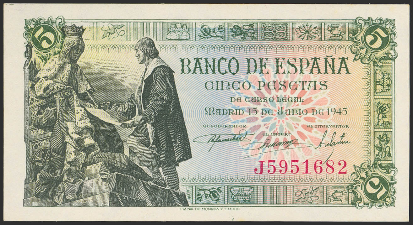 5 Pesetas. 15 de Junio de 1945. Serie J. (Edifil 2023: 449a). Apresto orignal. SC.