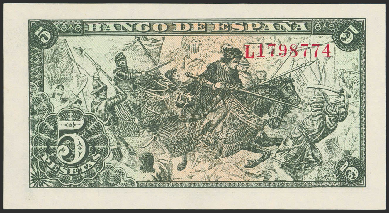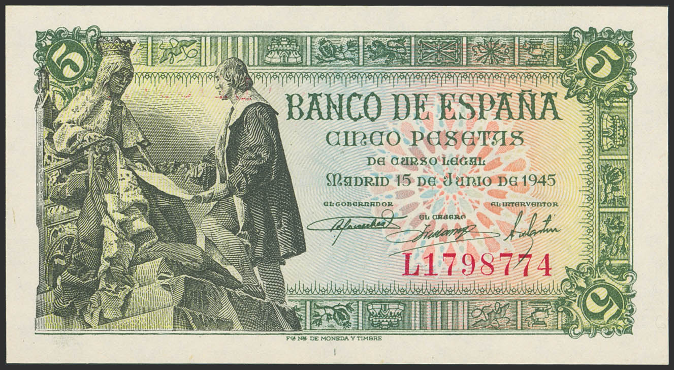 5 Pesetas. 15 de Junio de 1945. Serie L, última serie emitida. (Edifil 2021: 449a). Raro, apresto original. SC-.