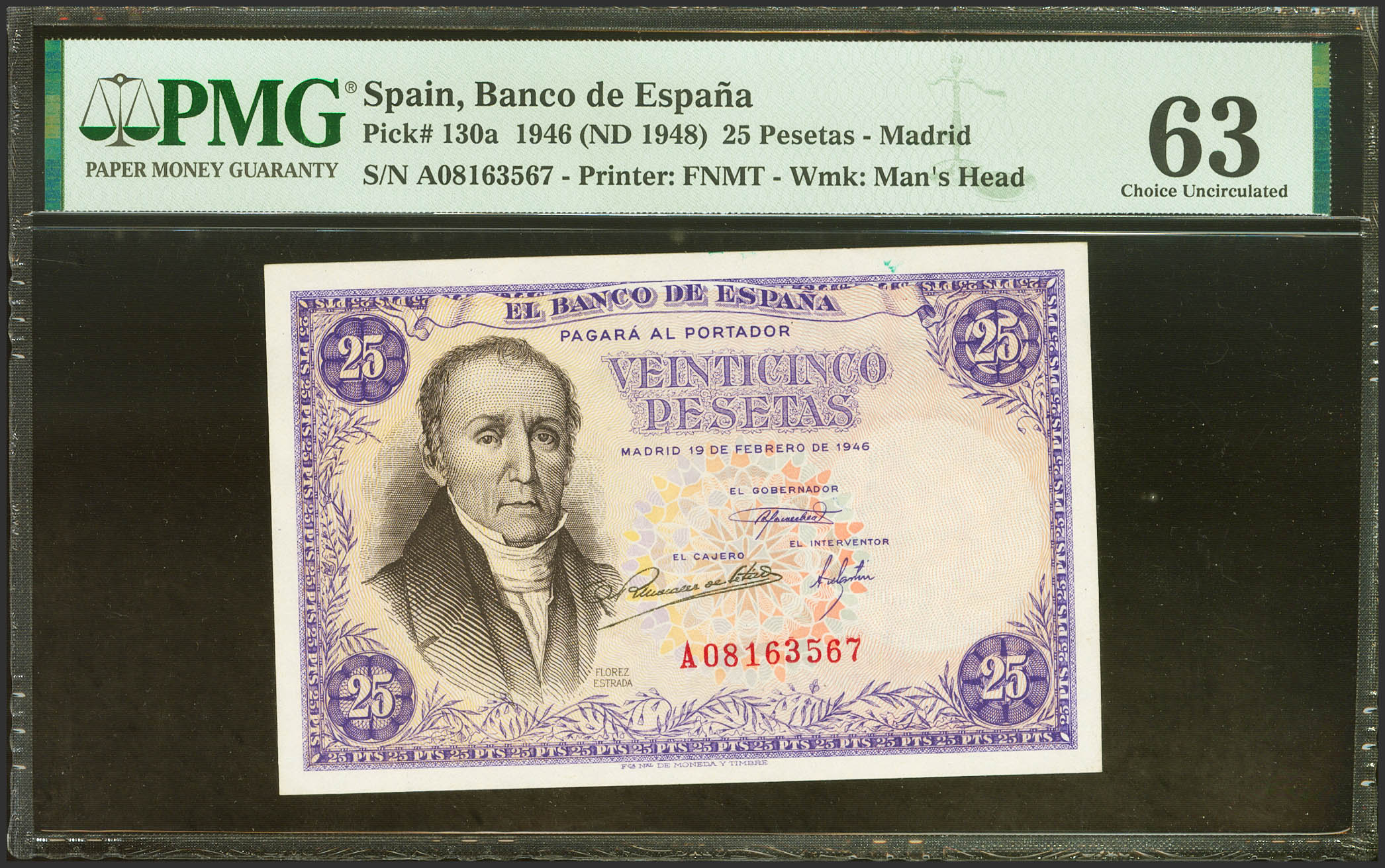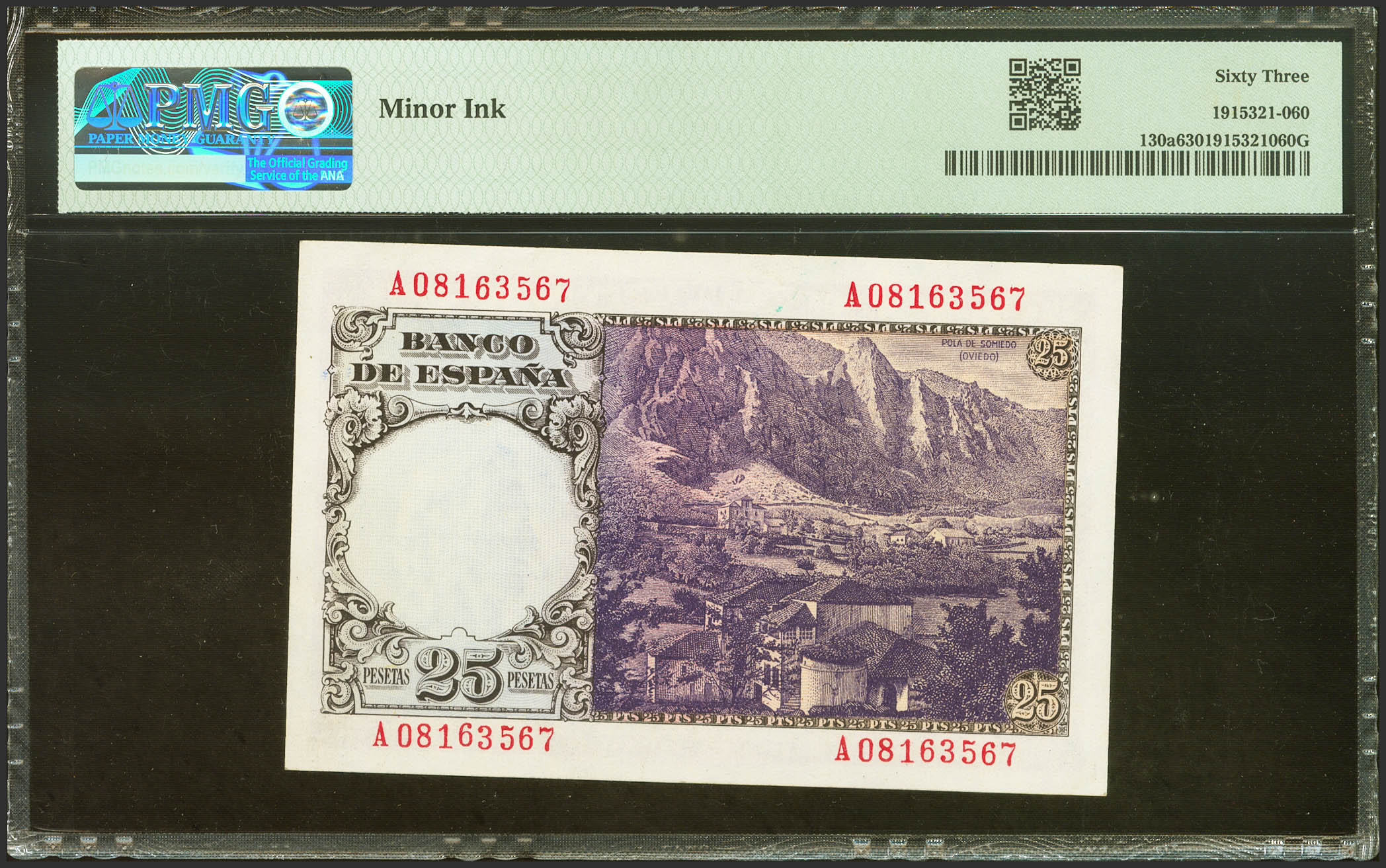 25 Pesetas. 19 de Febrero de 1946. Serie A. (Edifil 2023: 450a, Pick: 130a). SC. Encapsulado PMG63 (minor ink).