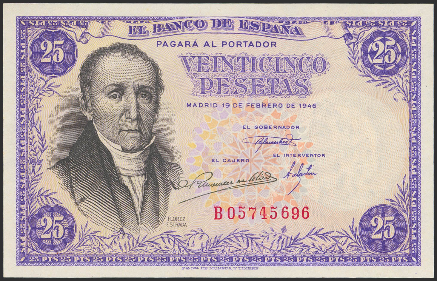 25 Pesetas. 19 de Febrero de 1946. Serie B. (Edifil 2023: 450a). Apresto original. SC.