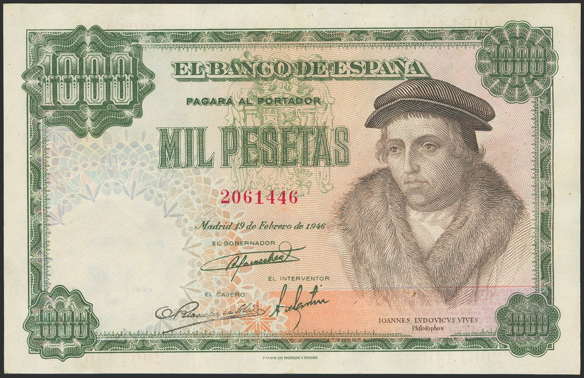 1000 Pesetas. 19 de Febrero de 1946. Sin serie. (Edifil 2023: 453). Billete de gran presencia. EBC.