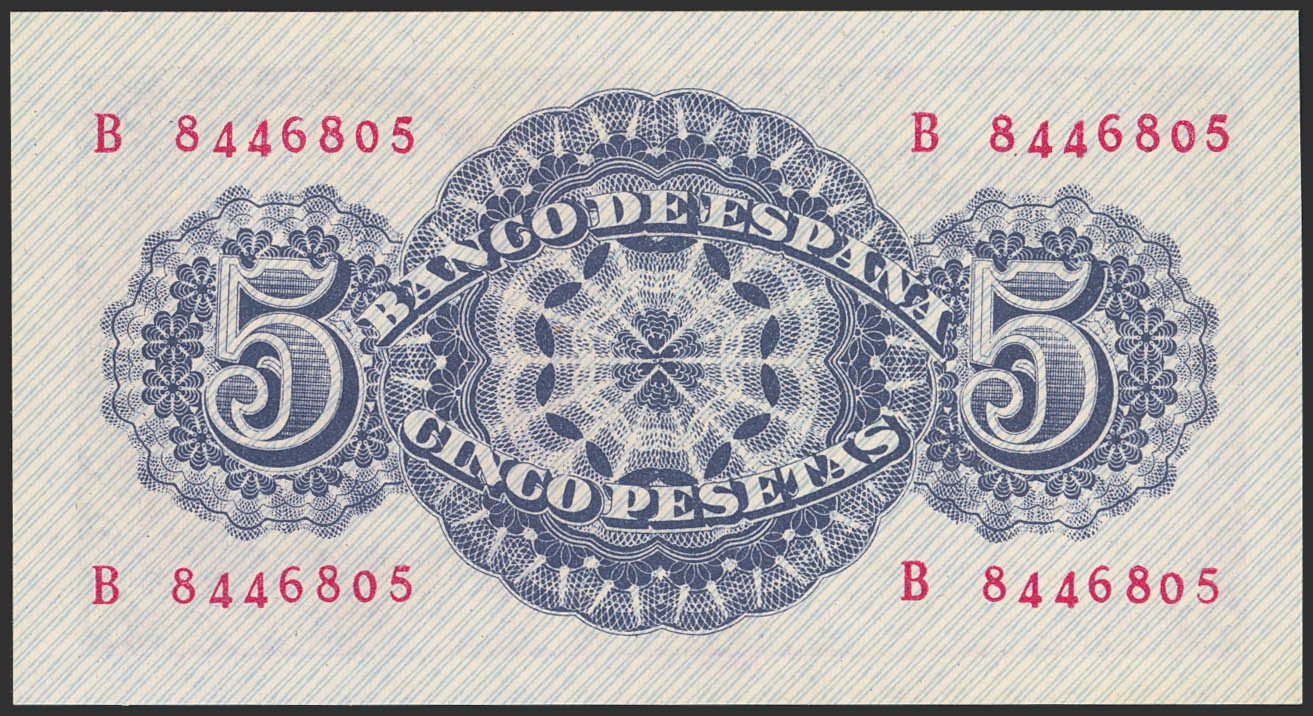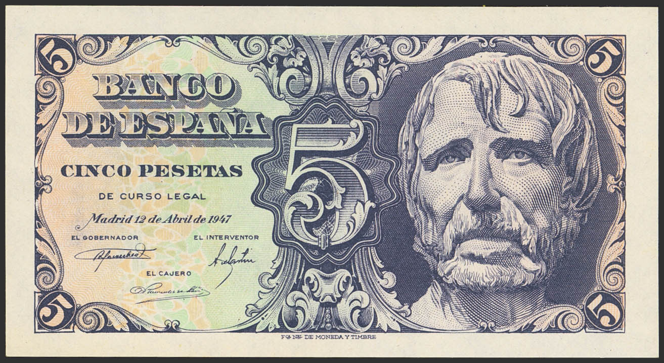 5 Pesetas. 12 de Abril de 1947. Serie B. (Edifil 2023: 454a). Conserva parte del apresto original. SC.