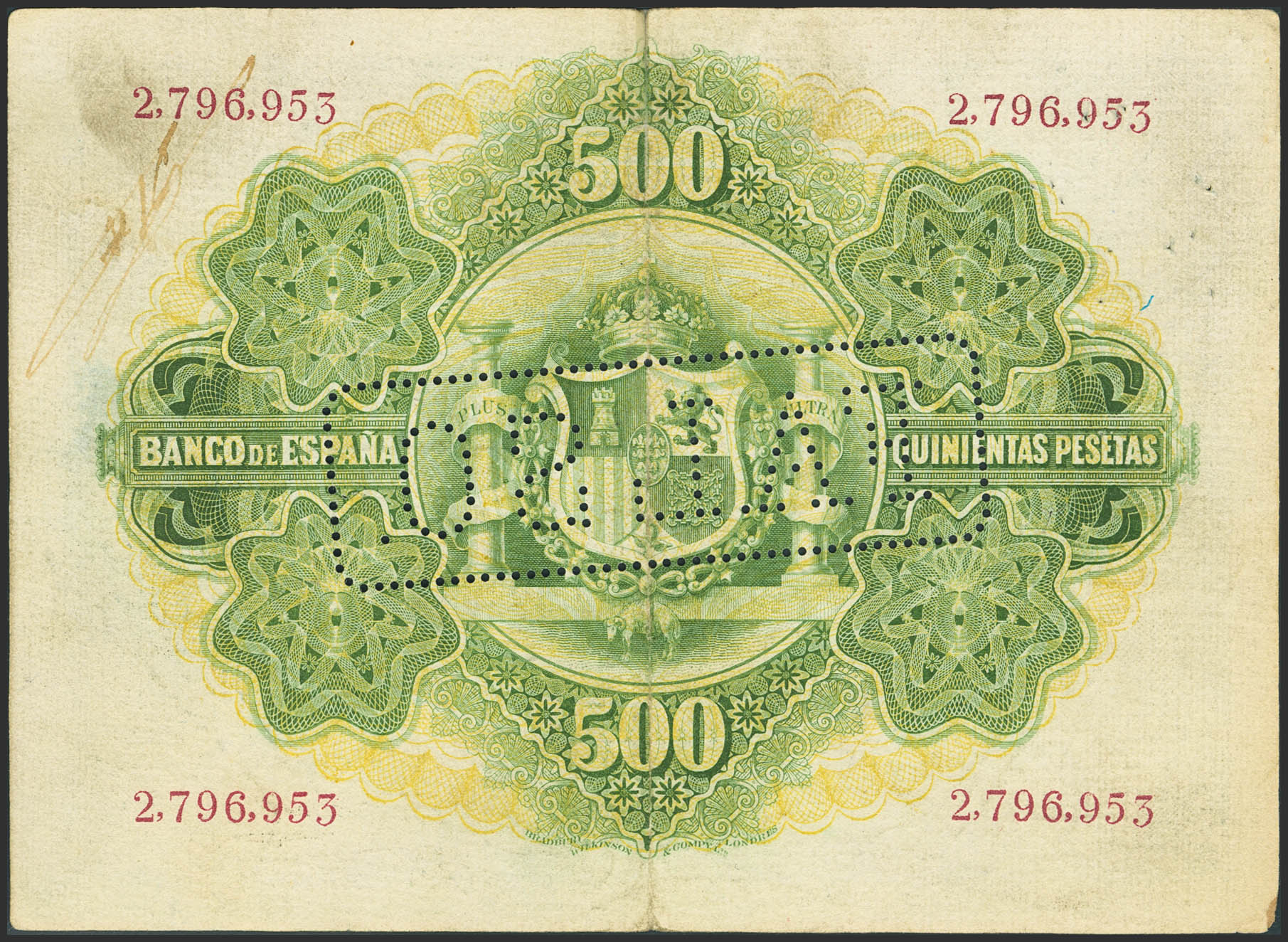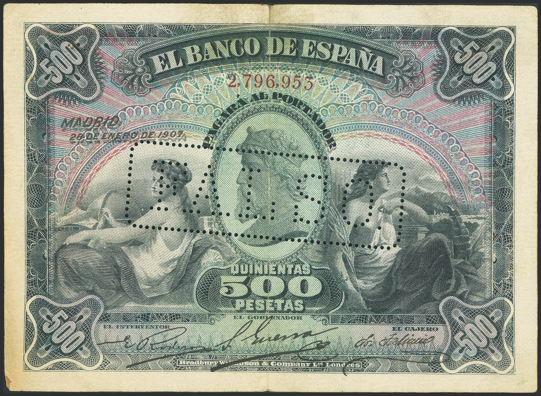 500 Pesetas. 28 de Enero de 1907. Falso de época. Sin serie y perforado FALSO. (Edifil 2023: 316F). MBC+.