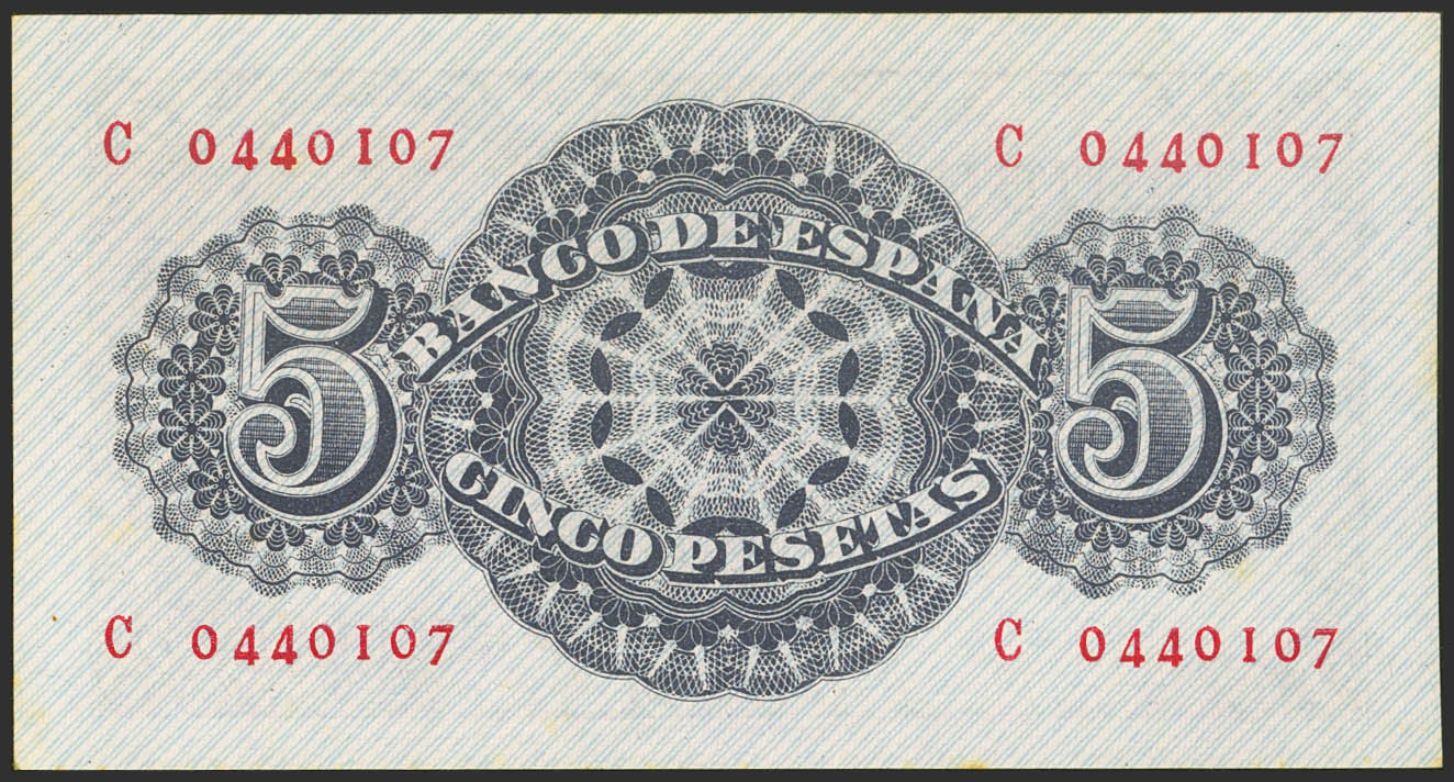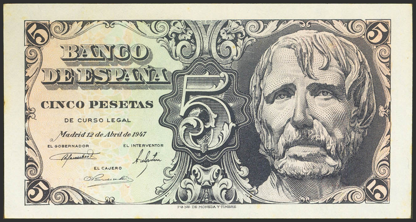 5 Pesetas. 12 de Abril de 1947. Serie C. (Edifil 2021: 454a). Conserva parte del apresto original y manchitas del tiempo. SC-.
