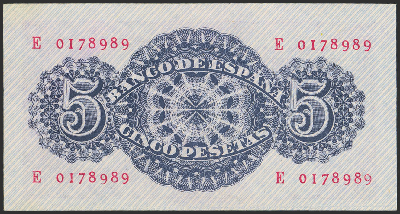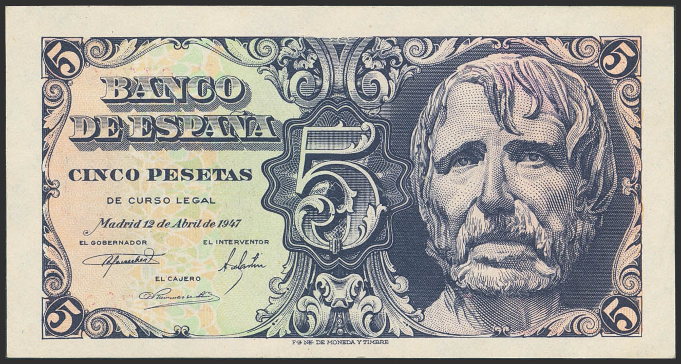 5 Pesetas. 12 de Abril de 1947. Serie E, última serie emitida. (Edifil 2023: 454b). Apresto original. SC--.