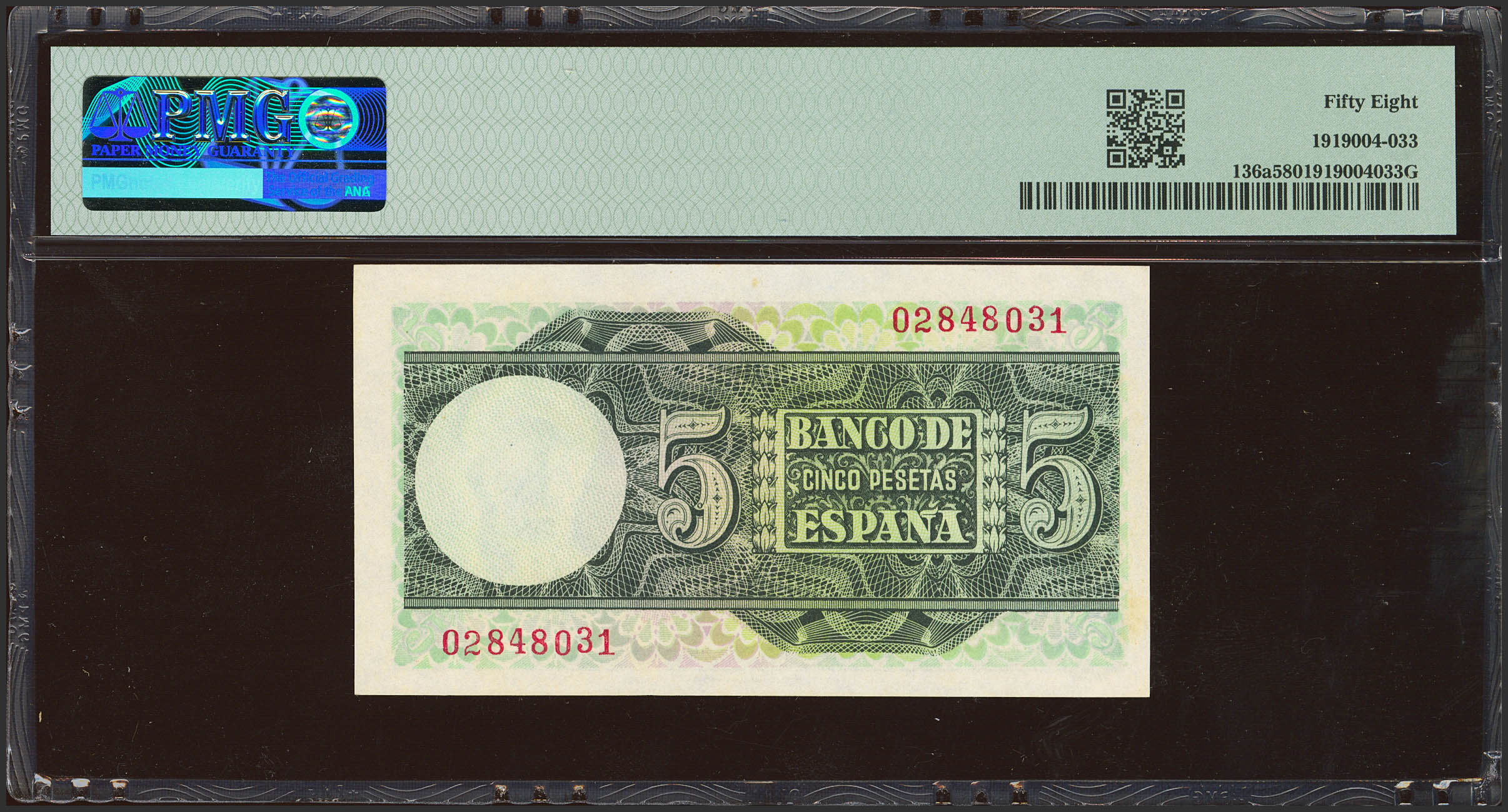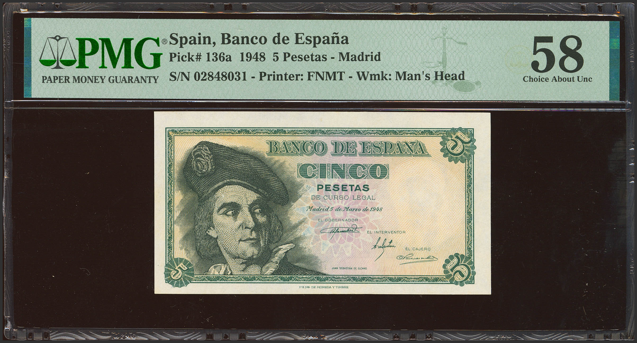 5 Pesetas. 5 de Marzo de 1948. Sin serie. (Edifil 2023: 455, Pick: 136a). EBC++. Encapsulado PMG58.