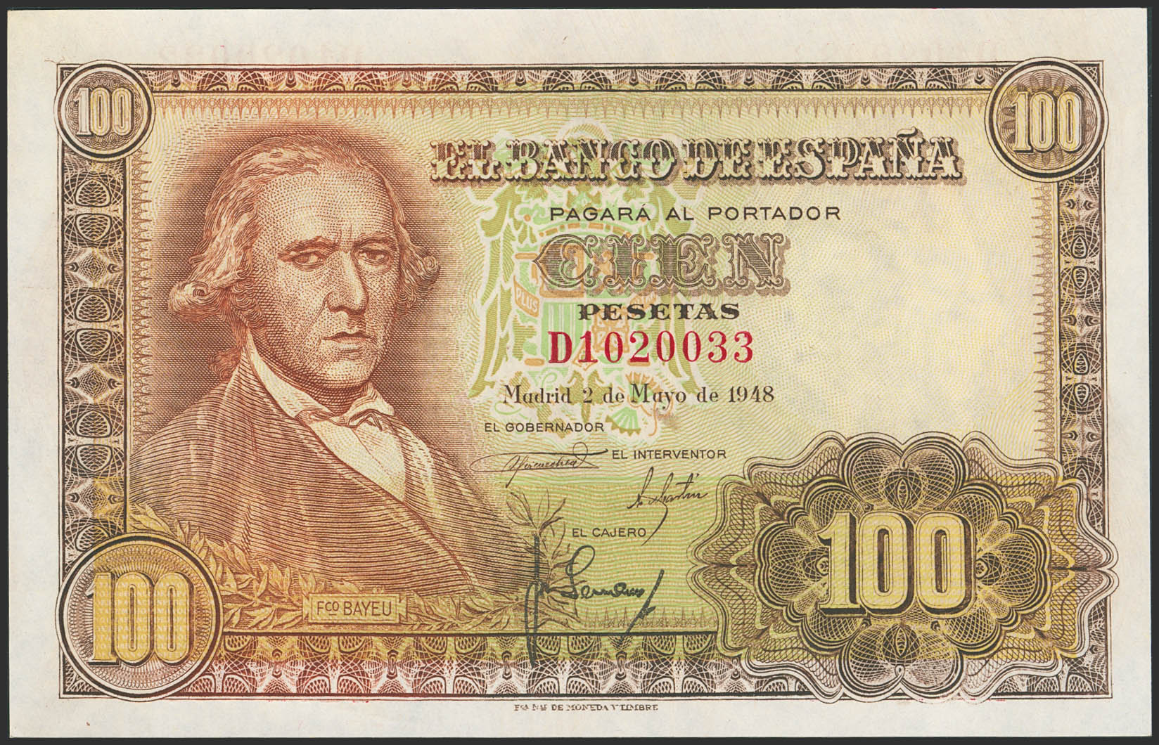 100 Pesetas. 2 de Mayo de 1948. Serie D. (Edifil 2023: 456a). Apresto original. SC.