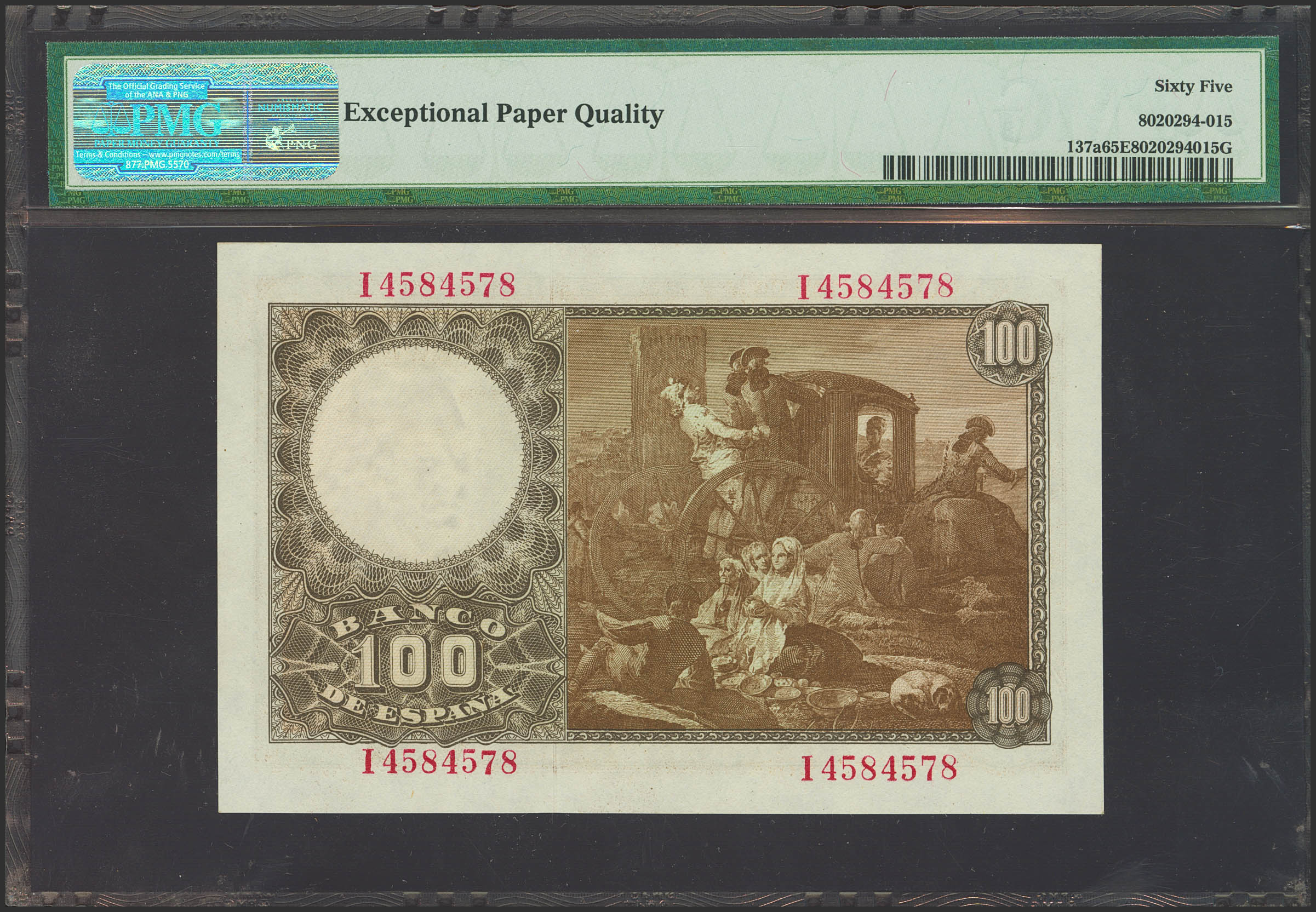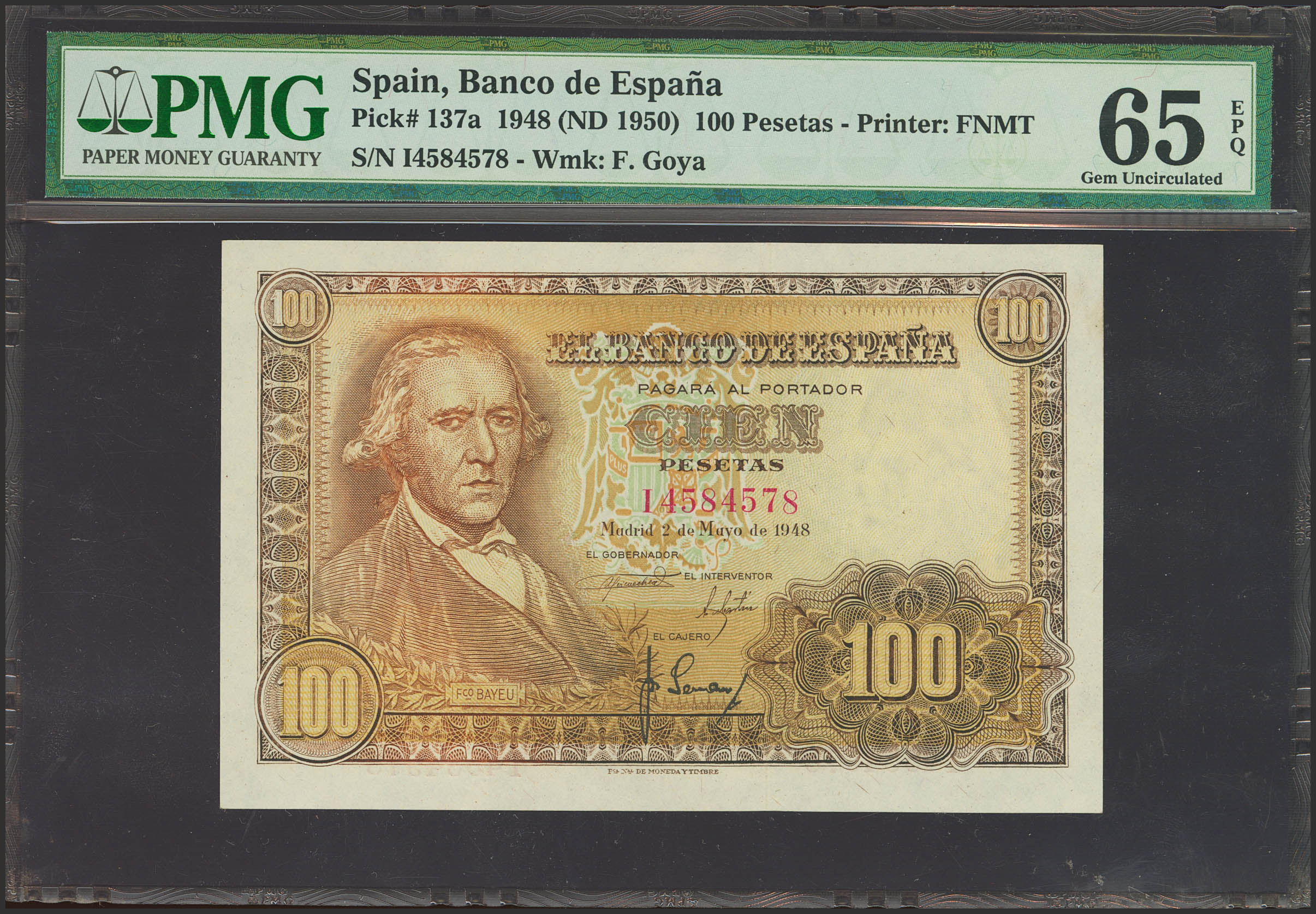 100 Pesetas. 2 de Mayo de 1948. Serie I, última serie emitida. (Edifil 2023: 456b, Pick: 137a). Raro en esta excepcional calidad, apresto original. SC. Encapsulado PMG65EPQ.