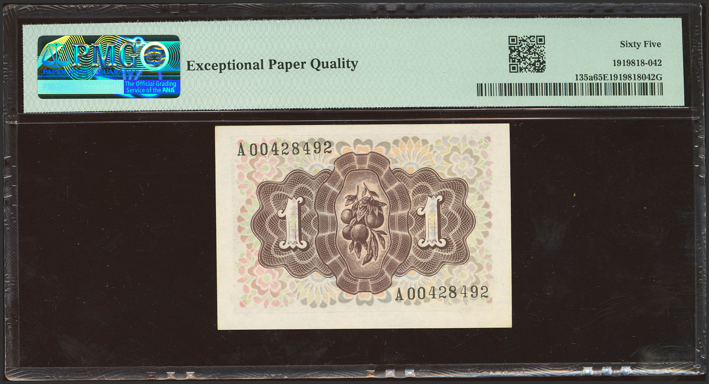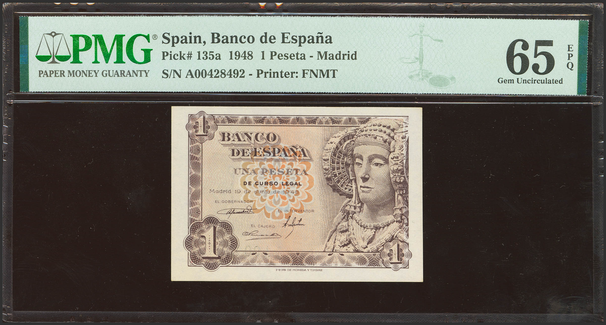 1 Peseta. 19 de Junio de 1948. Serie A. (Edifil 2023: 457a, Pick: 135a). Apresto original. SC. Encapsulado PMG65EPQ.