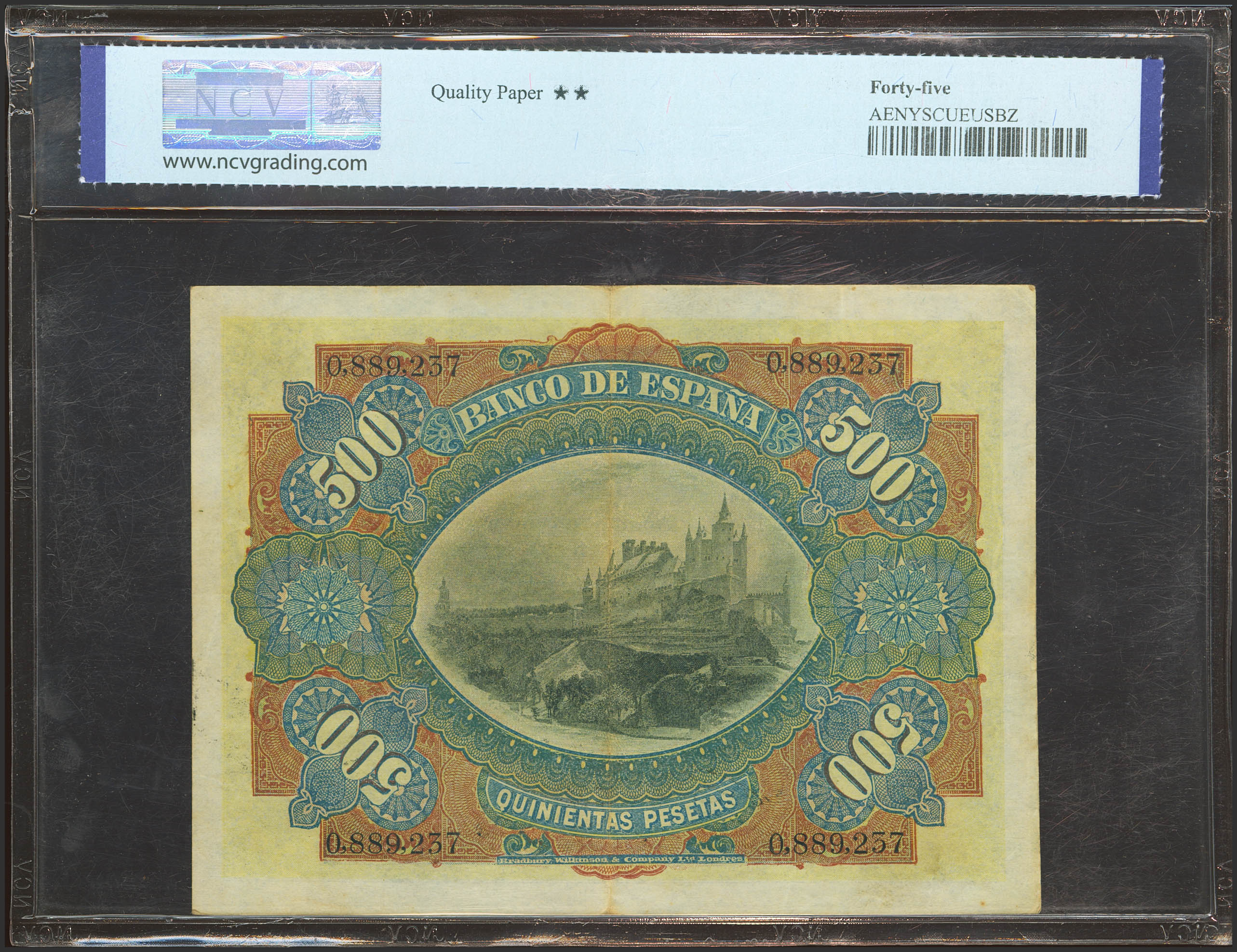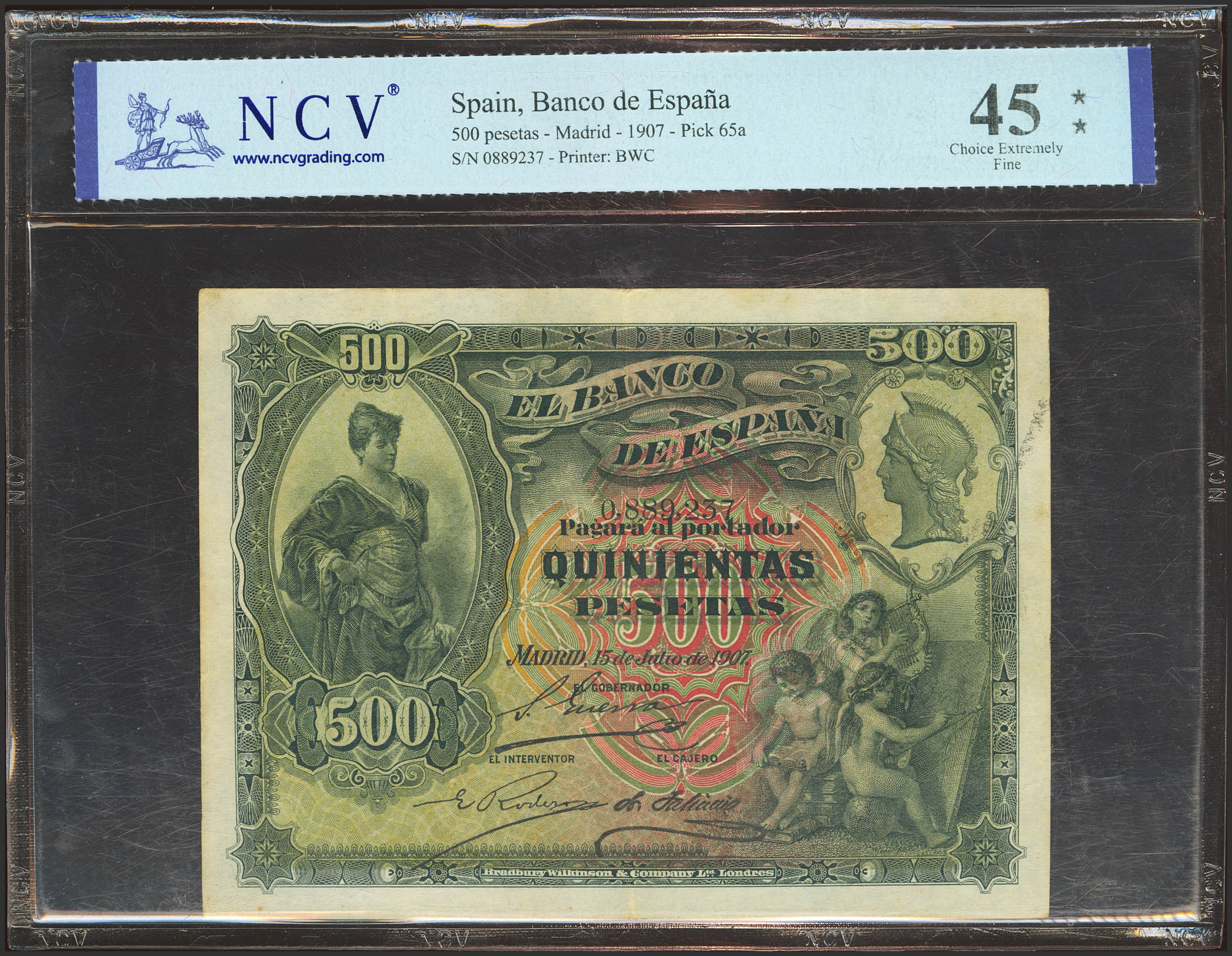 500 Pesetas. 15 de Julio de 1907. Sin serie. (Edifil 2023: 321, Pick: 65a). Raro. EBC-. Encapsulado NCV45.