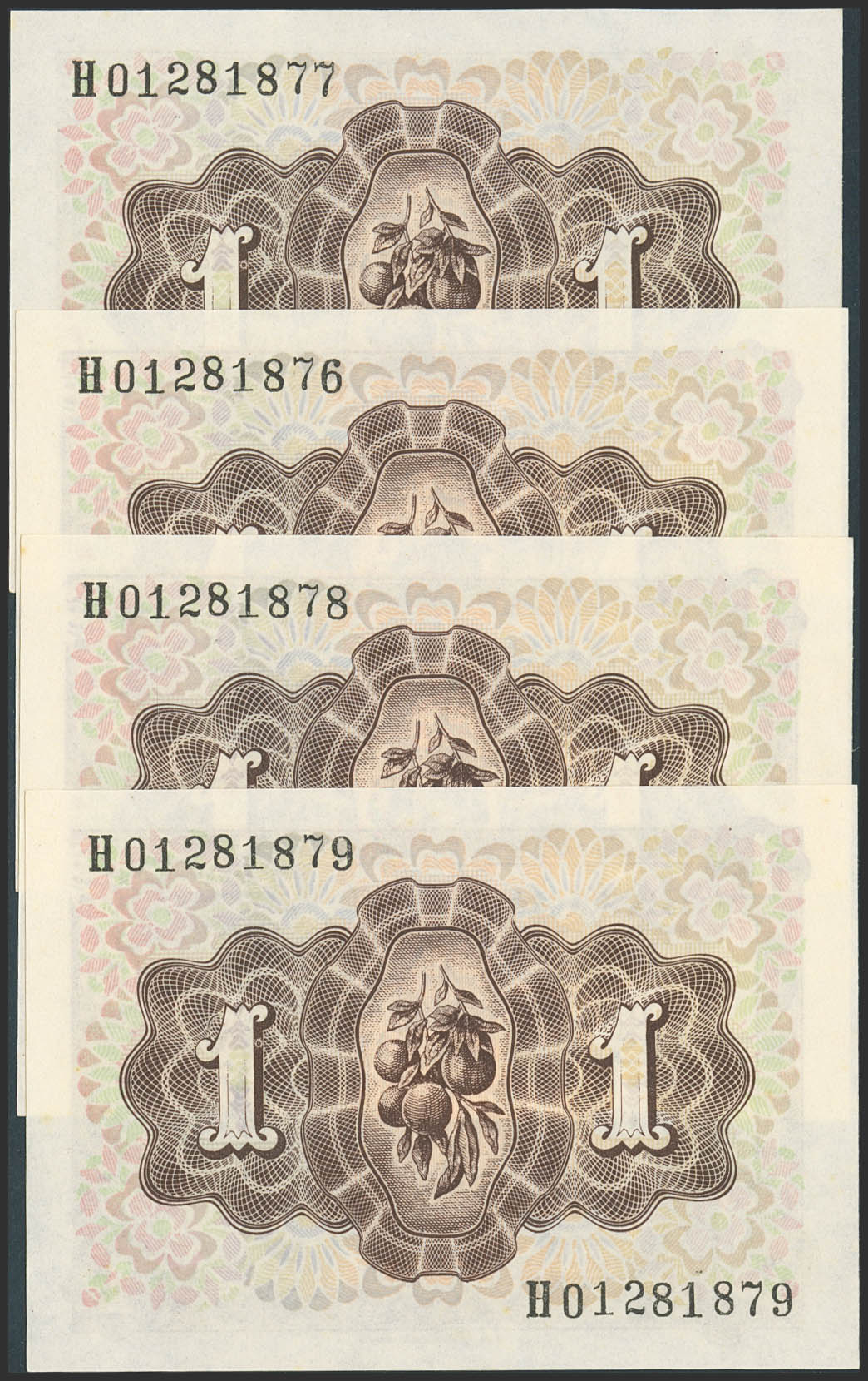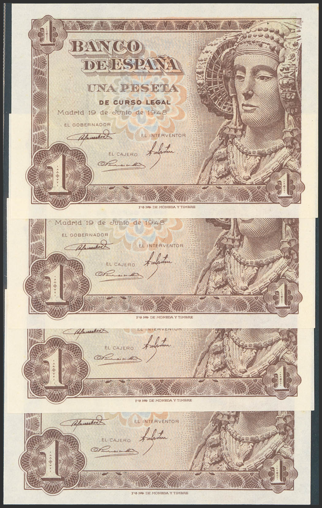 Conjunto de 4 billetes correlativos de 1 Peseta emitidos el 19 de Junio de 1948, todos ellos con la serie H (Edifil 2023: 457a), apresto original. SC.