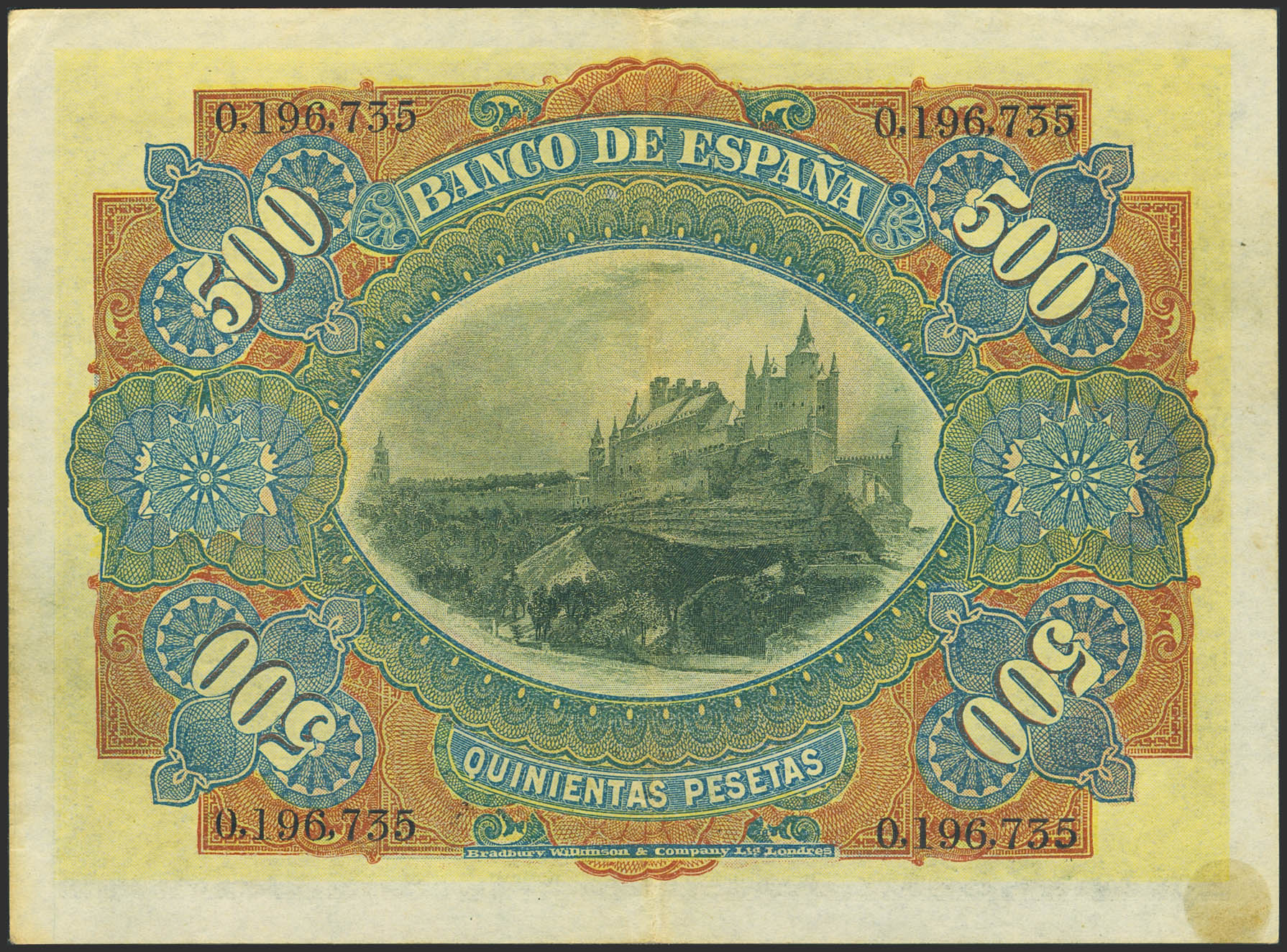 500 Pesetas. 15 de Julio de 1907. Sin serie. (Edifil 2023: 321). Raro, en esta calidad, billete de enorme presencia especialmente sin ninguna reparación. EBC-.