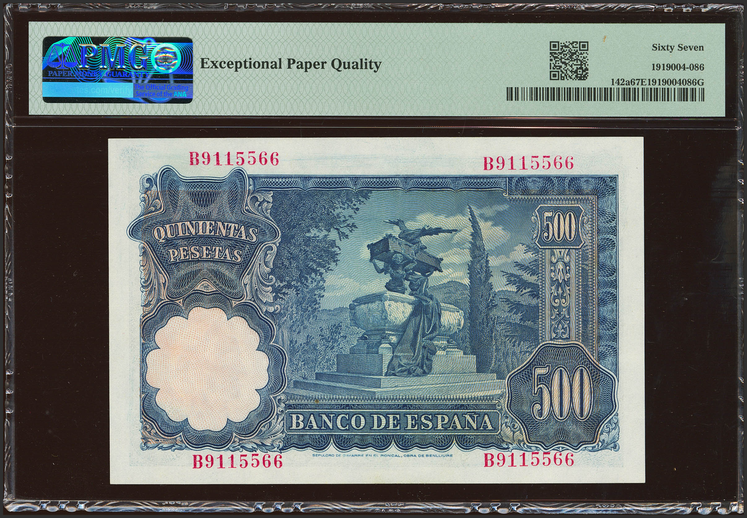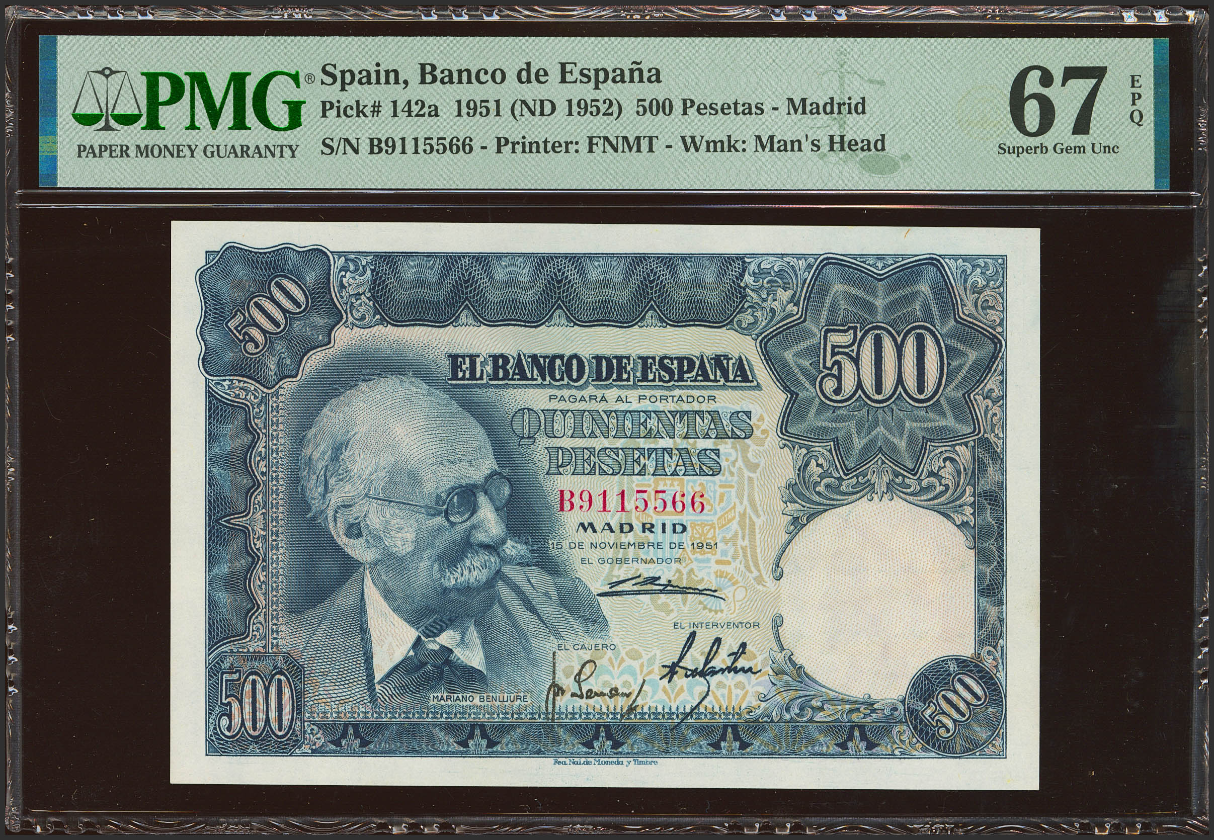 500 Pesetas. 15 de Noviembre de 1951. Serie B. (Edifil 2021: 460a, Pick: 142a). Extraordinariamente raro en esta excepcional calidad, conserva todo su apresto original. SC. Encapsulado PMG67EPQ.