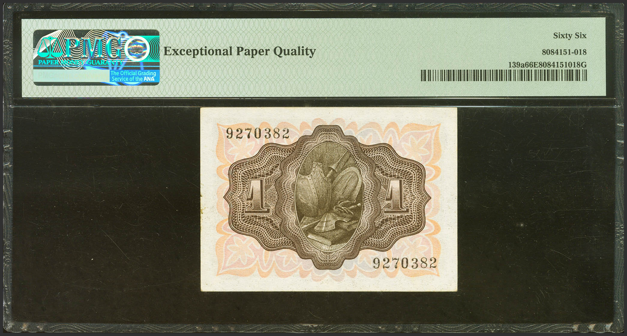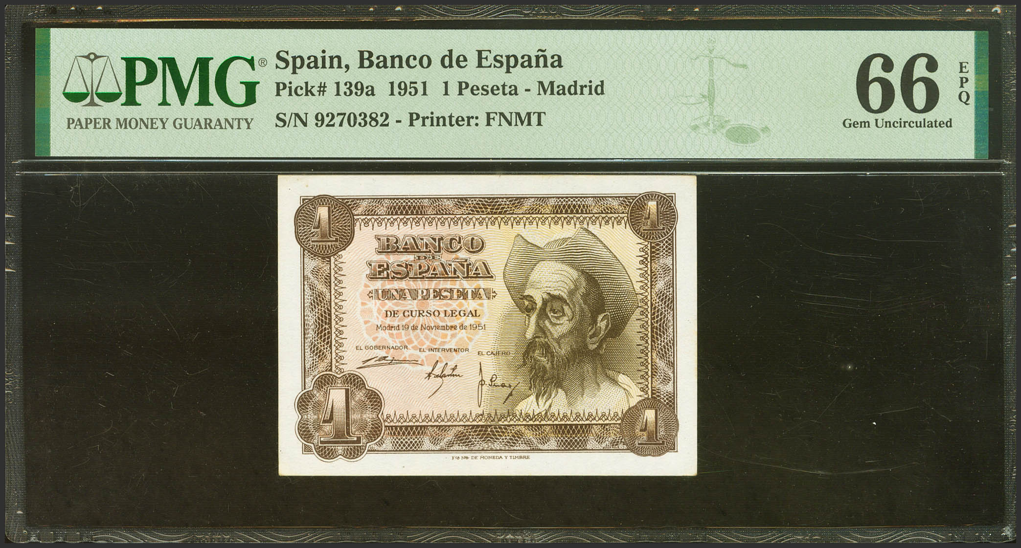 1 Pesetas. 19 de Noviembre de 1951. Sin serie. (Edifil 2023: 461, Pick: 139a). Inusual en esta calidad, apresto original. SC. Encapsulado PMG66EPQ.