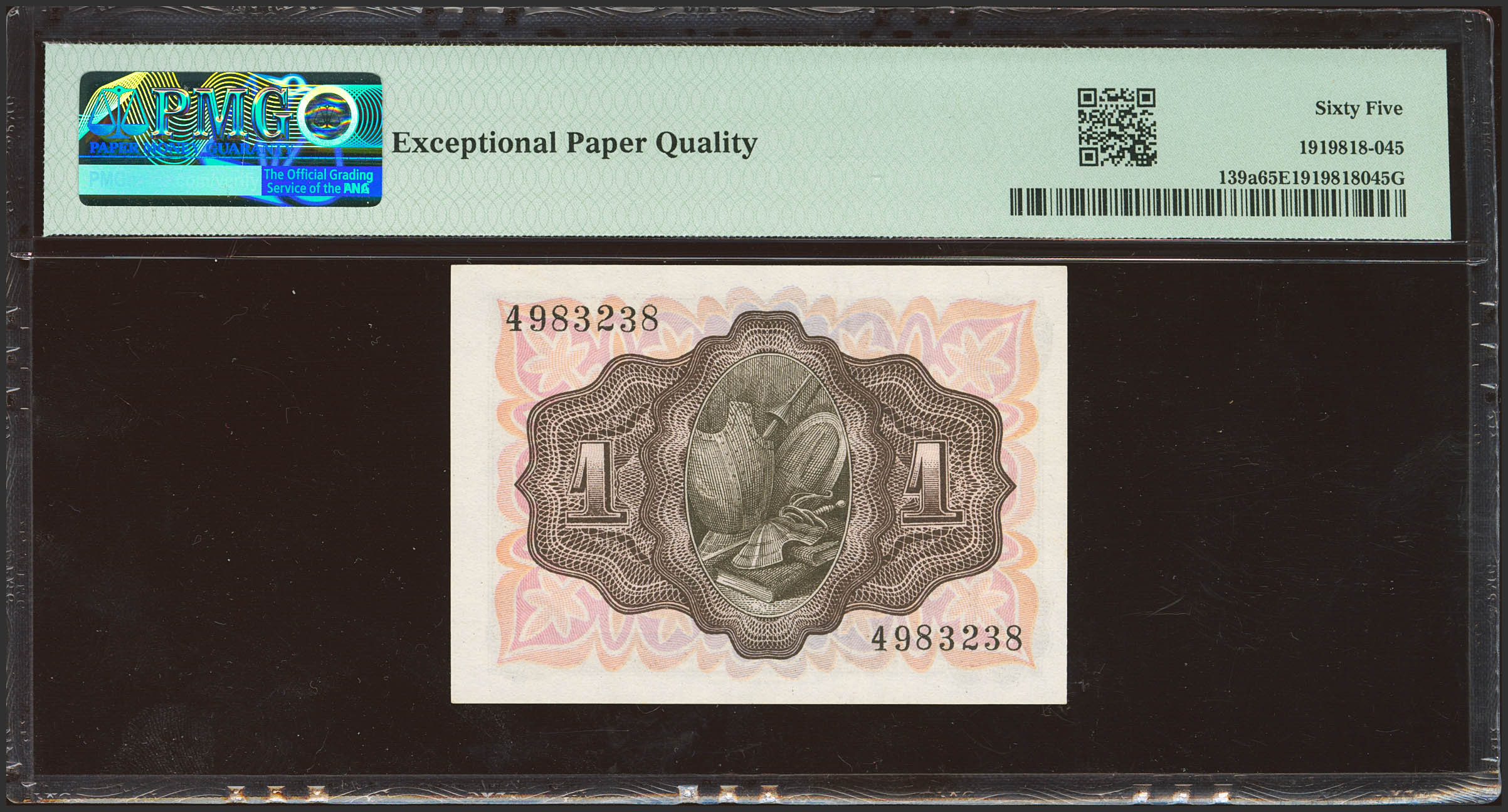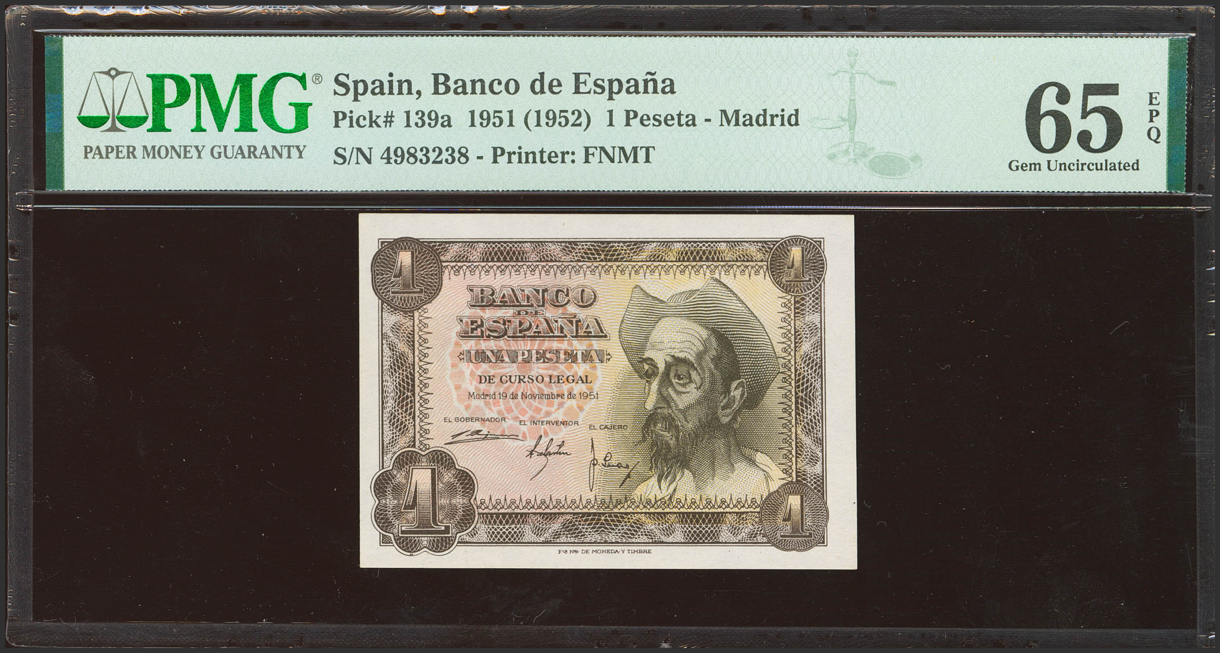 1 Peseta. 19 de Noviembre de 1951. Sin serie. (Edifil 2023: 461, Pick: 139a). Apresto original. SC. Encapsulado PMG65EPQ.