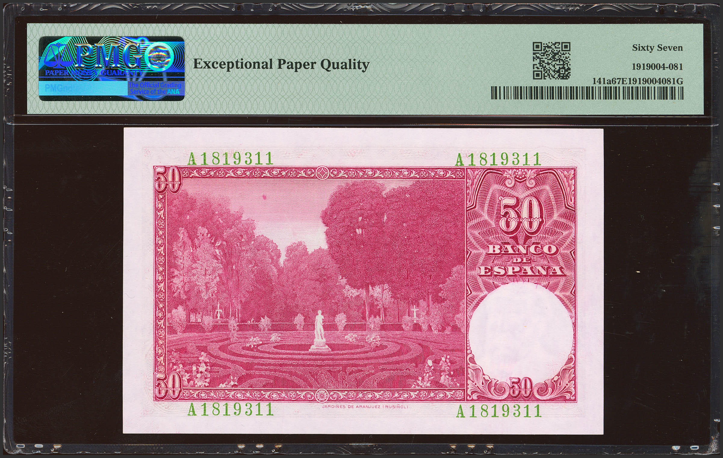 50 Pesetas. 31 de Diciembre de 1951. Serie A. (Edifil 2023: 462a, Pick: 141a). Raro en esta excepcional calidad, apresto original. SC. Encapsulado PMG67EPQ.