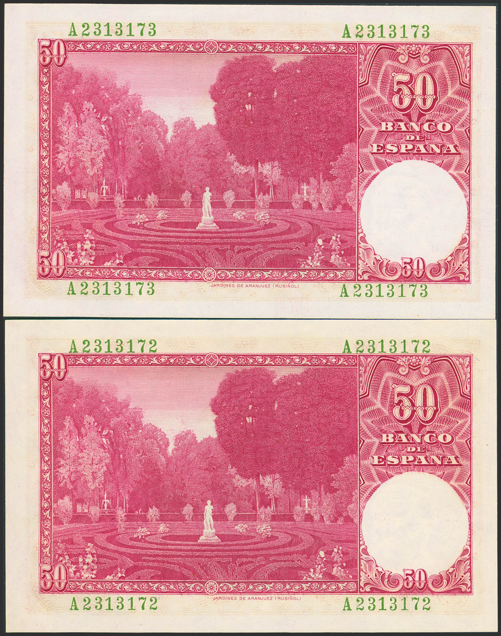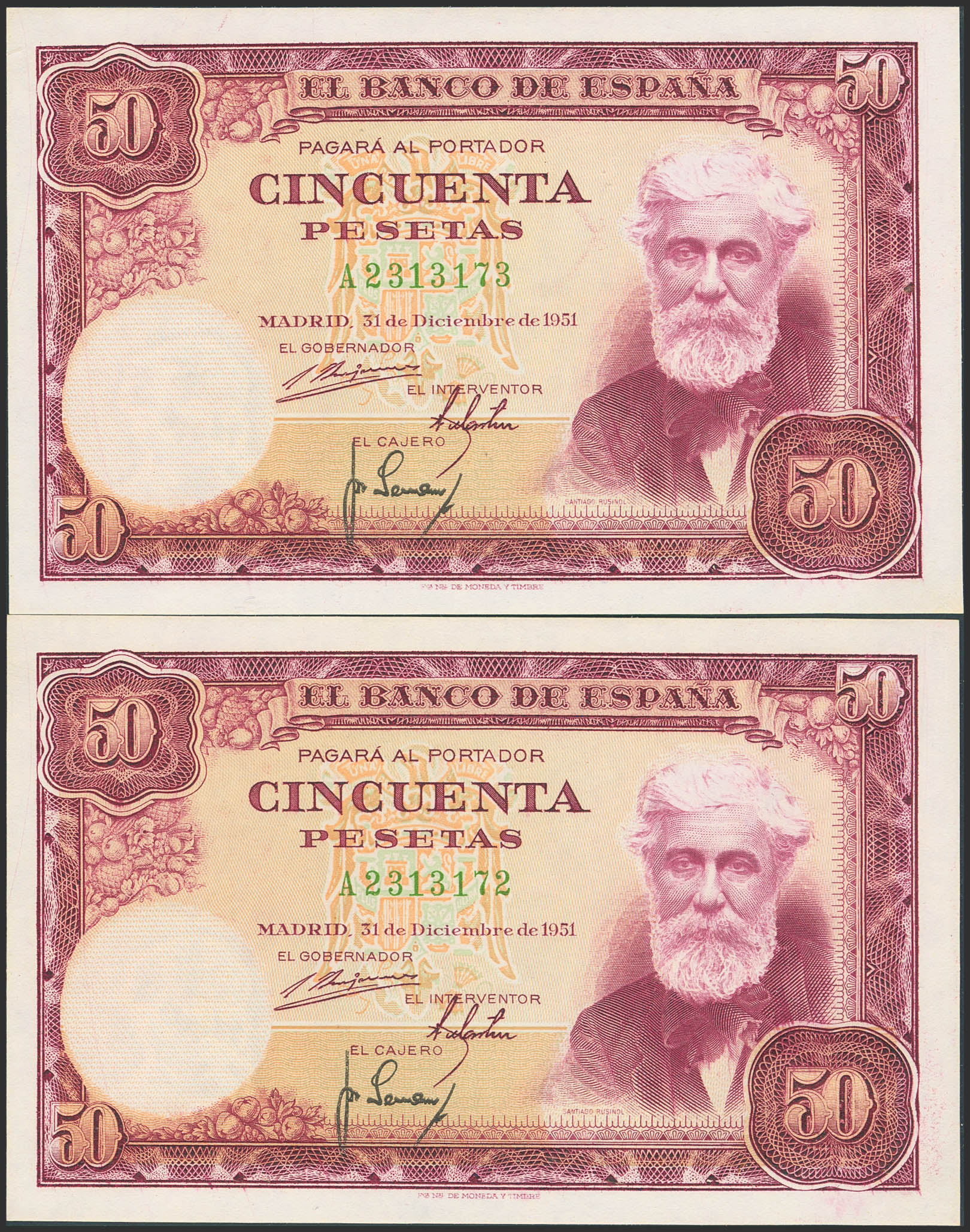 50 Pesetas. 31 de Diciembre de 1951. Pareja correlativa. Serie A. (Edifil 2021: 462a). Inusual en esta calidad, conserva todo su apresto original. SC.