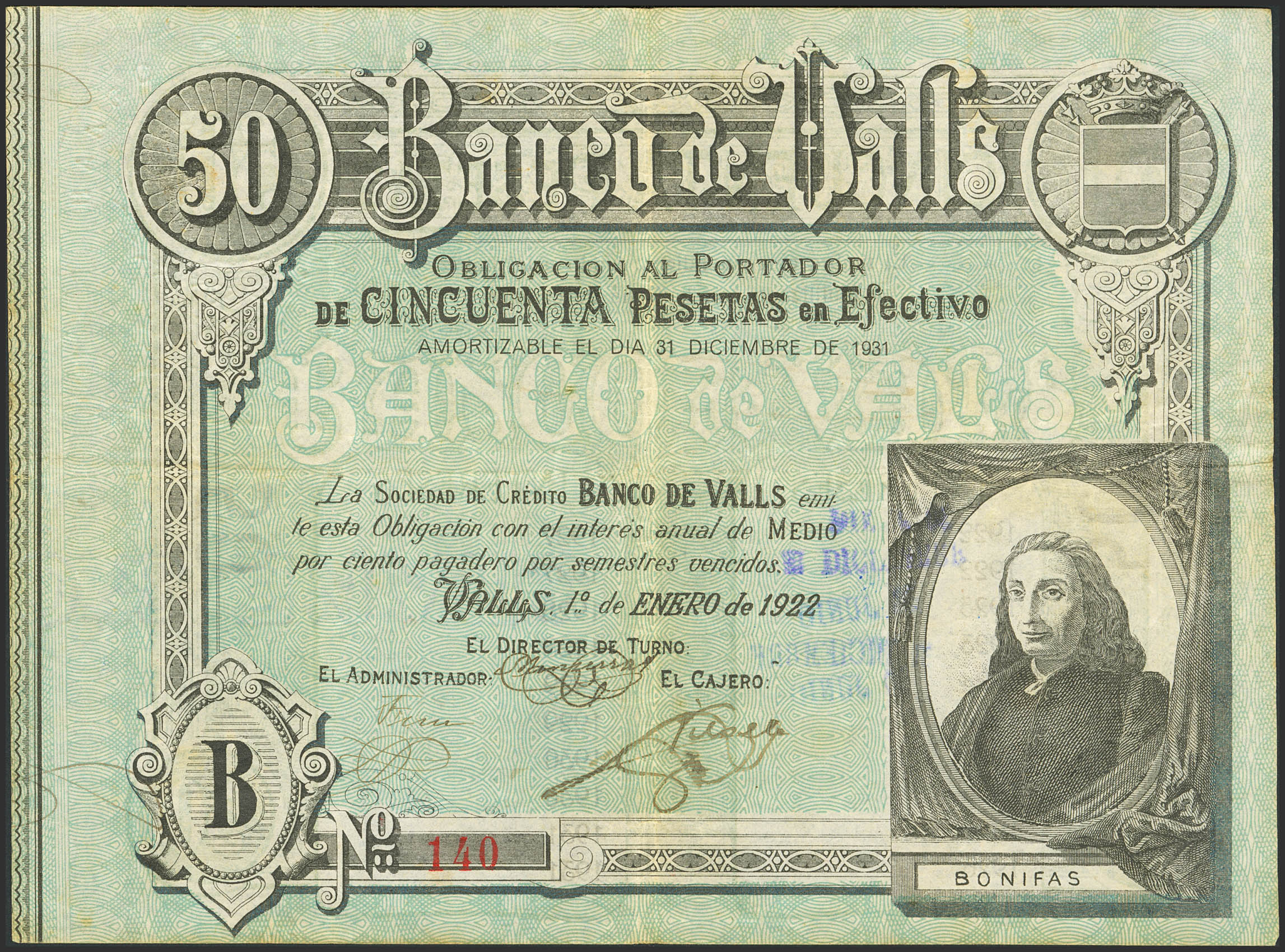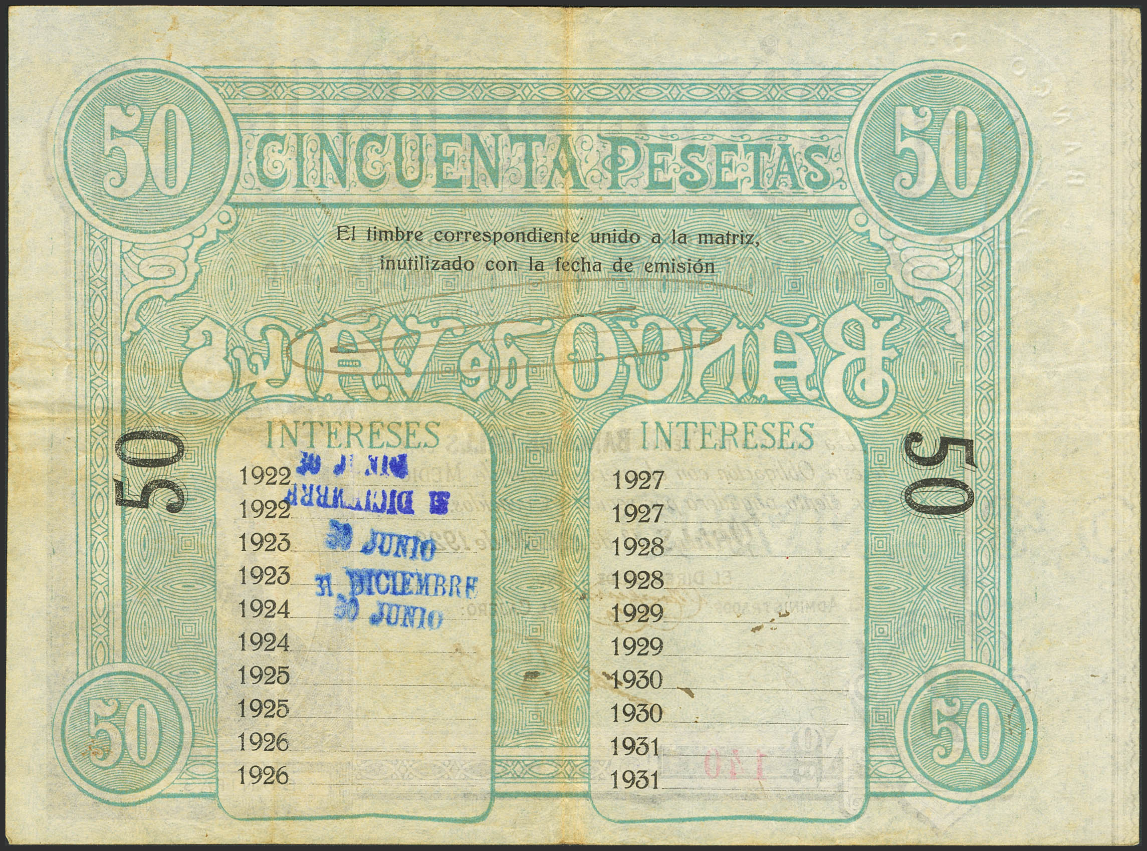 50 Pesetas. 1 de Enero de 1922. Serie B, con numeración 140 y con firmas originales. (Ruiz y Alentorn: 931). Rarísimo circulado. MBC.
