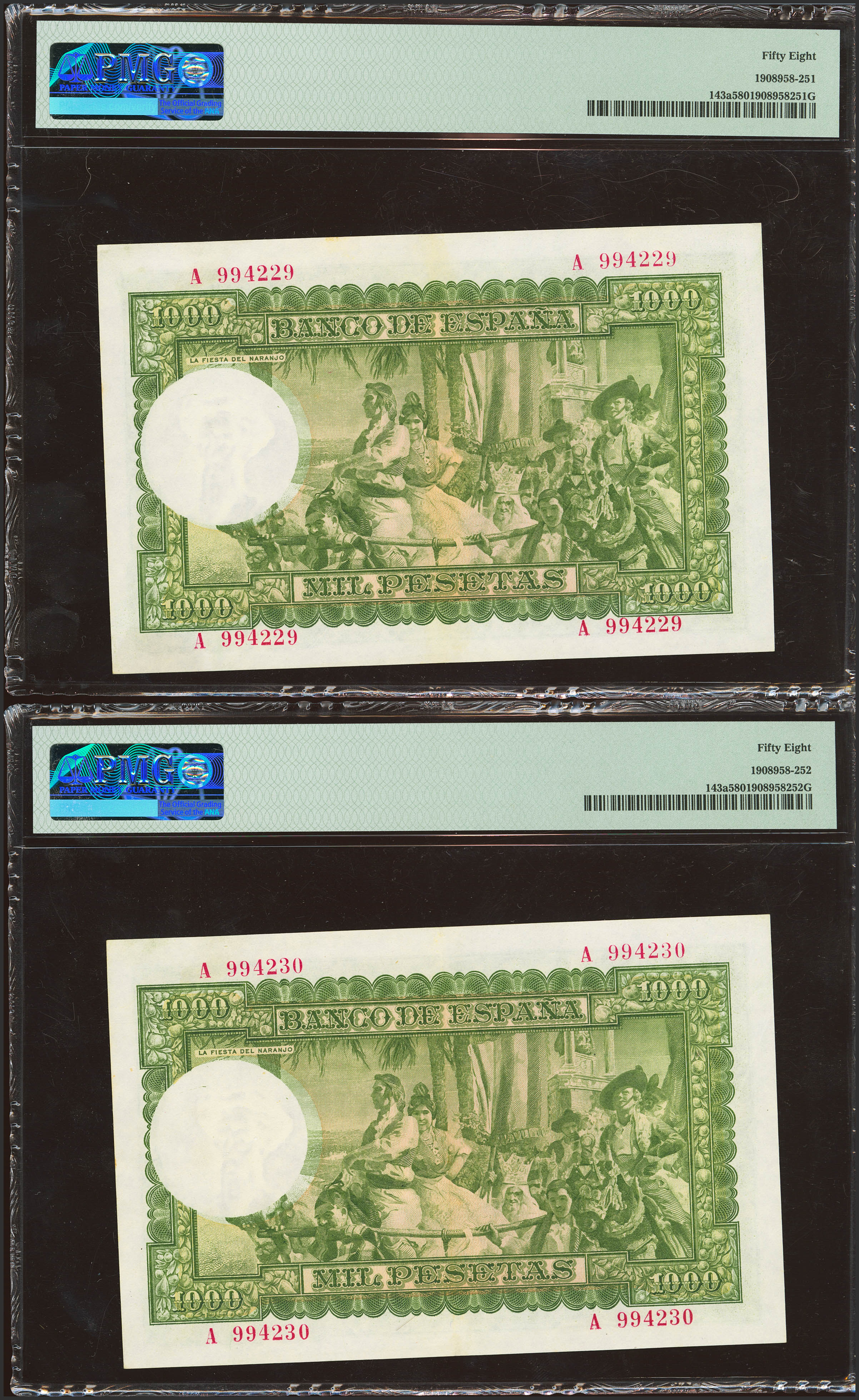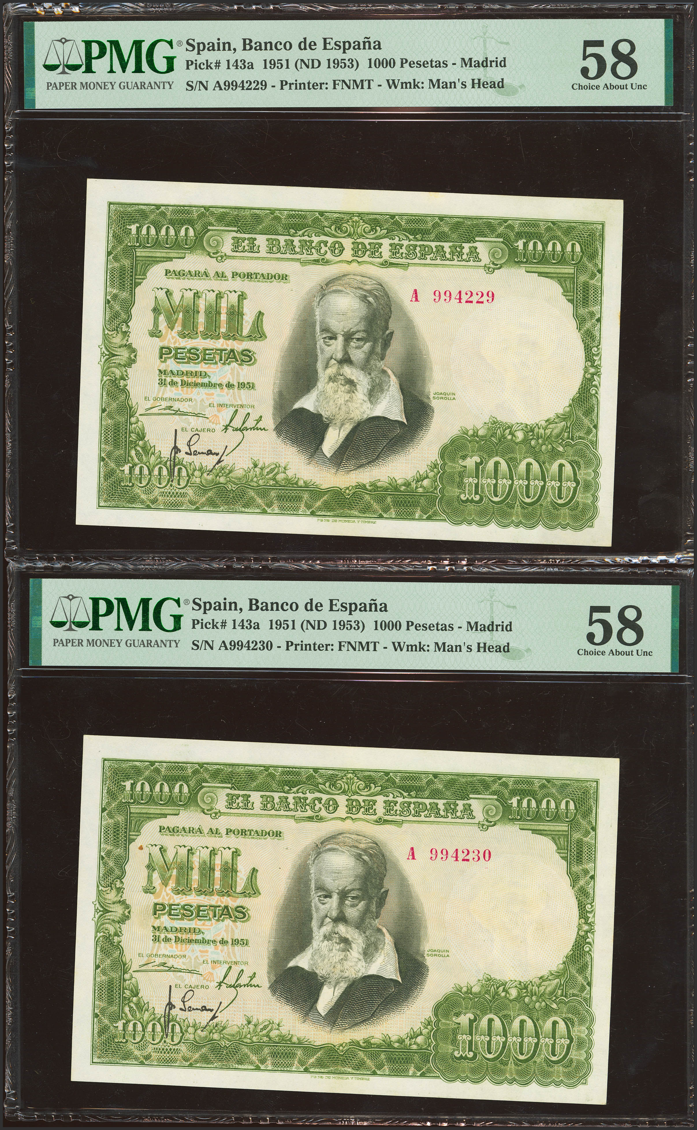 1000 Pesetas. 31 de Diciembre de 1951. Pareja correlativa. Serie A. (Edifil 2023: 463a). Conserva parte del apresto original. EBC++. Encapsulado PMG58.