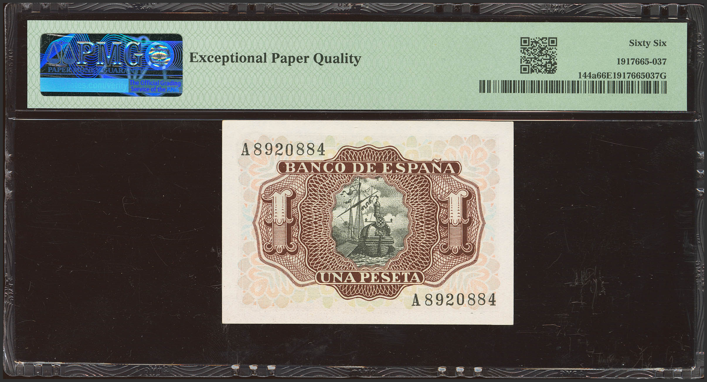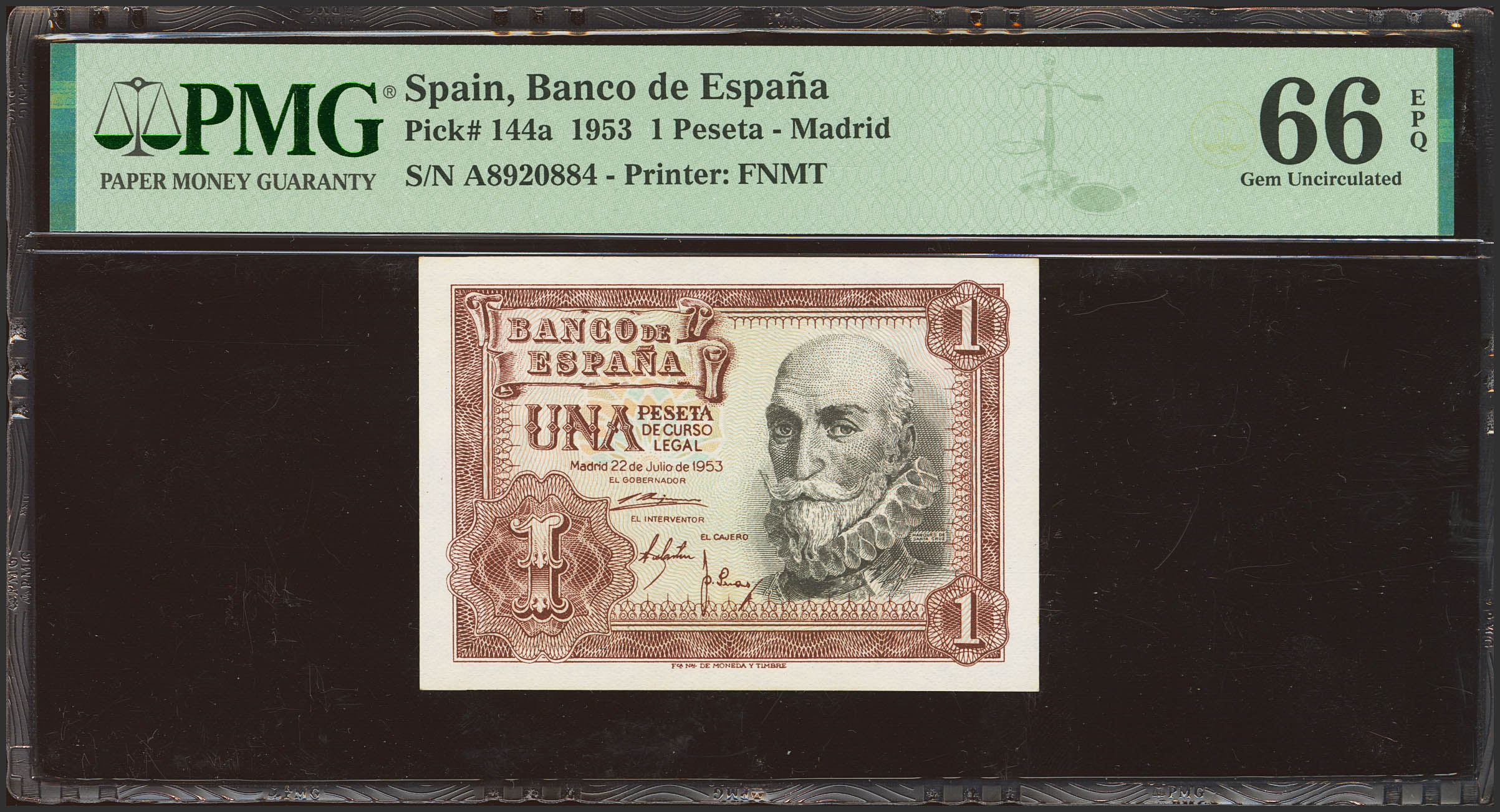 1 Peseta. 22 de Julio de 1953. Serie A. (Edifil 2023: 465a, Pick: 144a). Apresto original. SC. Encapsulado PMG66EPQ.