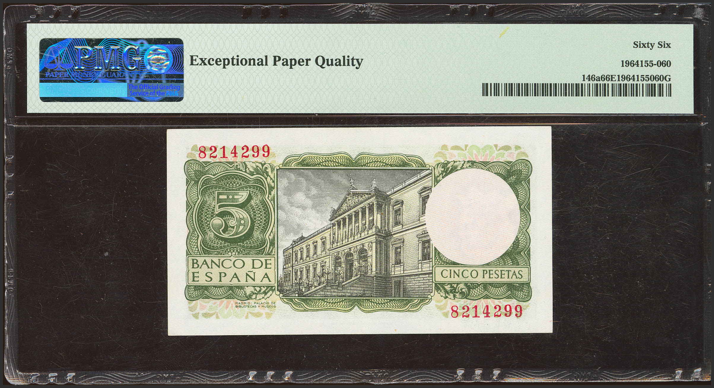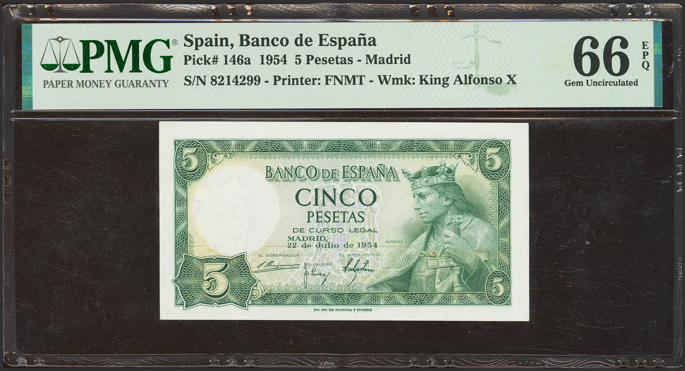 5 Pesetas. 22 de Julio de 1954. Sin serie. (Edifil 2021: 466, Pick: 146a). Raro en esta excepcional calidad, apresto original. SC. Encapsulado PMG66EPQ.