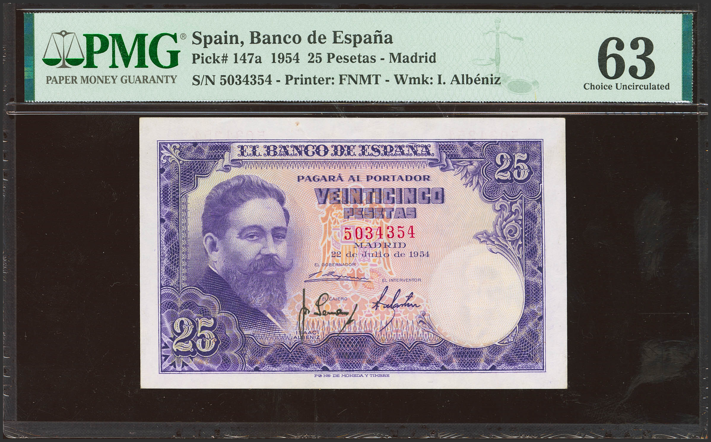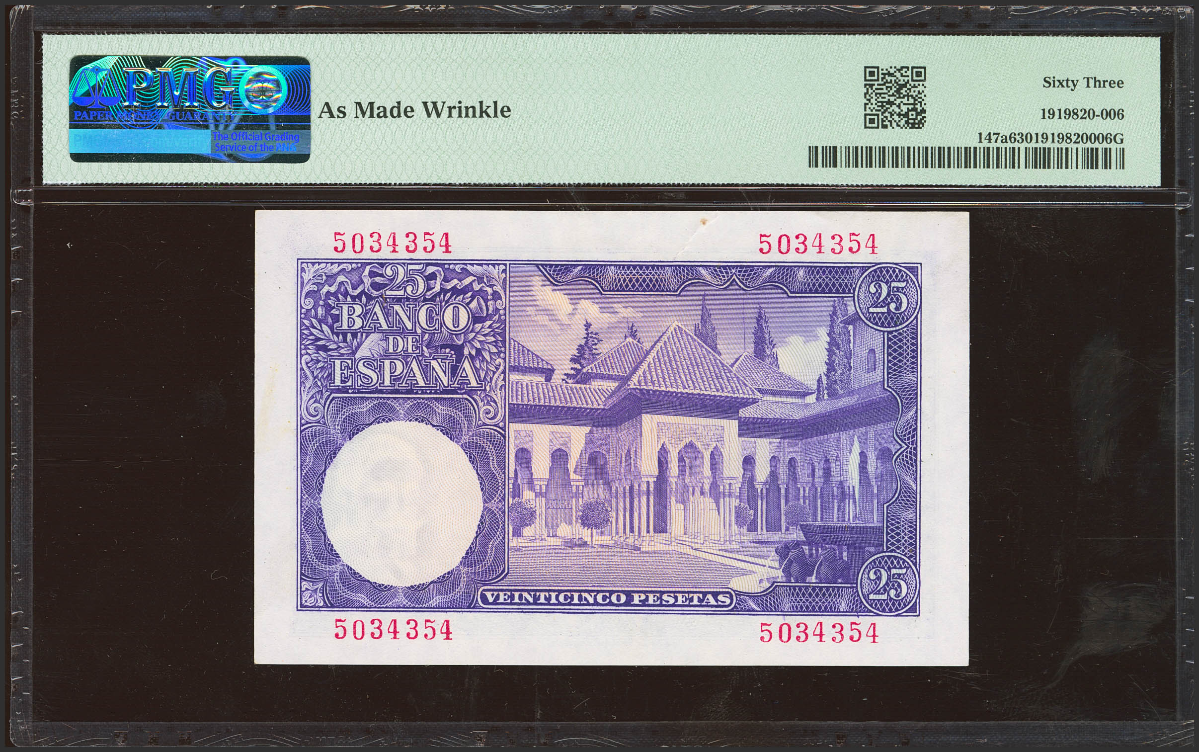 25 Pesetas. 22 de Julio de 1954. Sin serie. (Edifil 2023: 467, Pick: 147a). Inusual. SC. Encapsulado PMG63 (as made wrinkle).