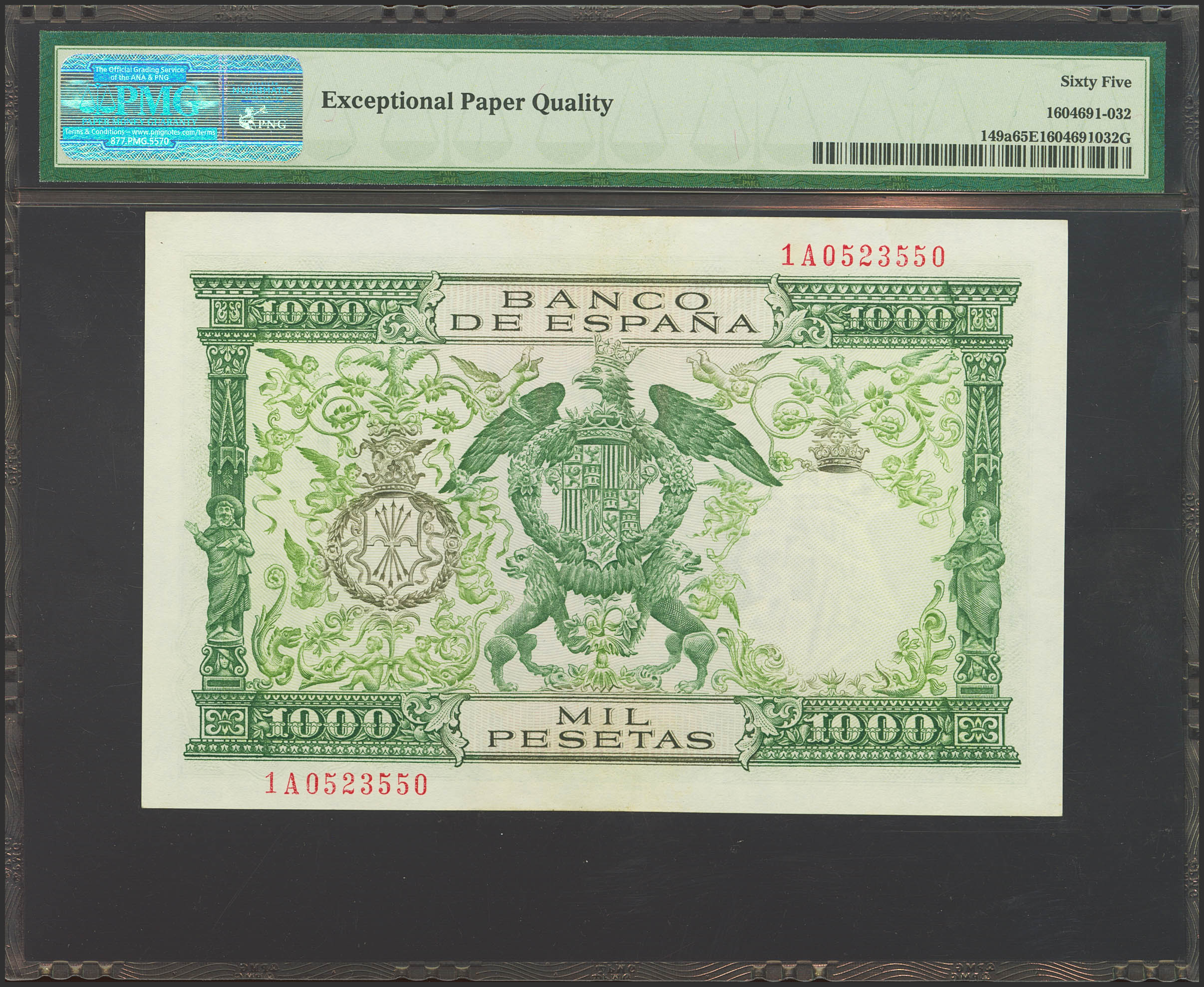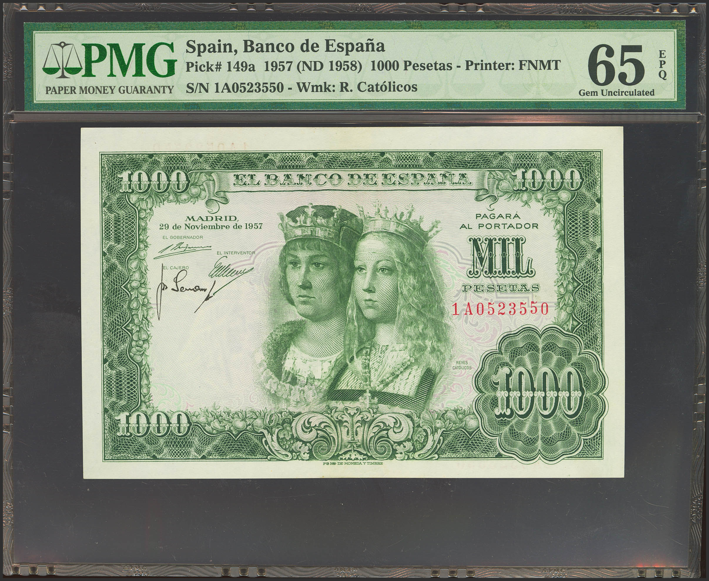 1000 Pesetas. 29 de Noviembre de 1957. Serie 1A. (Edifil 2023: 469b, Pick: 149a). Apresto original. SC. Encapsulado PMG65EPQ.