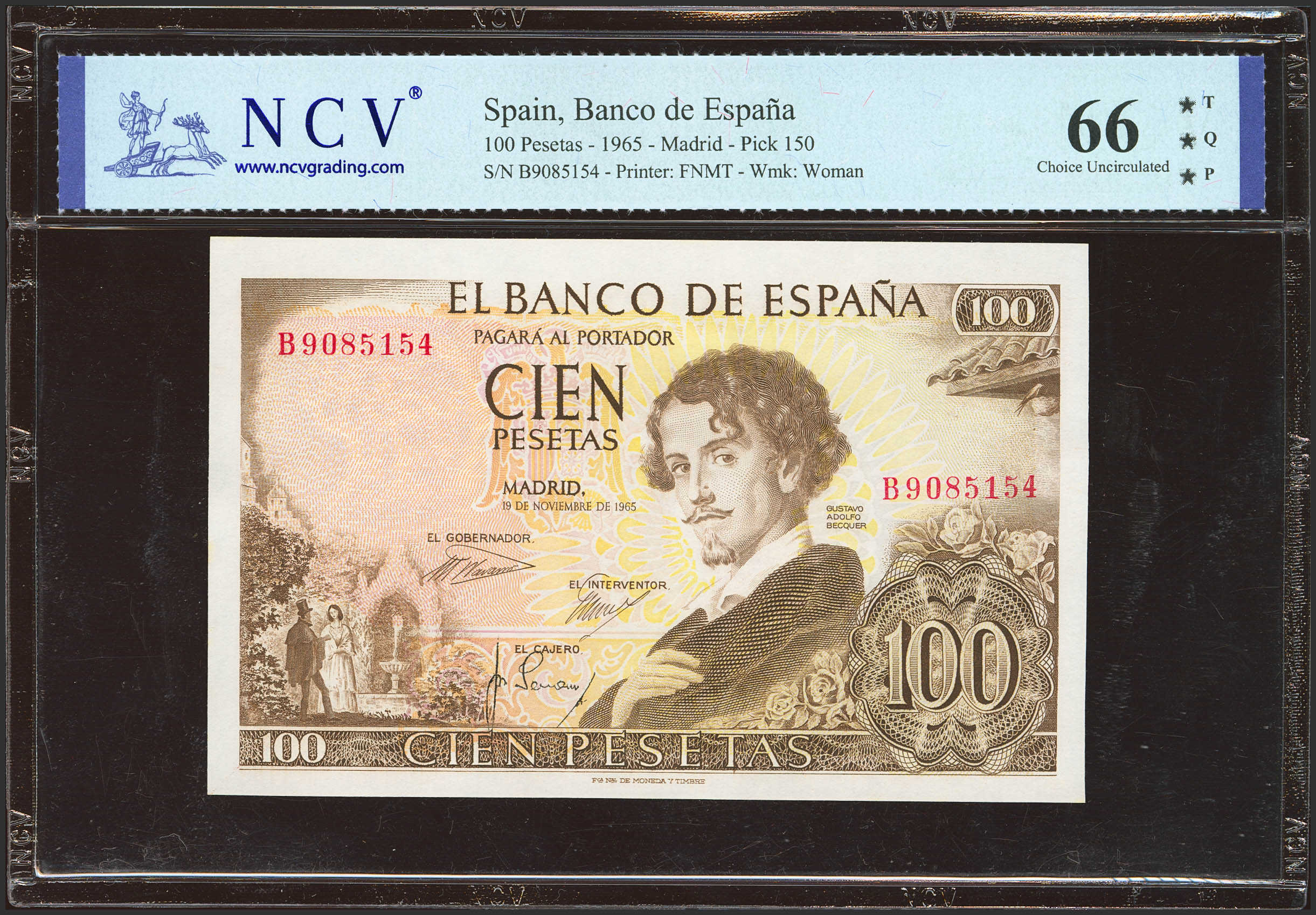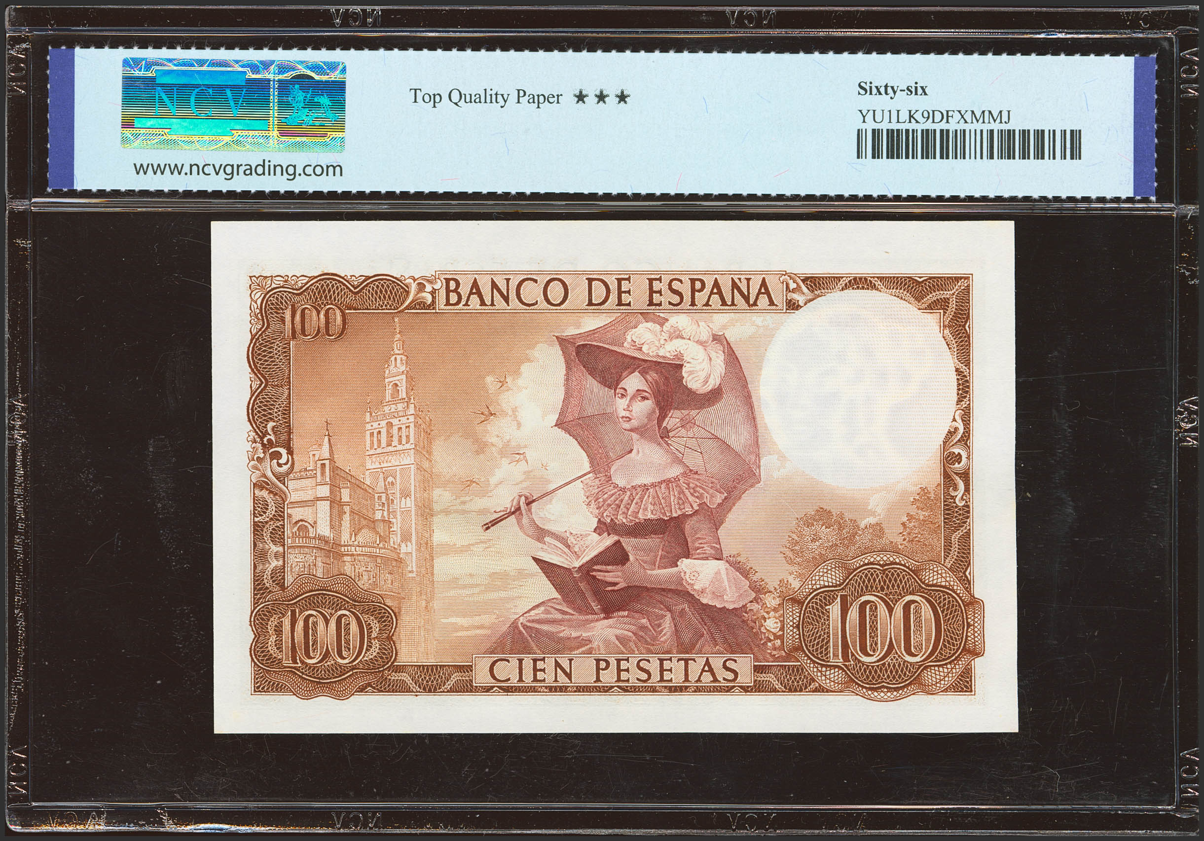 100 Pesetas. 19 de Noviembre de 1965. Serie B. (Edifil 2021: 470a, Pick: 150). Raro en esta excepcional calidad, apresto original. Encapsulado NCV66TQP.