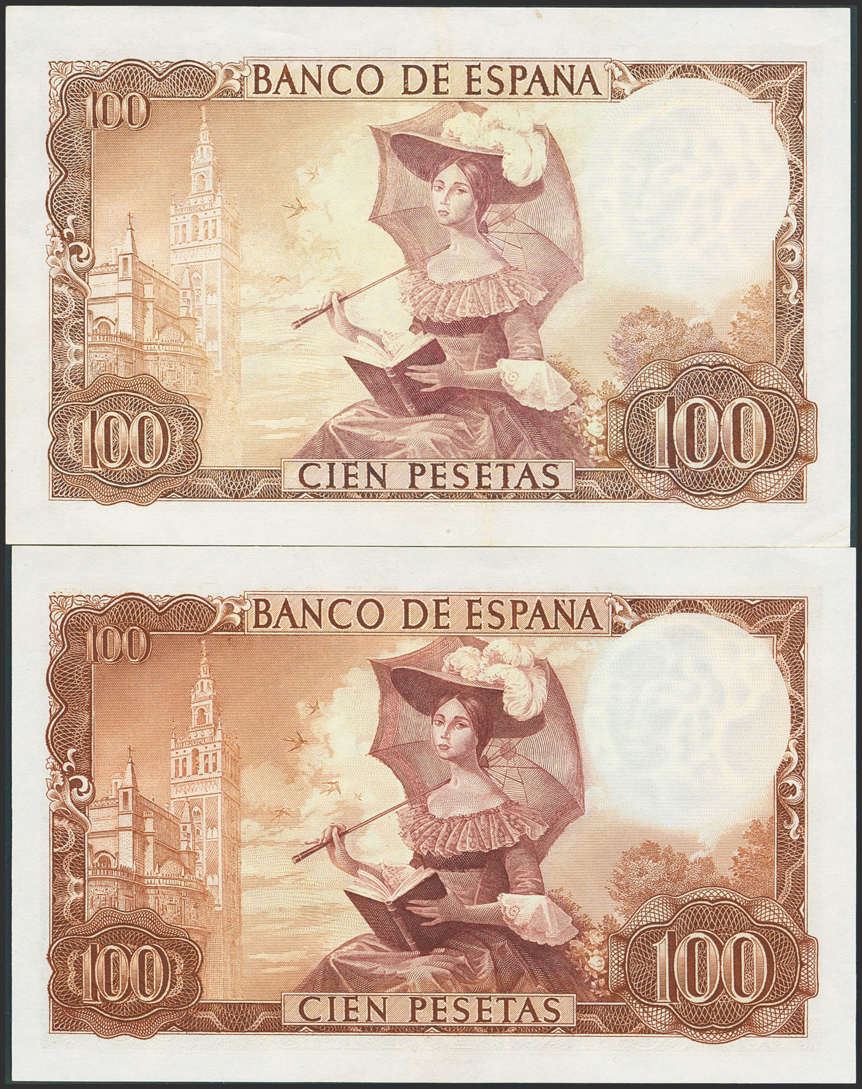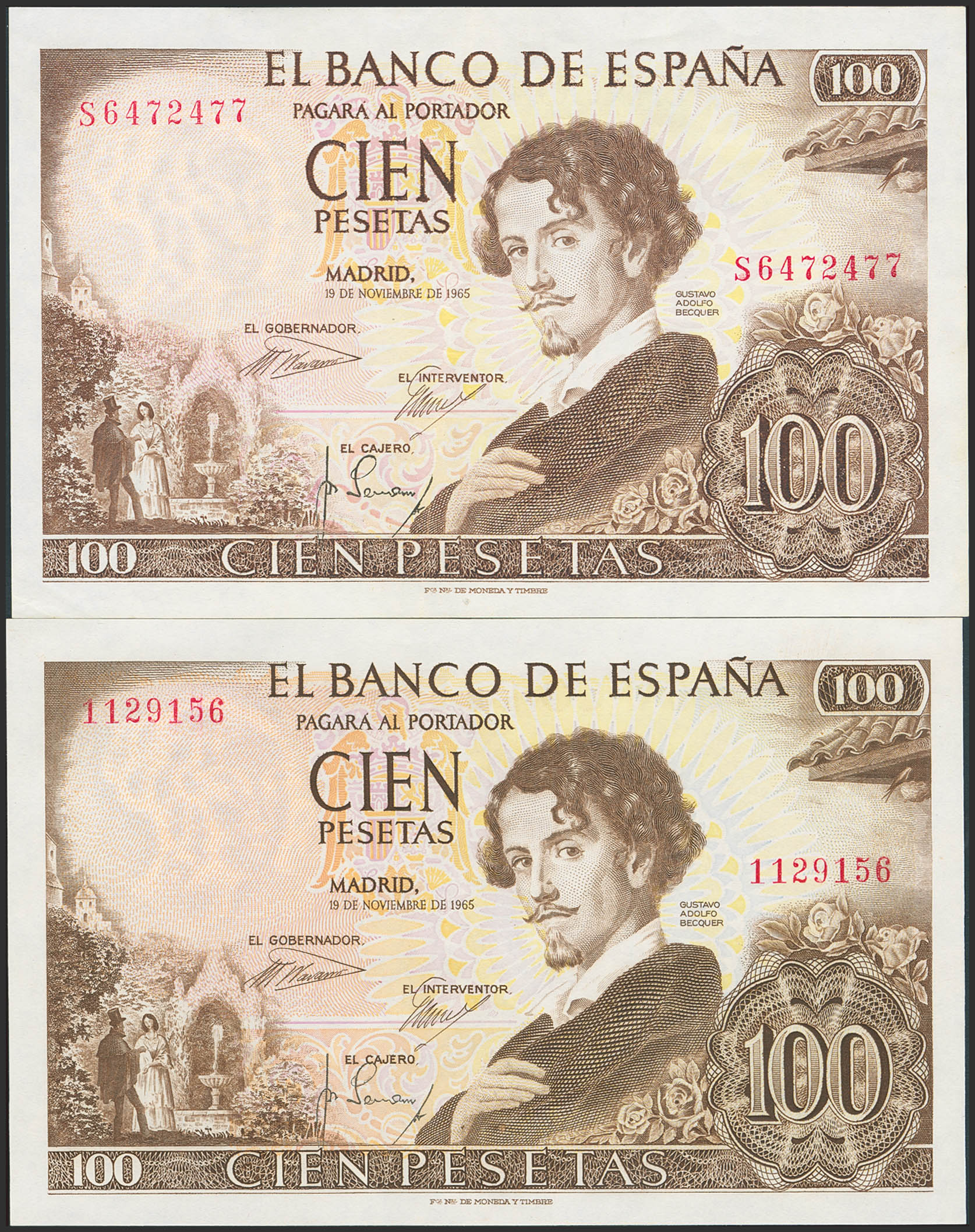 Conjunto de 2 billetes de 100 Pesetas emitidos el 19 de Noviembre de 1965, sin serie (SC) y serie S (EBC+). (Edifil 2023: 470, 470a). Apresto original. SC/EBC+.