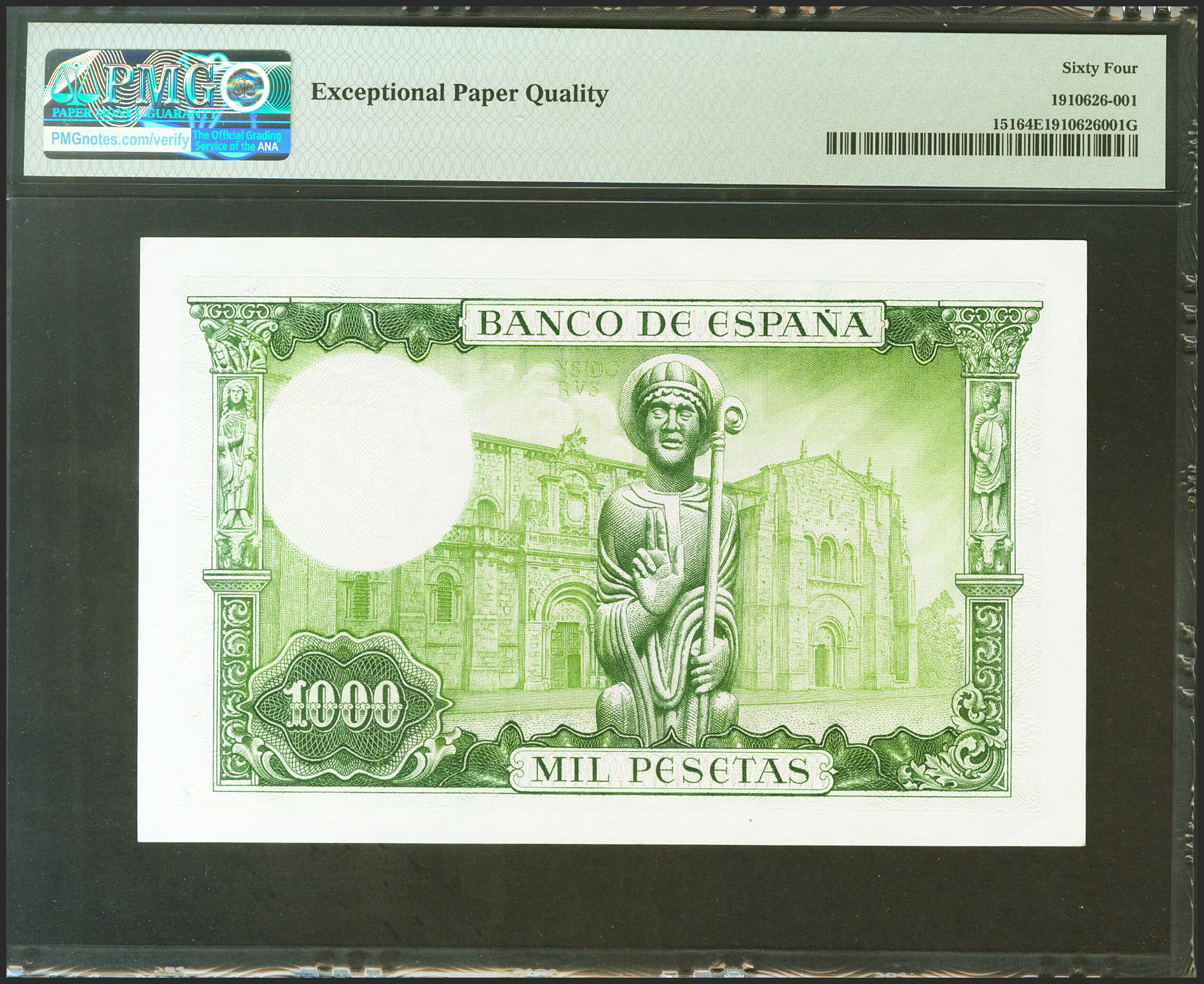 1000 Pesetas. 19 de Noviembre de 1965. Sin serie. (Edifil 2021: 471, Pick: 151). Inusual en esta calidad, apresto original. SC. Encapsulado PMG64EPQ.