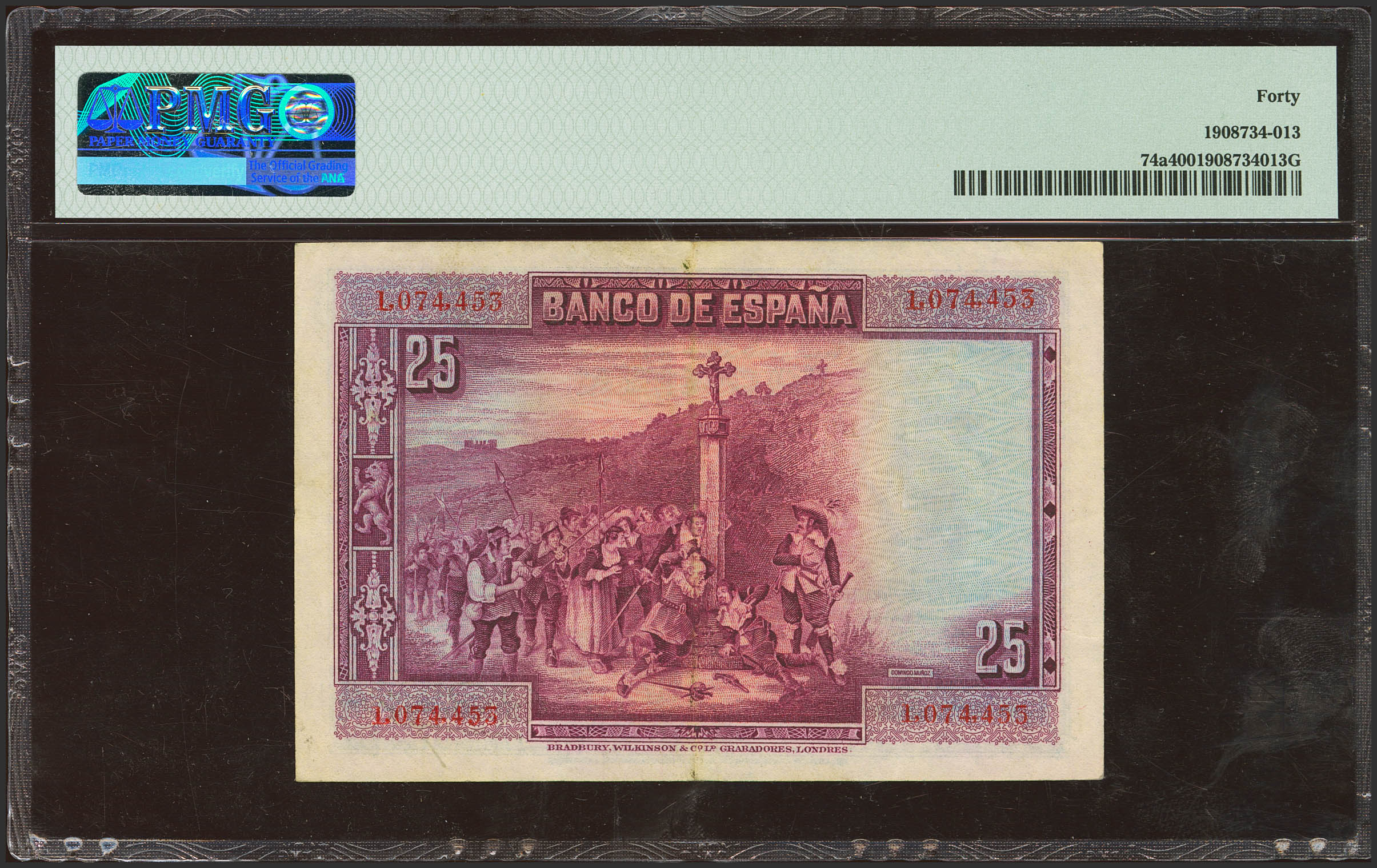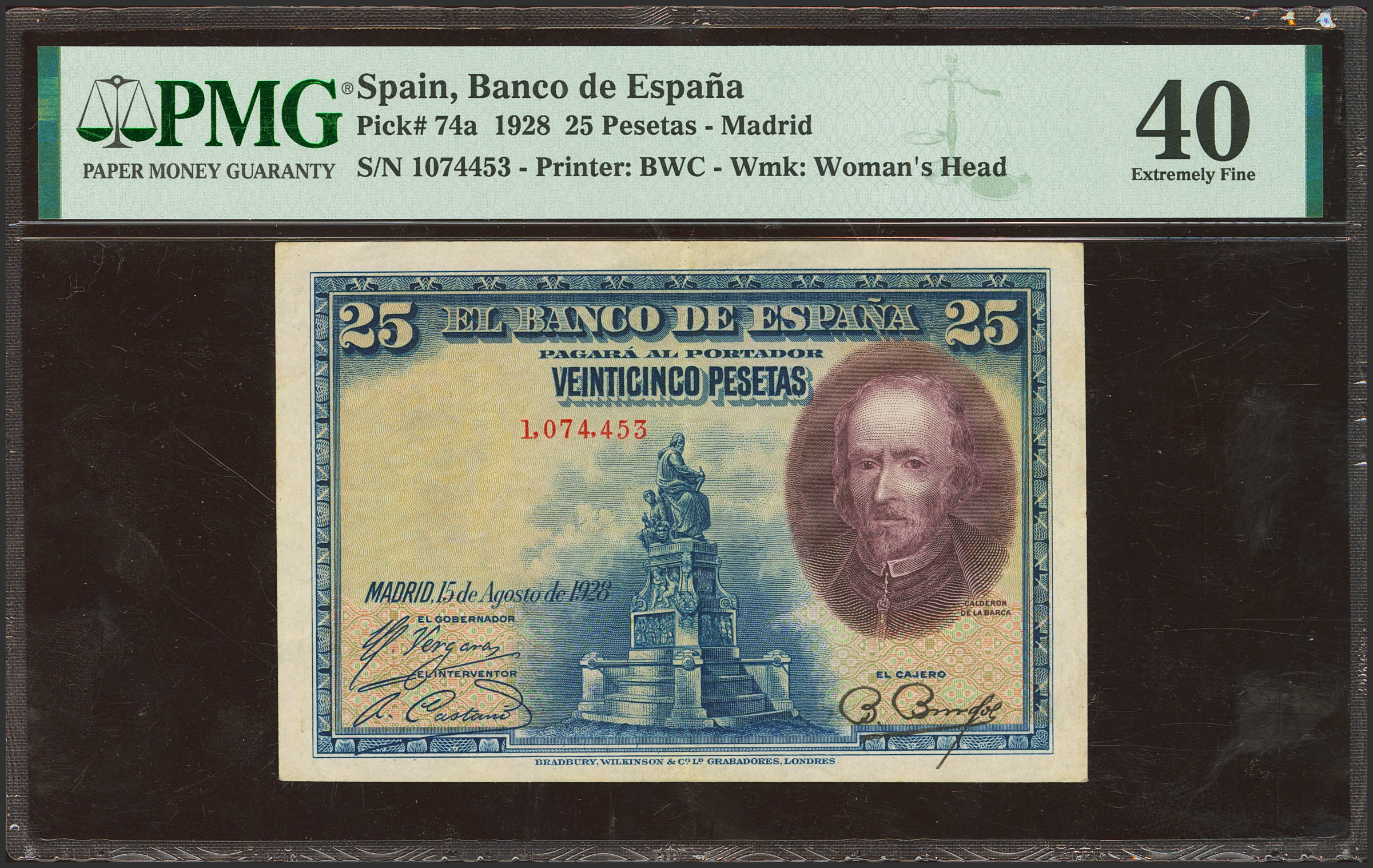 25 Pesetas. 15 de Agosto de 1928. Sin serie. (Edifil 2023: 328, Pick: 74a). EBC-. Encapsulado PMG40.