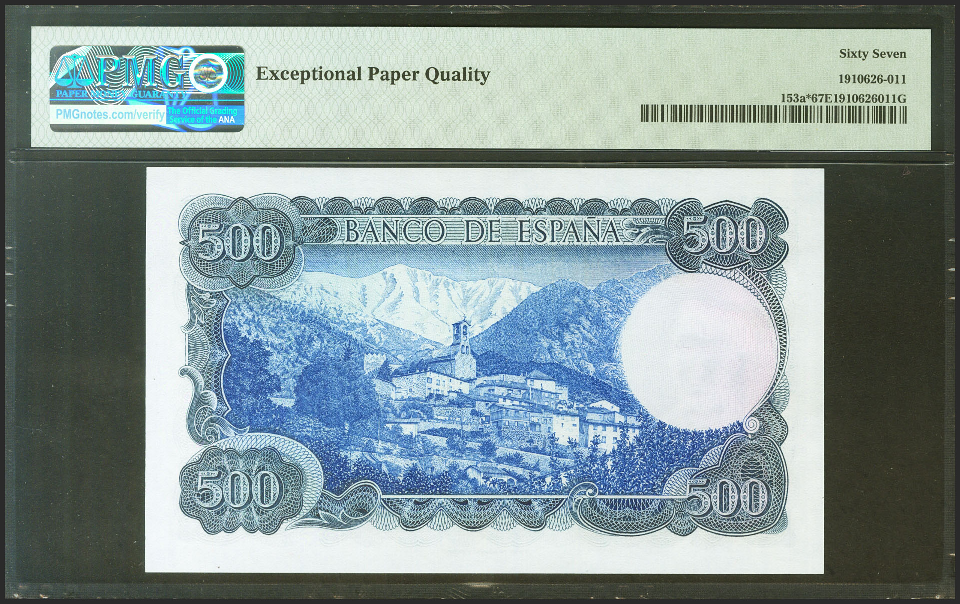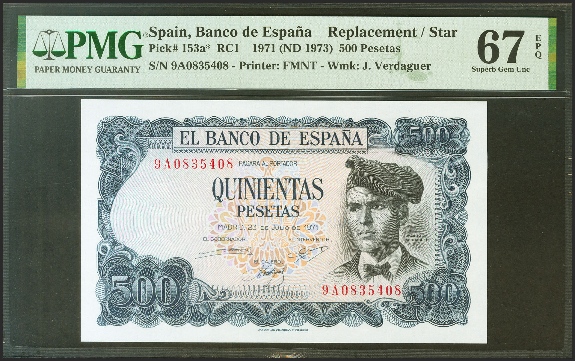 500 Pesetas. 23 de Julio de 1971. Serie especial 9A. (Edifil 2021: 473b, Pick: 153a*). Rarísimo en esta excepcional calidad. SC. Encapsulado PMG67EPQ.
