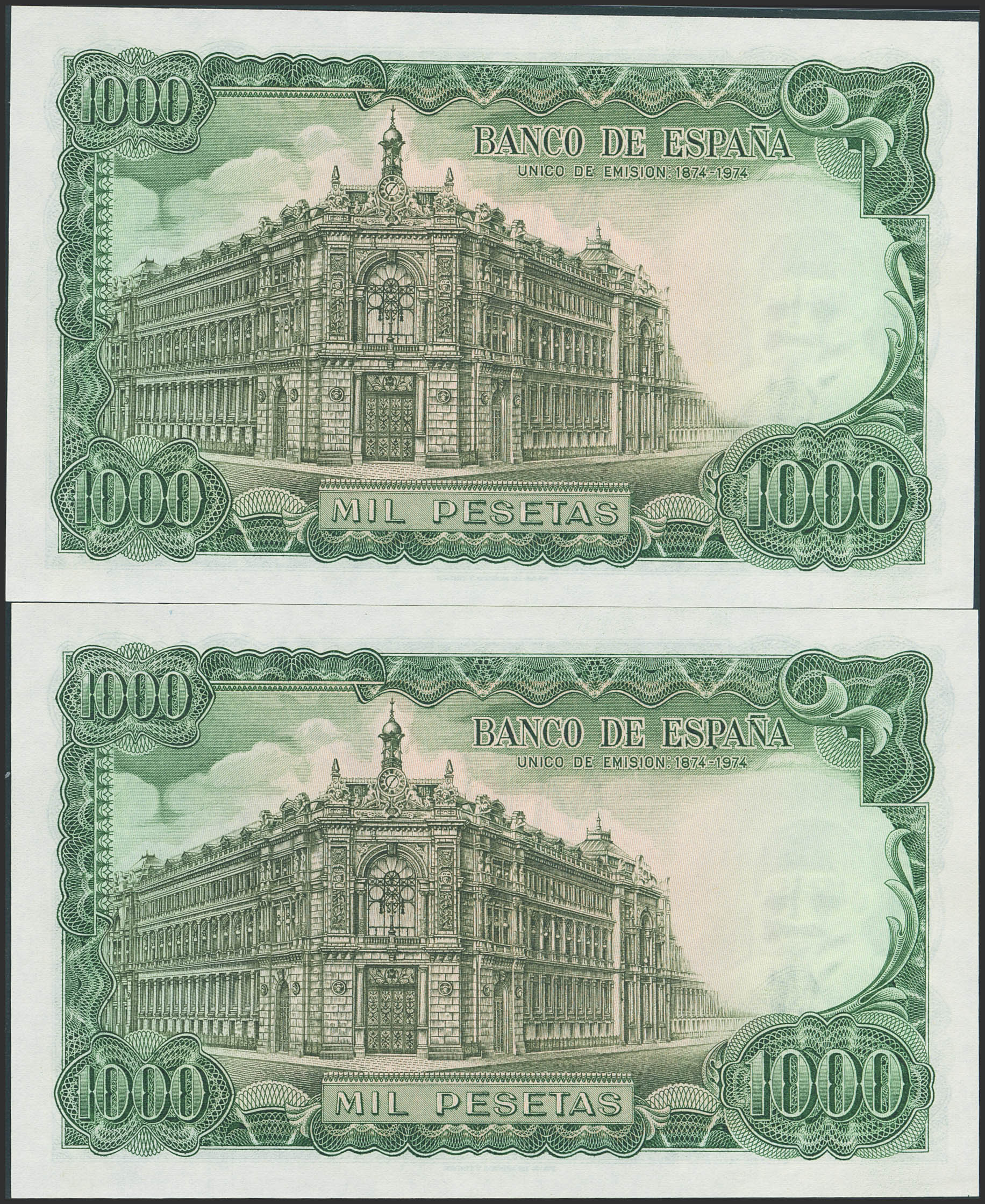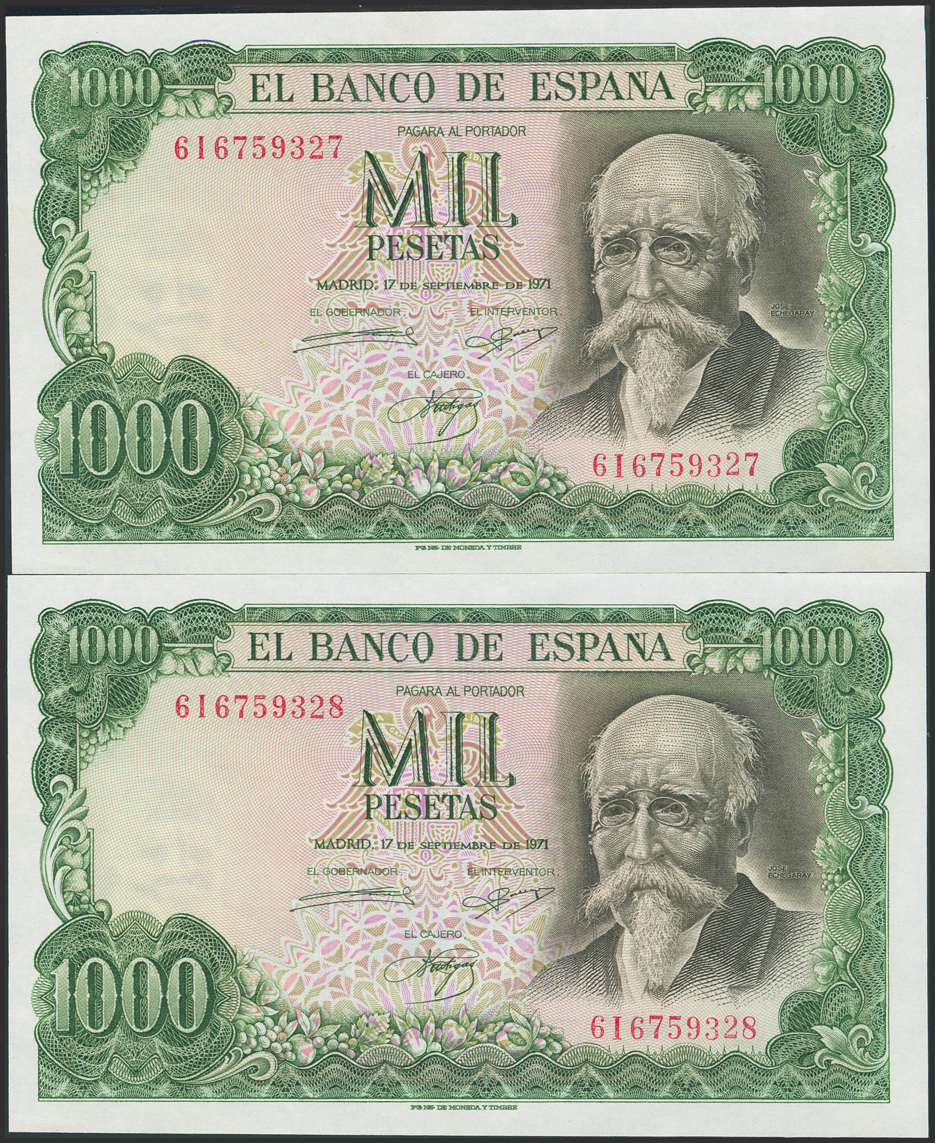 1000 Pesetas. 17 de Septiembre de 1971. Pareja correlativa. Serie 6I. (Edifil 2021: 474c). Conserva todo su apresto original. SC--.