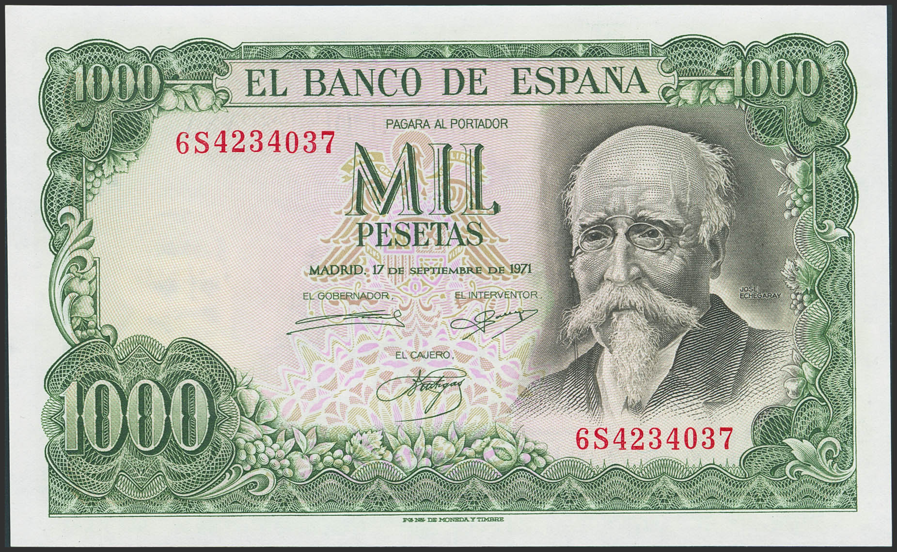 1000 Pesetas. 17 de Septiembre de 1971. Serie 6S. (Edifil 2023: 474c). Apresto original. SC-.