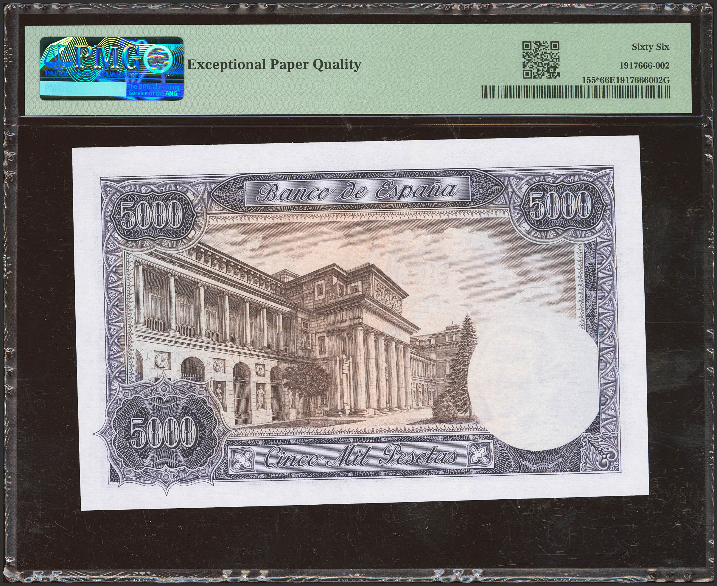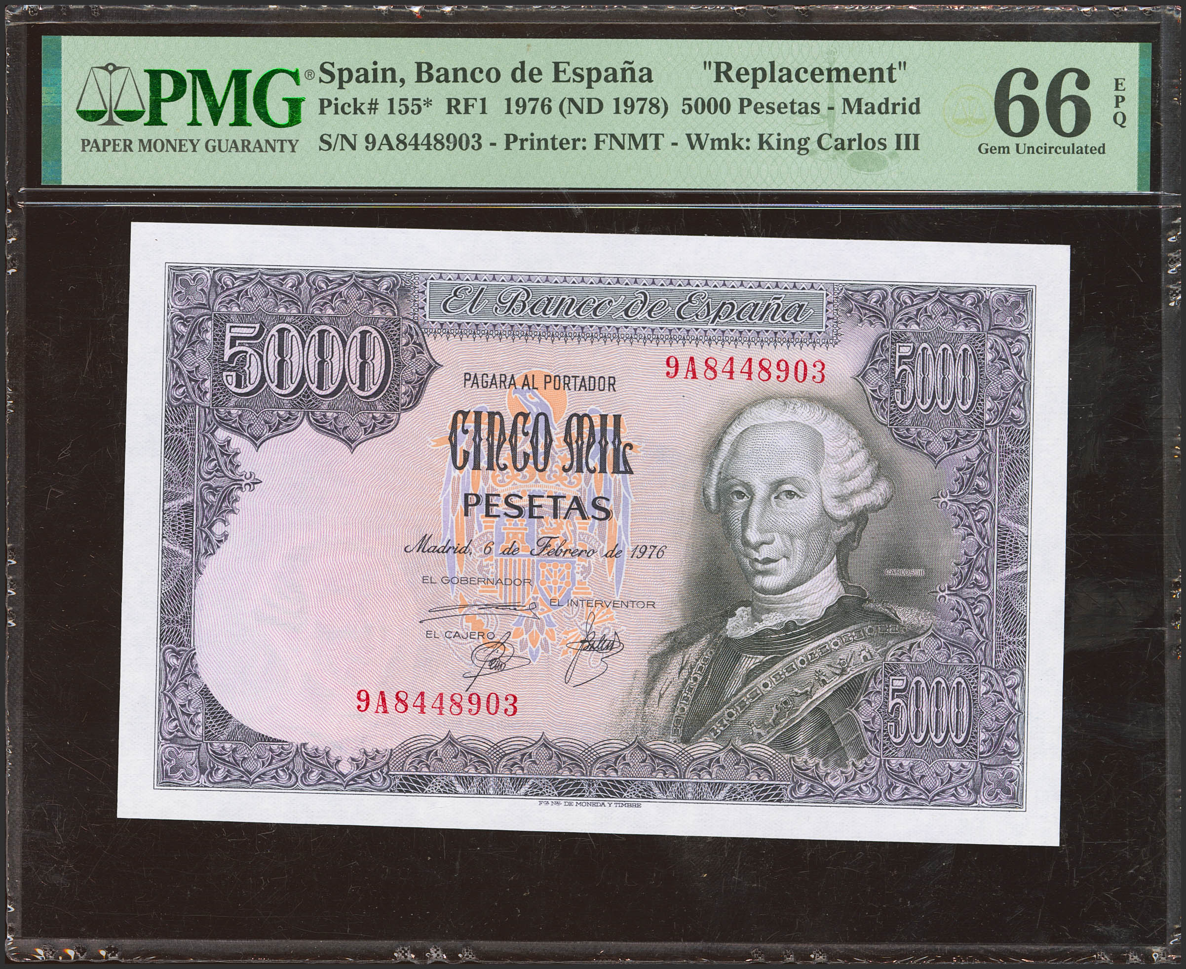 5000 Pesetas. 6 de Febrero de 1976. Serie especial 9A. (Edifil 2021: 475b, Pick: 155*). Rarísimo en esta excepcional calidad, apresto original. SC. Encapsulado PMG66EPQ.