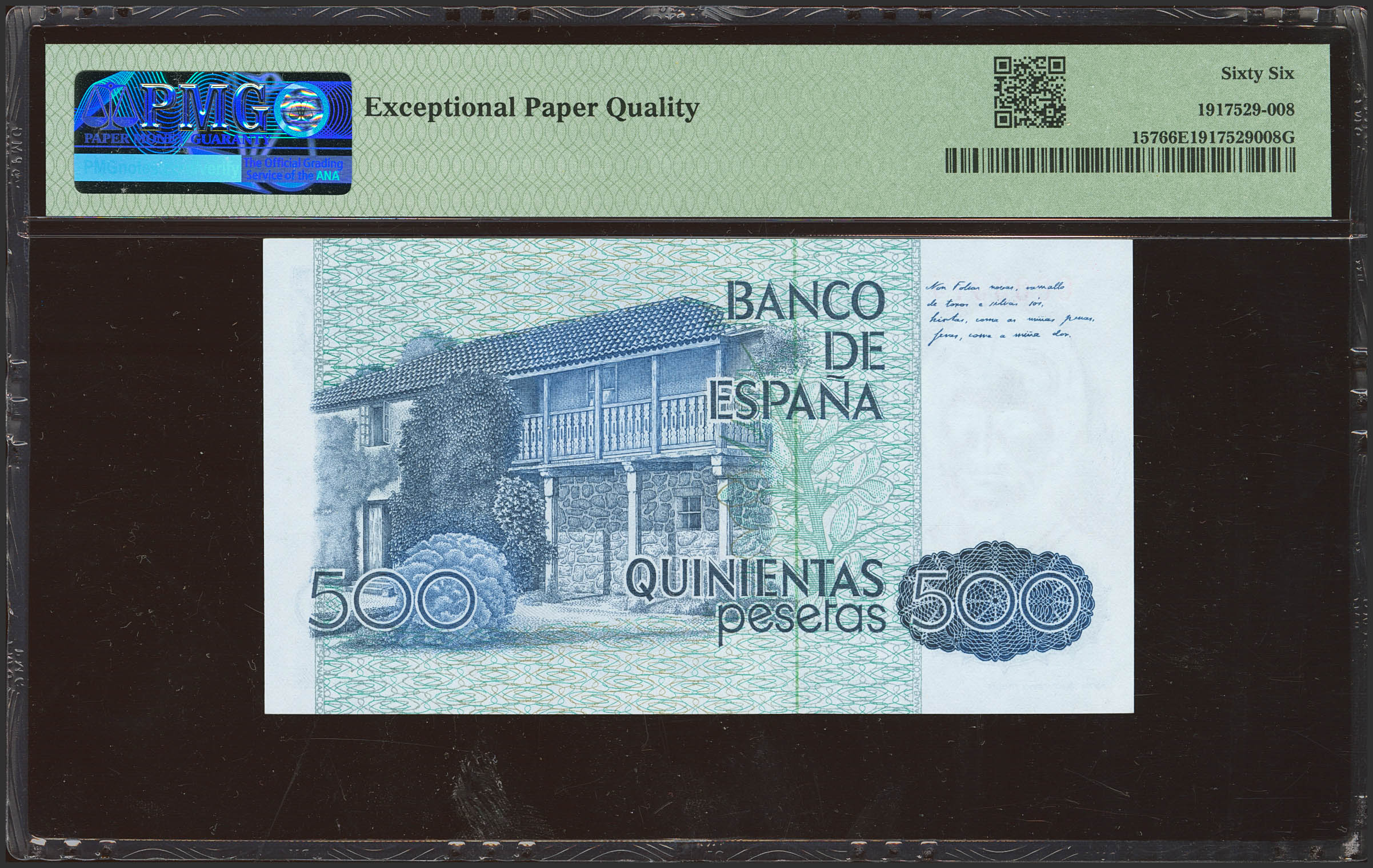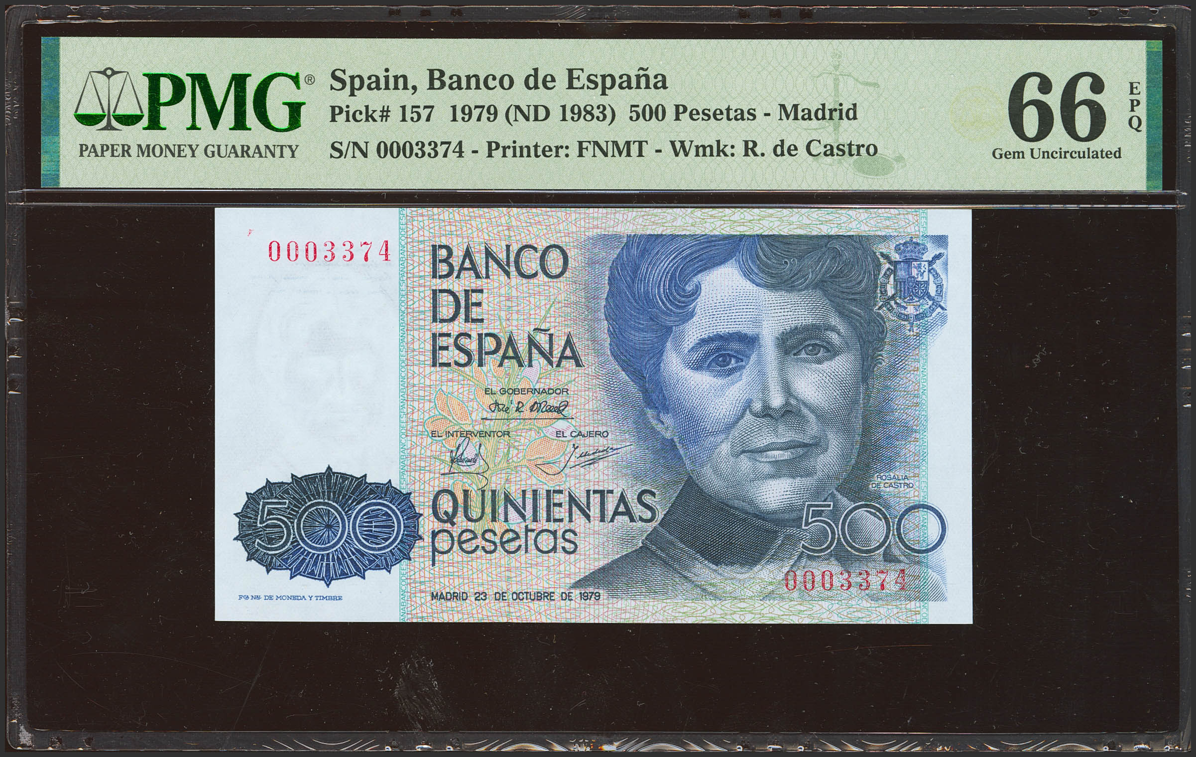 500 Pesetas. 23 de Octubre de 1979. Sin serie y numeración bajísima. (Edifil 2023: 476, Pick: 157). Inusual en esta calidad. SC. Encapsulado PMG66EPQ.