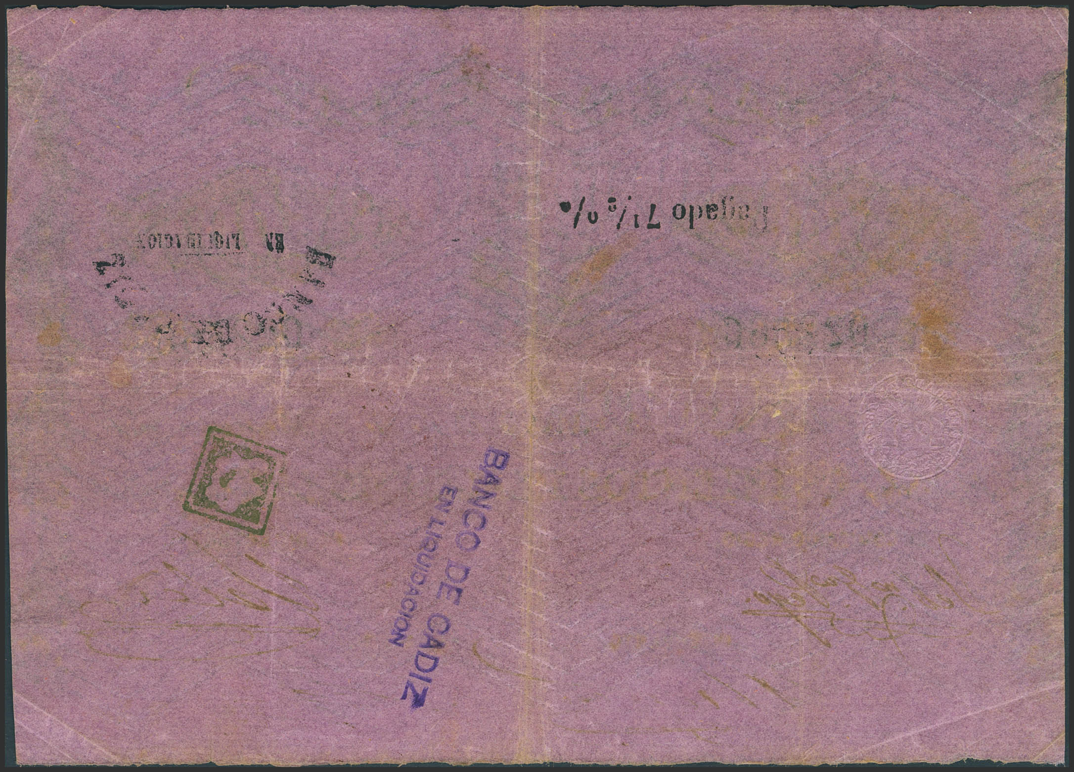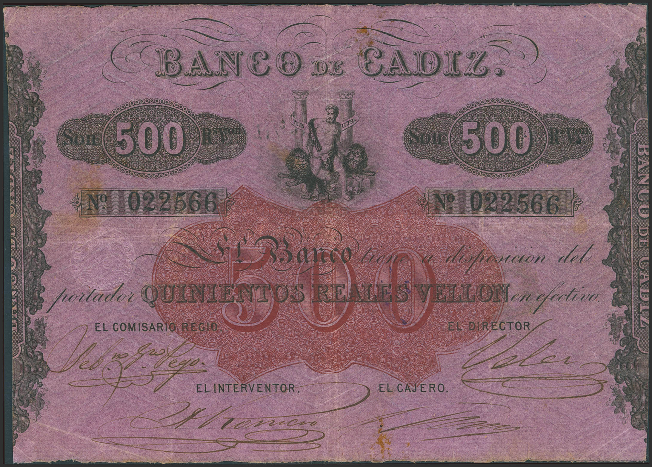 BANCO DE CADIZ. Emisión III. 500 Reales (sin fechar). Cuatro firmas y resello en seco. (Edifil 2023: 80). Raro. MBC+.
