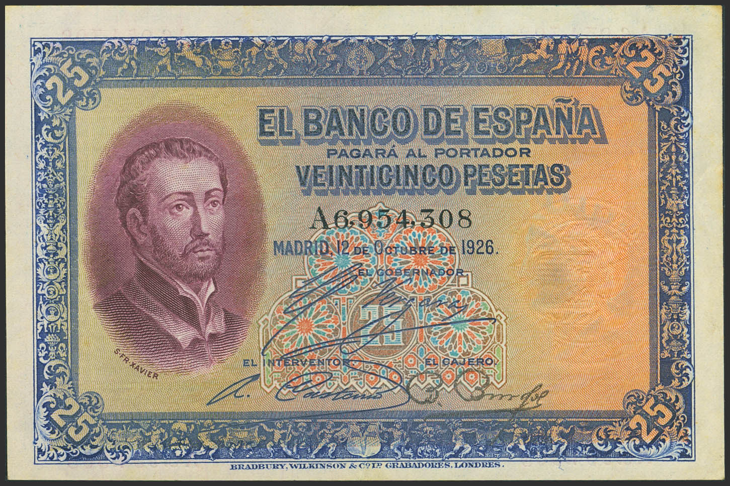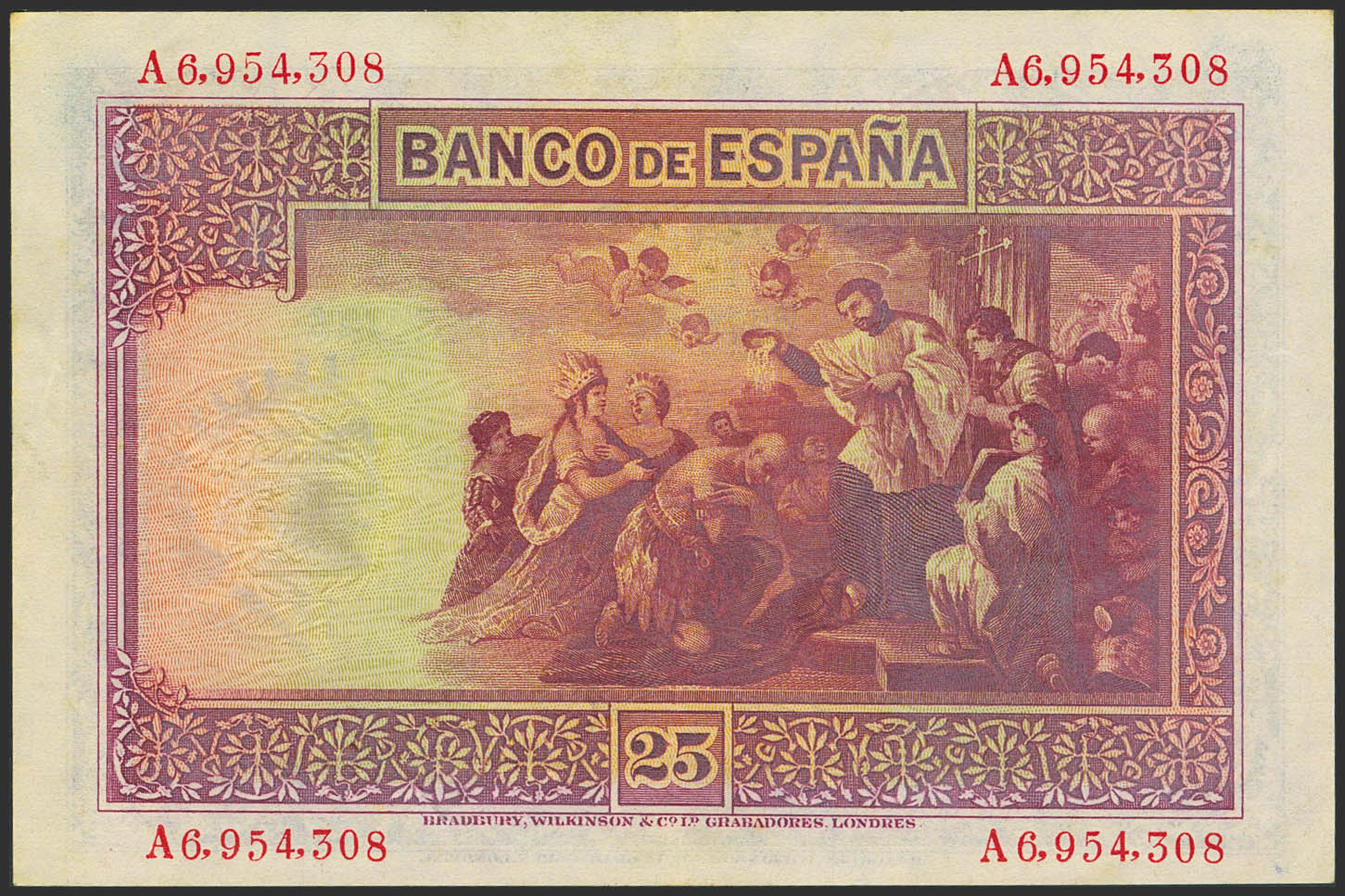 25 Pesetas. 12 de Octubre de 1926. Serie A y doble sello en seco GOBIERNO PROVISIONAL DE LA REPUBLICA / 14 ABRIL 1931 (sello a la derecha aplicado póstumamente). (Edifil 2021: 335). Inusual en esta calidad, conserva gran parte de su apresto original. EBC+.