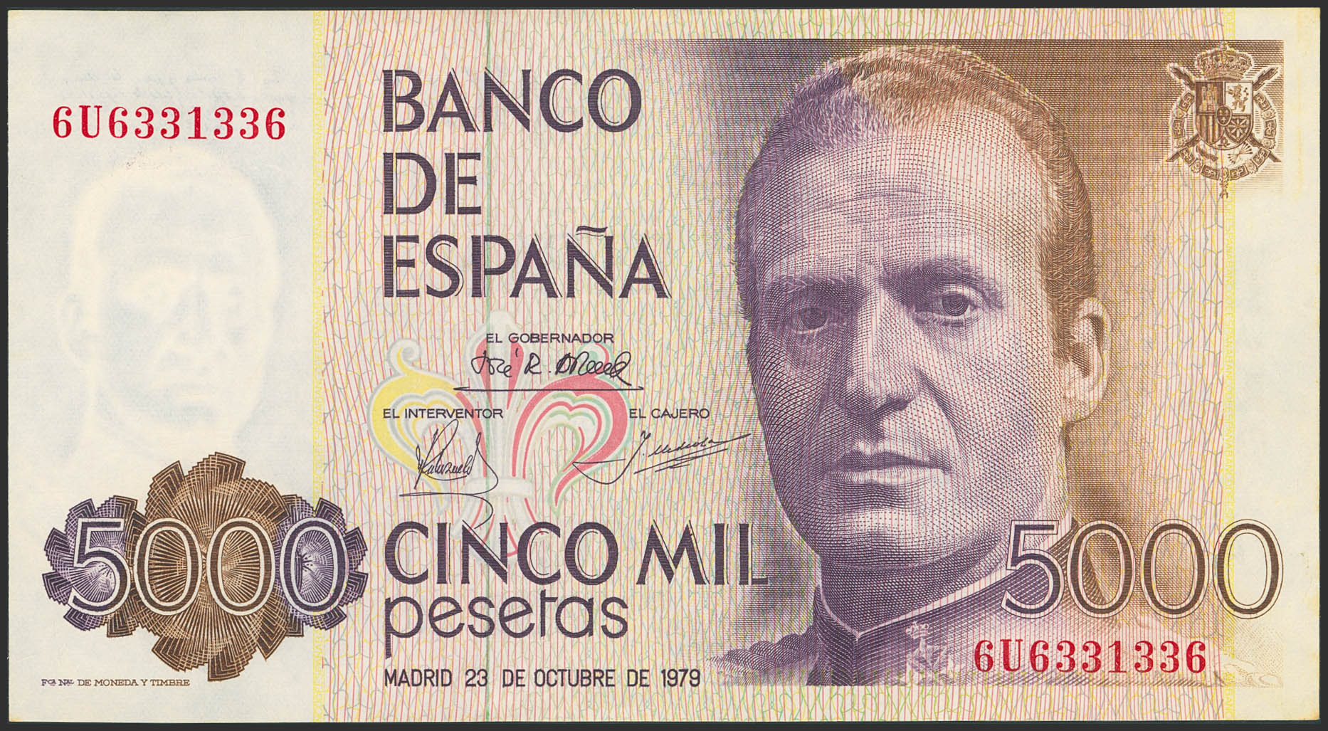 5000 Pesetas. 23 de Octubre de 1979. Serie 6U y numeración capicúa. (Edifil 2021: 478a). SC-.
