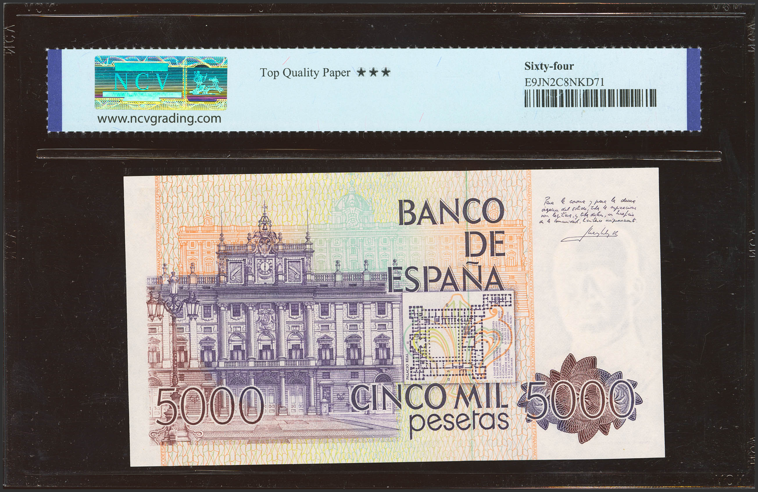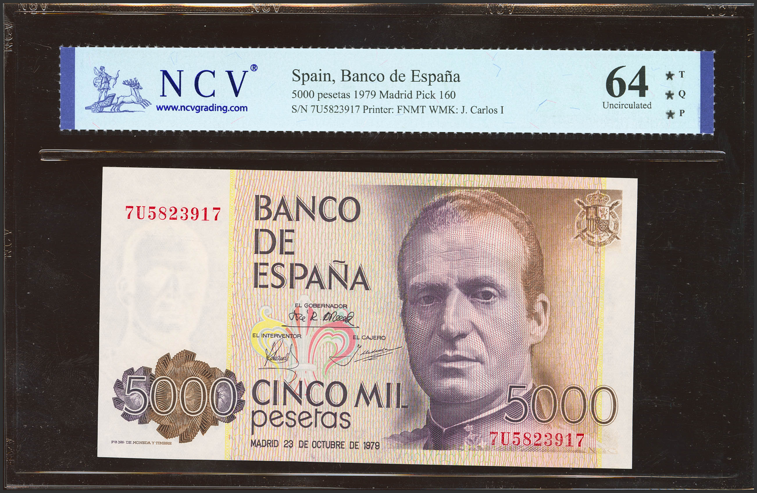 5000 Pesetas. 23 de Octubre de 1979. Serie 7U. (Edifil 2023: 478a, Pick: 160). SC. Encapsulado NCV64TQP.