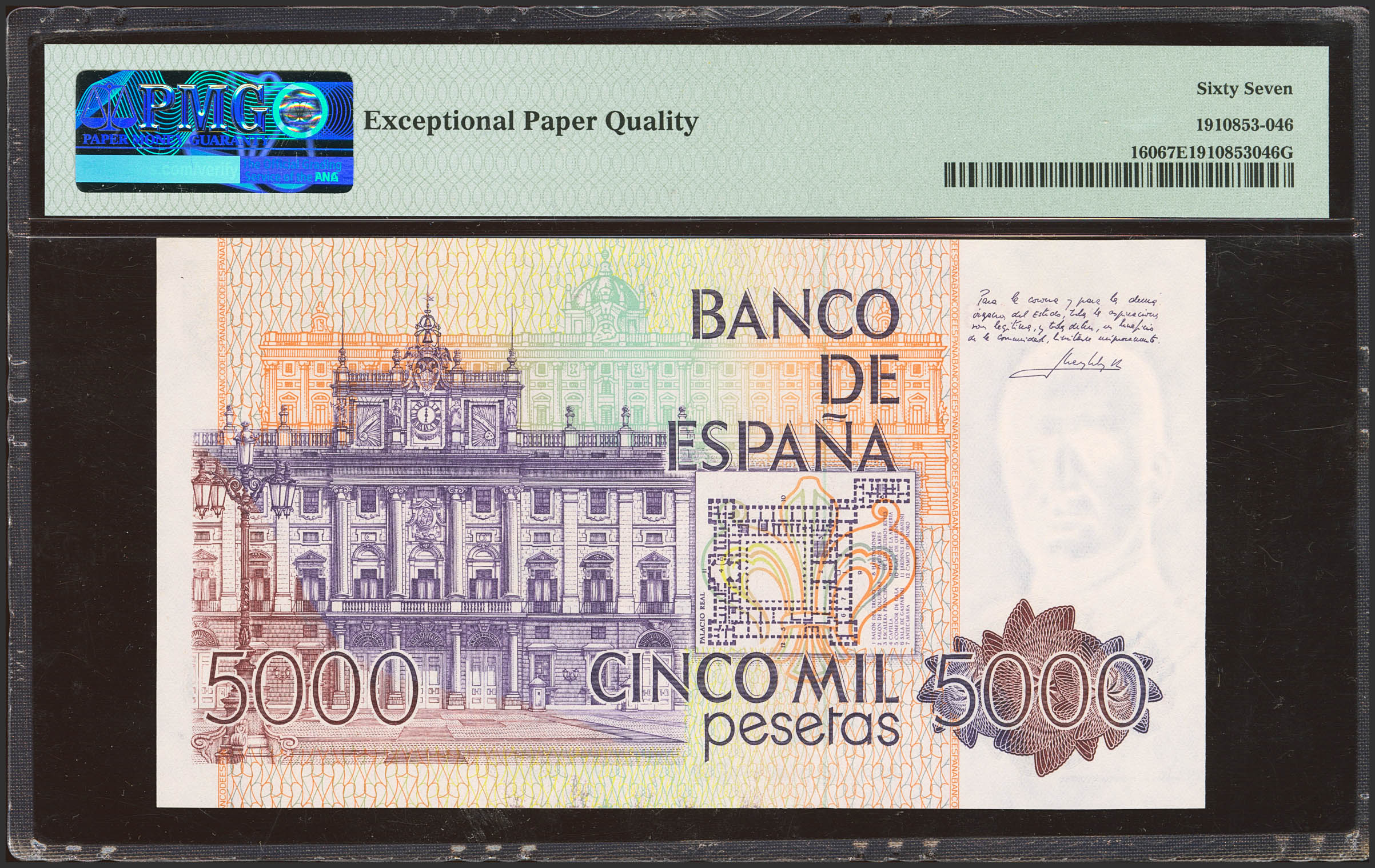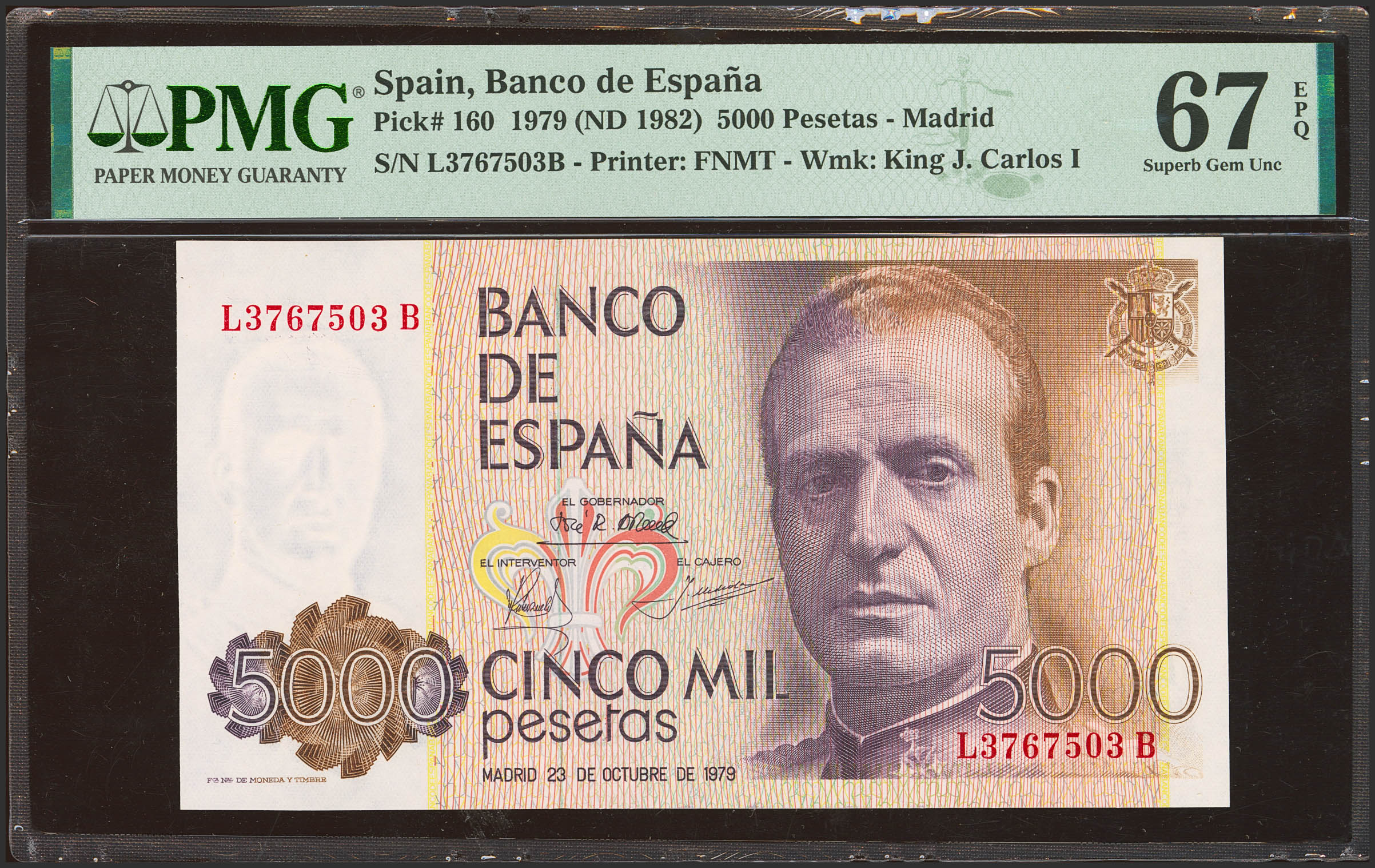 5000 Pesetas. 23 de Octubre de 1979. Serie L-B, última serie emitida. (Edifil 2023: 478aa, Pick: 160). Raro en esta excepcional calidad, apresto original. SC. Encapsulado PMG67EPQ.
