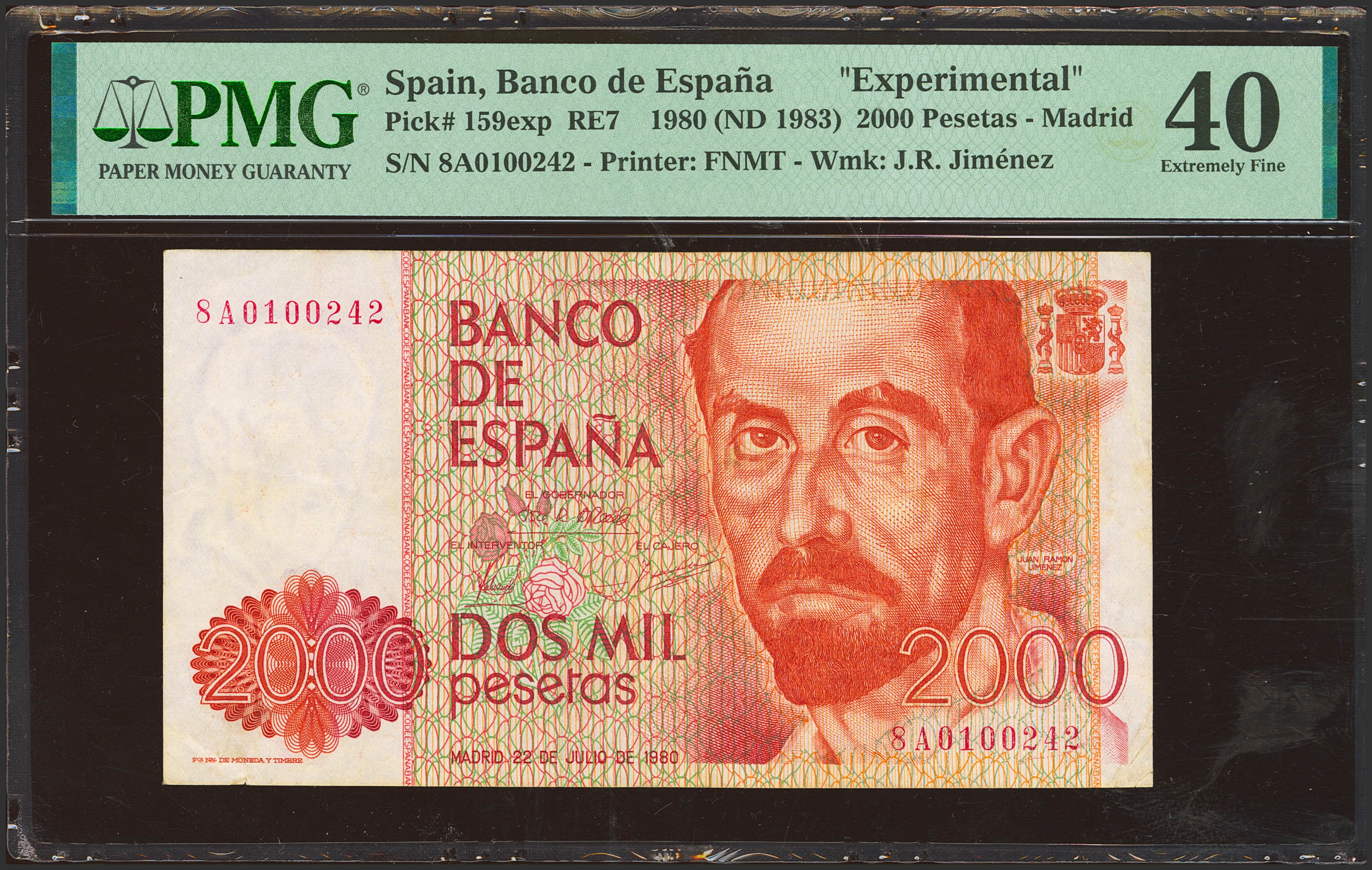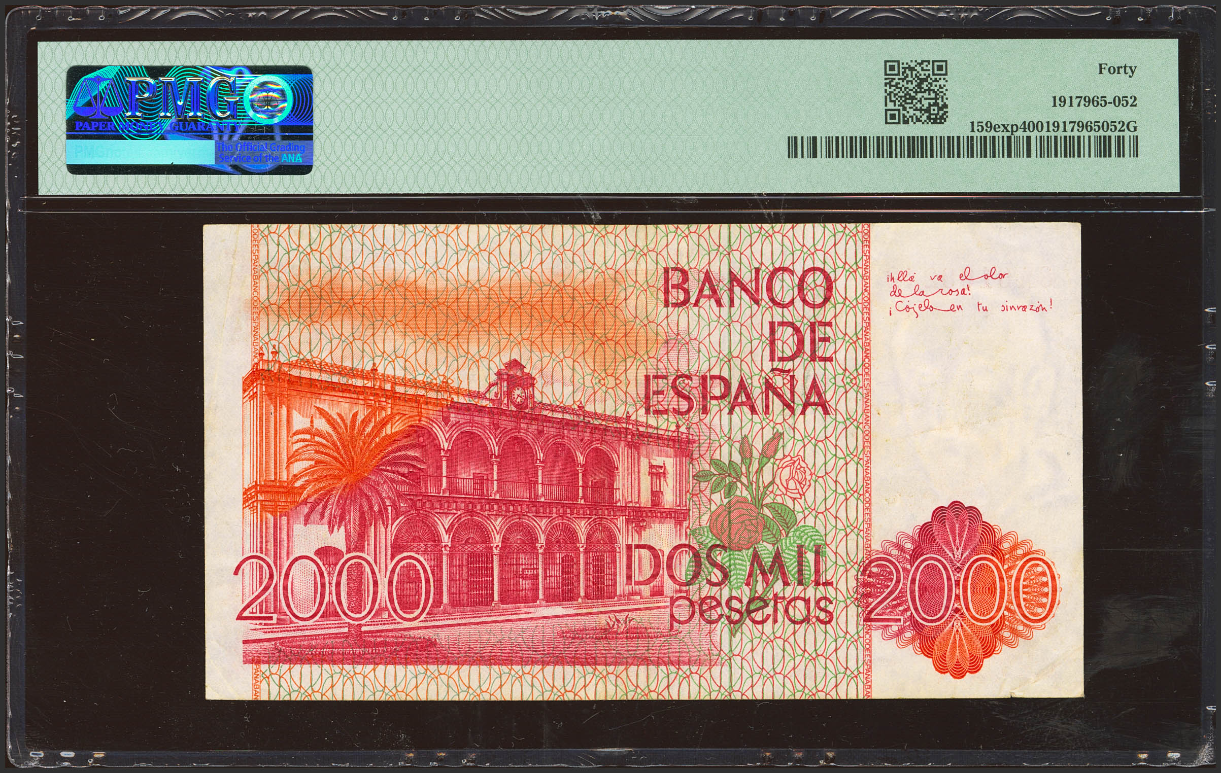 2000 Pesetas. 22 de Julio de 1980. Serie especial 8A. (Edifil 2021: 479c, Pick: 159exp). Extraordinariamente rara serie, para hacernos una idea de su rareza con la información estadística que disponemos nos atrevemos a afirmar que se trata, al menos, de una rareza tan importante como la serie 9B de Rosalía de Castro. EBC-. Encapsulado PMG40.