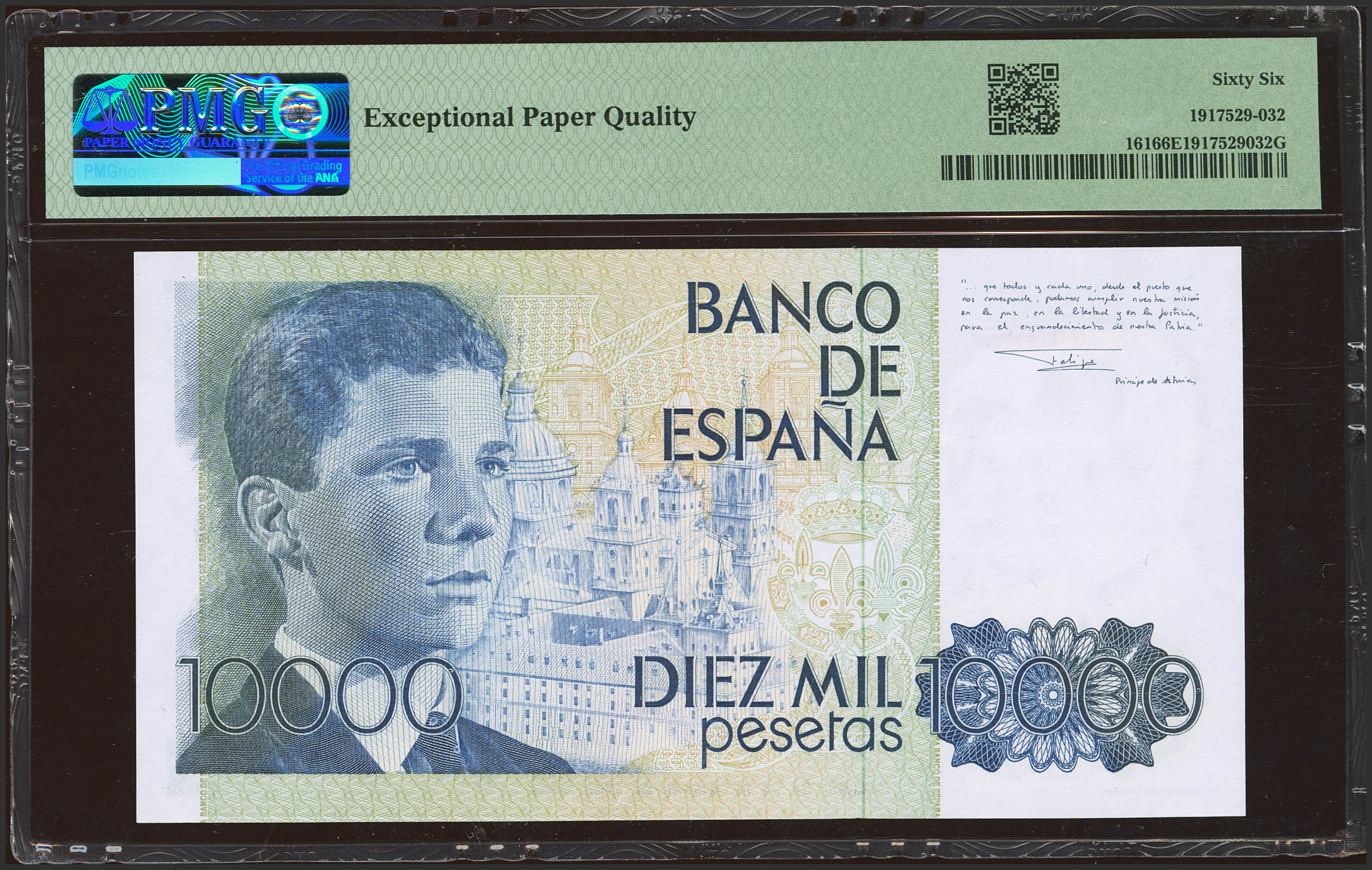 10000 Pesetas. 24 de Septiembre de 1985. Sin serie. (Edifil 2021: 481, Pick: 161). Inusual en esta excepcional calidad. SC. Encapsulado PMG66EPQ.